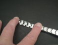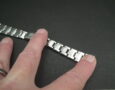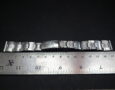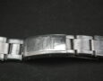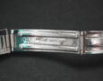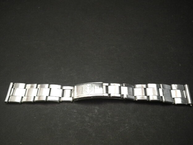 This example in 17mm at the lug and very rarely it’s the flexi-bracelet meaning each link has small springs that expand. We took this from a 1940’s Rolex Bubbleback and it’s in very good condition with surface scratching – the spring links are all perfect. There is a fairly engraving on the deployment clasp that’s not original. The deployment clasp is signed G F, Steelinox and Swiss Made. The total length is around 15cm.