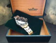 This example was sold in 1988 by Watches of Switzerland and the solid steel case is in unpolished condition (it will almost certainly have been polished in the past but not for 5 to 10 years) so does have scratches on the case side (I’m always happy to send high res. pictures and/or a What’s App video showing them). The original and untouched dial is in excellent condition and the batons have aged to an ivory colour. The original Rolex signed automatic movement is in excellent condition and our watchmaker has just serviced it. The bracelet end pieces have the correct references of 93160 and 592. The deployment reference on the watch has the reference ’04’ so is a later replacement (we guarantee it’s Rolex). We also have what we believe is the original bracelet which has the age reference letter or ‘G’ dating it to 1982 (Rolex didn’t sell quite as quickly as they do now….). Both bracelets show signs of wear and the end pieces from the original bracelet have been put on the newer bracelet. We have also got an extremely comprehensive history with this watch: