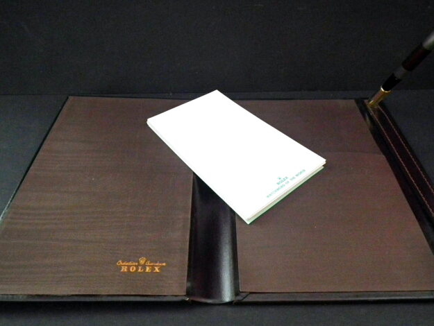 This would’ve come with a Rolex Day Date and it’s extremely rare to find complete due to having 2 genuine 16mm gold plated Rolex buckles (worth around £150). The note pad’s fairly complete, condition very good but the pen no longer works.