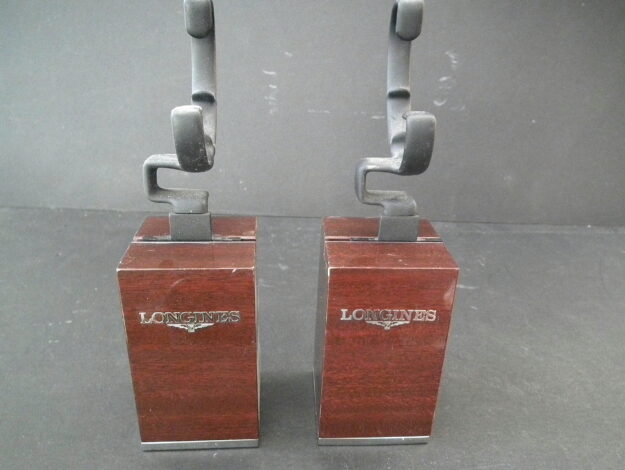 These are 2 watch stands as used in an authorised dealer. They’re in good condition with a few scratches and marks and slightly darker wood than the pictures. They measure 4.5cm squared and 8cm high before the watch stand. We’ve also got 2 other Longines stands in OK condition and they’re approximately 23cm long and 3.5cm wide.
