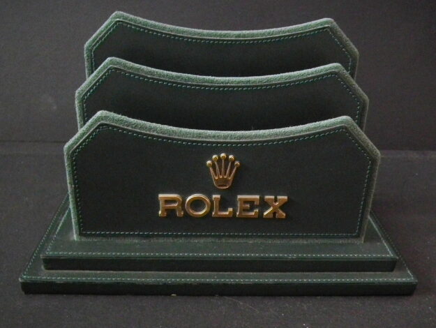 This is an extremely rare Rolex magazine stand from one of the AD’s. It’s heavy and covered in green leatherette and felt and in excellent condition. It measures 21.5cm across, 11.2 deep and 13.5cm high.