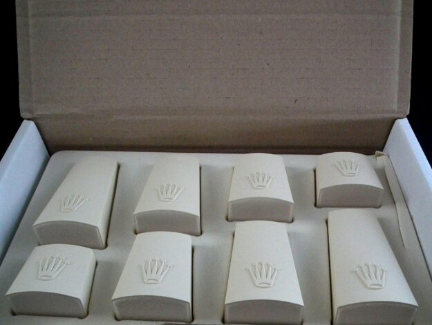 This is a genuine set of Rolex stands made of stone with plastic clips (the clip box has 10 spaces but there are only 8 clips – one for each stand). There are 4 sizes of stand. In view of the weight we will charge £25 postage on this item