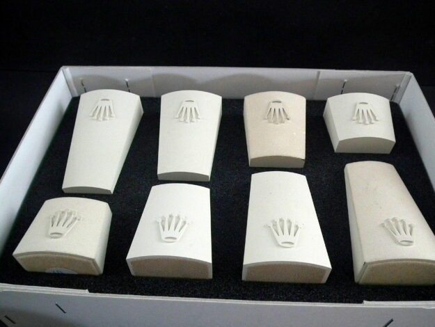 This is a genuine set of Rolex stands made of stone with plastic clips (the clip box has 10 spaces but there are only 8 clips – one for each stand). There are 4 sizes of stand. In view of the weight we will charge £25 postage on this item