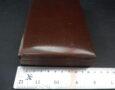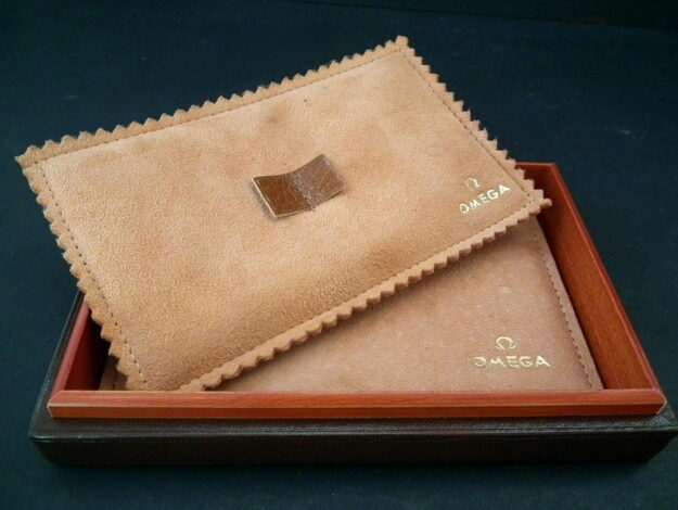 We bought this with a number of Omega accessories and can’t be sure of the exact use. It’s a wooden box with leather coating and the inside has a suede cushion. It measures 15,5cm across, 10.2cm deep and 2.7cm high and it’s in excellent condition.