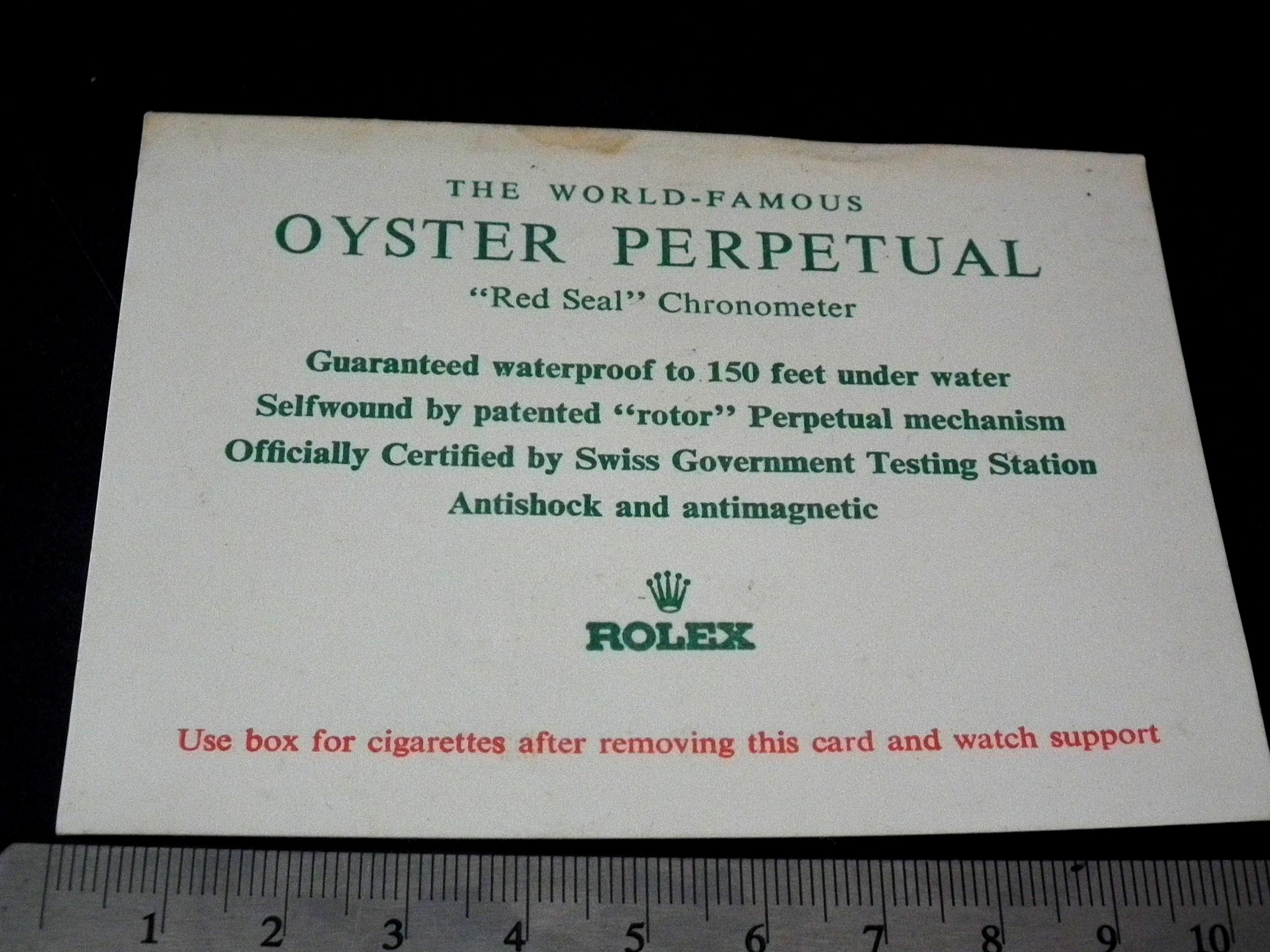 This is a very rare ‘cigarette’ card that came with a Rolex watch in the 60’s and 70’s. It measures 10.5cm across and 8cm high