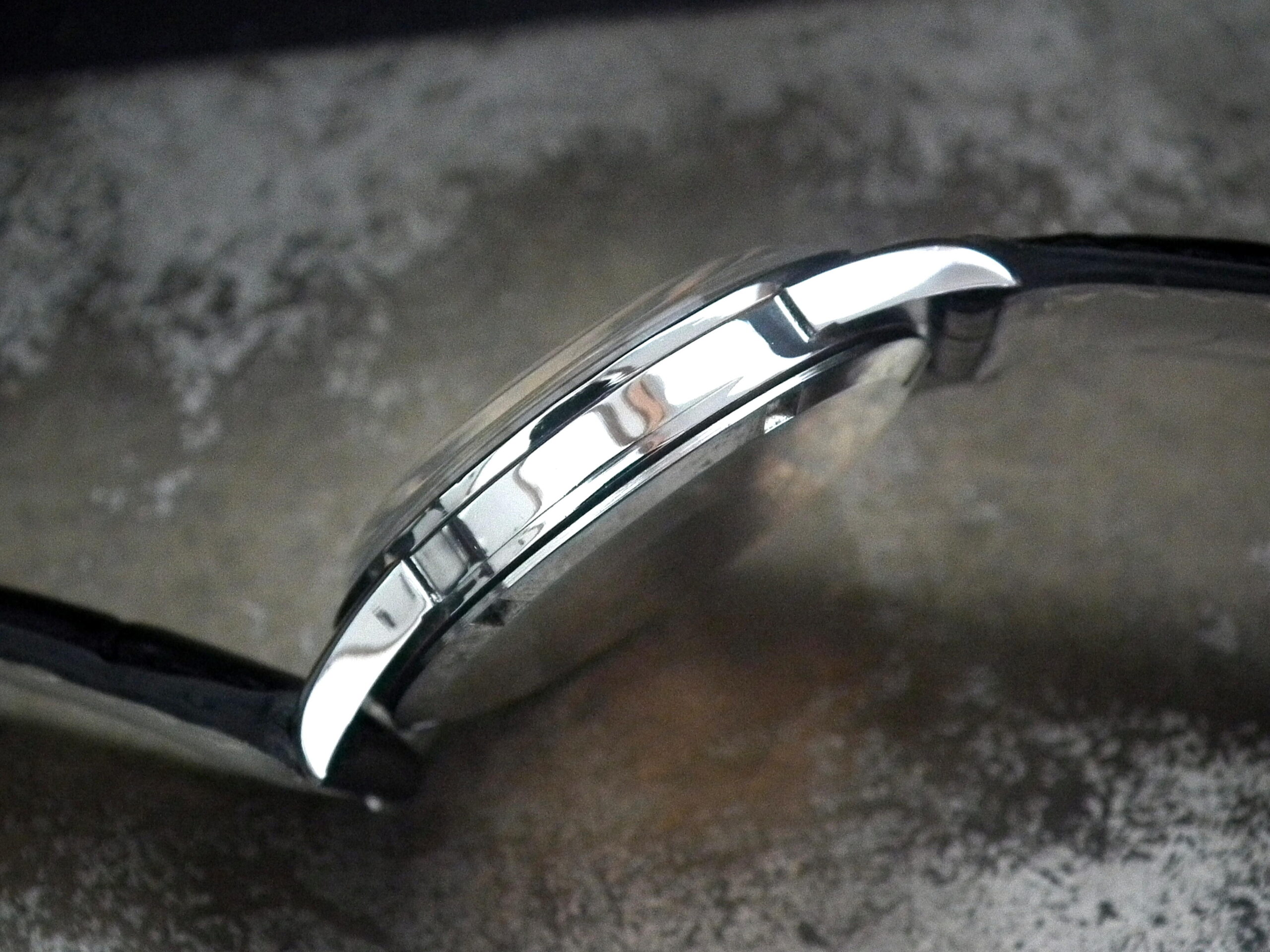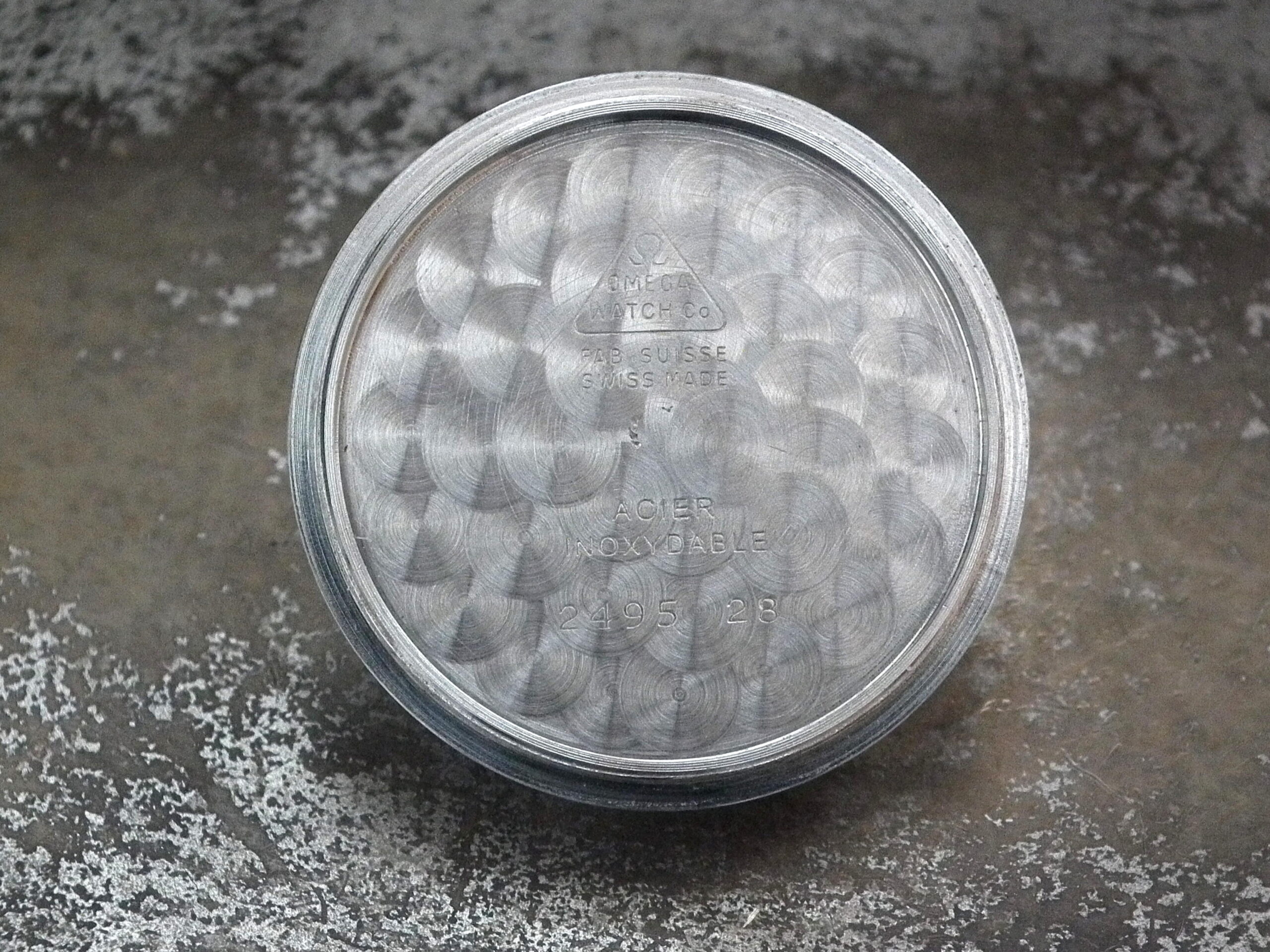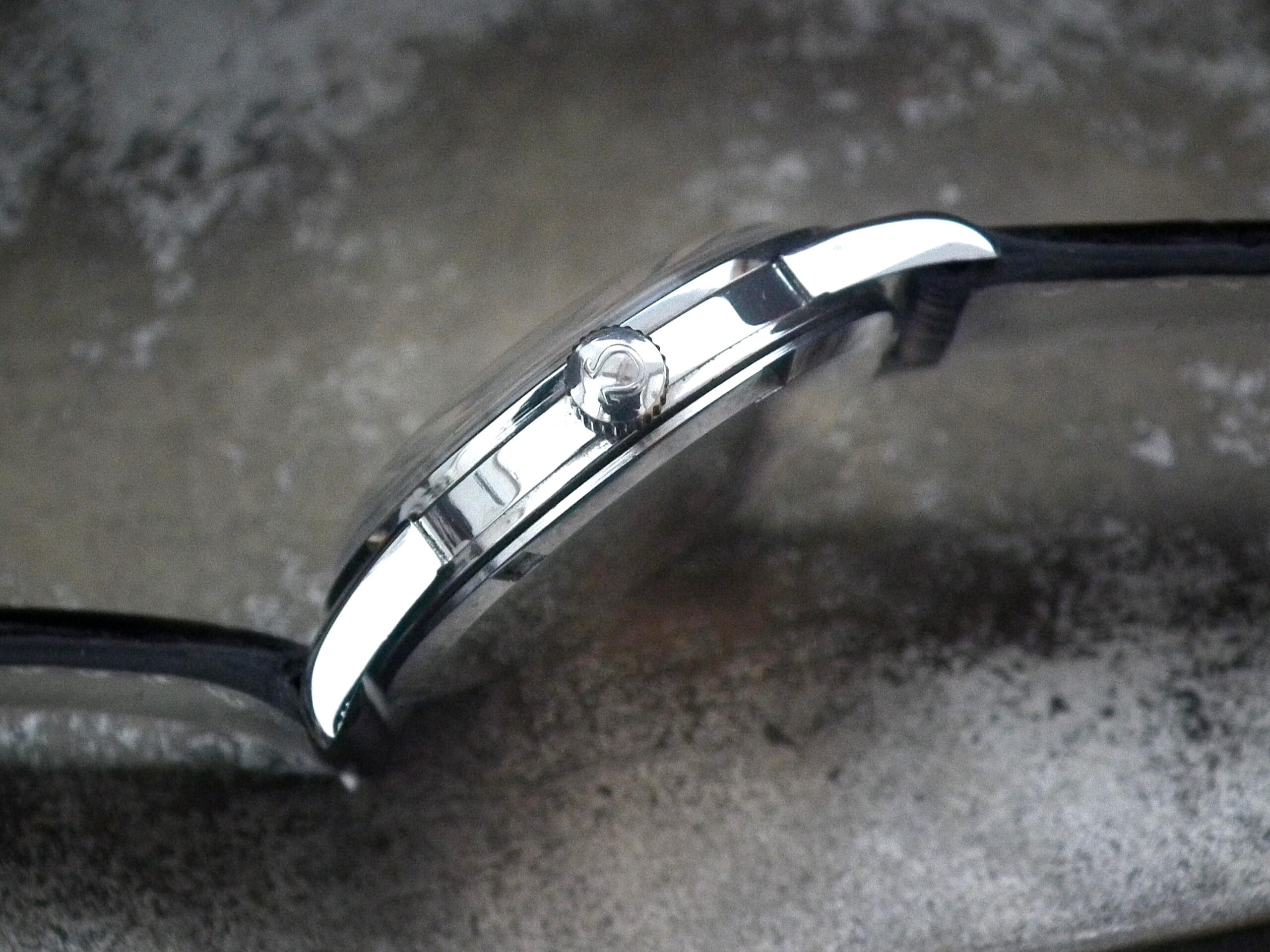 We bought a package of watches many years ago and this is one that we didn’t retail. The steel case, movement and dial are in good condition but the Omega signed crown falls out and isn’t connected to the movement. The case measures 34mm across excluding the crown and 43mm long including the lugs.