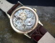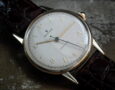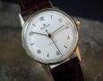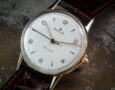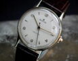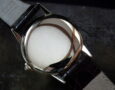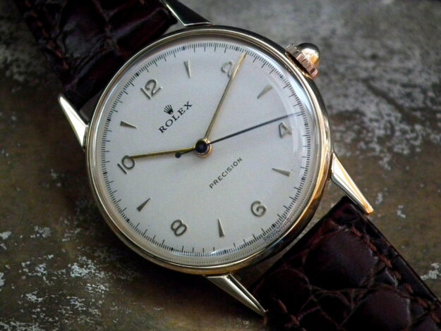 This is a simply beautiful example of the Rolex Precision from the 1950’s – Swiss Hallmarks, unlike British Hallmarks don’t have an age letter so we’re unable to give an exact year. The solid 9ct gold Rolex signed case is in excellent condition with only the most minor signs of wear – please note the extremely rare ‘thimble’ winding crown. The original Rolex signed ivory/cream dial has been professionally refinished to the highest possible standards and is on of the most sought after in the range. The alternating Arabic and spear-head hour batons, gold hands and railway line style minute markers combine to create one of the most beautiful dials in the range. The very high grade Rolex signed manual wind movement is again in excellent condition and has just been fully serviced by our professional watchmaker. To complete this piece we’ve added a new, high quality, dark brown Hirsch croco-grain leather strap with gold plated Hirsch buckle.