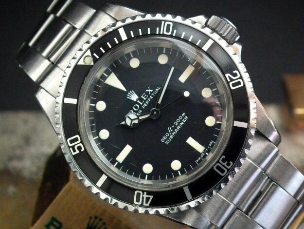 If Rolex are known for one watch it would be the Submariner and the 5513 is probably the most famous. Introduced in 1962, it ran through to 1990 and was the original ‘Tool’ watch. This 5513 was made in 1971/3 (serial 3.83million) and sold in 1976. The steel case is in excellent condition with only minor signs of surface scratching and wear (I have done a WhatsApp video if required). The original Rolex signed dial is in excellent condition and is classically 5513 – matt with painted hour batons (the hands, whilst Rolex, are newer than the watch). The very high grade Rolex signed automatic movement is again in excellent condition and is being serviced by our watchmaker as I write this introduction. The watch sits on a genuine Rolex ‘light’ bracelet with the references ‘S P11’ dating it to 1994 which suggests it’s a Rolex service bracelet. It also has the reference of 9315 on the deployment and one of the end pieces which dates it to around 1976. The bracelet is in good overall condition with sag and has 12 links. Very rarely we also the original Rolex guarantee paperwork showing the watch was sold in the UK in 1976. We also have the correct Rolex box – we bought the watch with the box so can’t guarantee it’s original to the watch but is period correct.
