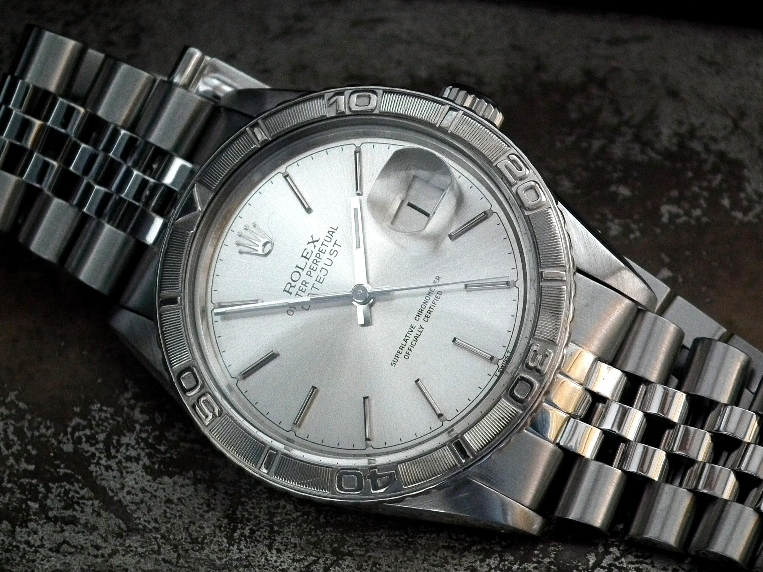 This is a collector standard example of the iconic Rolex Datejust Turn-O-Graph watch from 1979. First introduced in 1953, the rotating bezel. It was adopted by the Thunderbird Squadron in the USA and still carries the name ‘Thunderbird Bezel’. It was added to the Datejust in the early 1960’s as an option alongside the fluted and smooth bezels. All that’s great but to be frank it just looks fabulous.