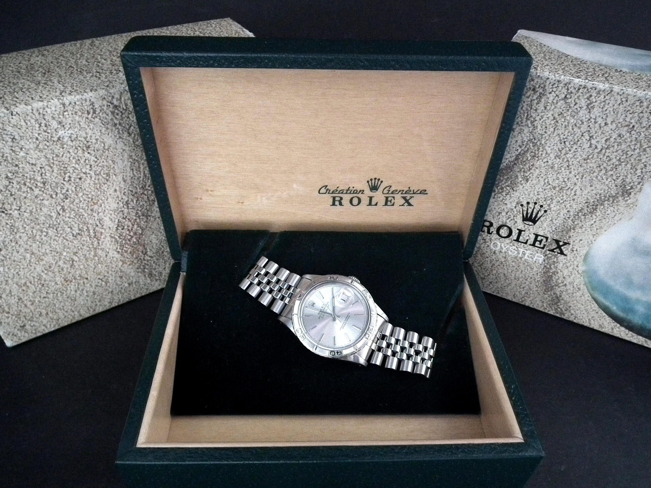Very rarely (as few as 1 in 50 of this age) we also have the original Rolex punched papers, Rolex wallet (with the correct serial number) and the original Rolex boxes, inner and outer, with the 162507 sticker on the side.