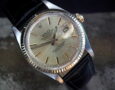 This is a beautiful example of the iconic Rolex Datejust from 1978. The steel and solid yellow gold (fluted bezel) is in overall very good condition (some pitting on the case back). The Rolex signed champagne pearlescent dial is again in very good condition with only a small mark between the 6 and 7 baton. The very high grade chronometer standard Rolex signed automatic is in excellent condition and has just been fully serviced by our professional watchmaker. The watch sits on a super high quality black Hirsch ‘London’ alligator strap with a Hirsch gold plated buckle.
