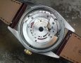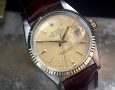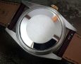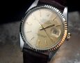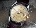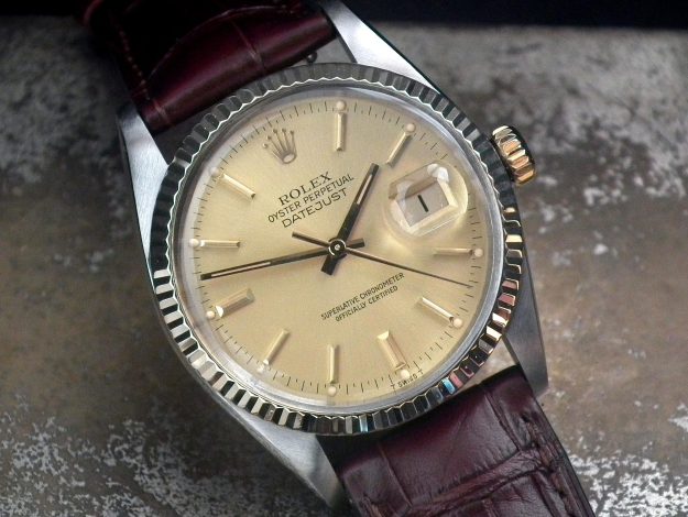 This is a beautiful example of iconic Rolex Datejust from 1982 and it’s also the quick date set model allowing the date to be changed without turning the hands round the dial twice. The steel and solid gold (fluted bezel) case is in near faultless condition with only the most minor signs of wear. The original Rolex signed champagne pearlescent dial is again in excellent condition. The very high grade Rolex signed ‘chronometer’ standard automatic movement is also in excellent condition and has just been fully serviced by our professional watchmaker. The watch sits on a new, super high quality, dark brown Hirsch ‘London’ alligator strap with Hirsch gold plated buckle.