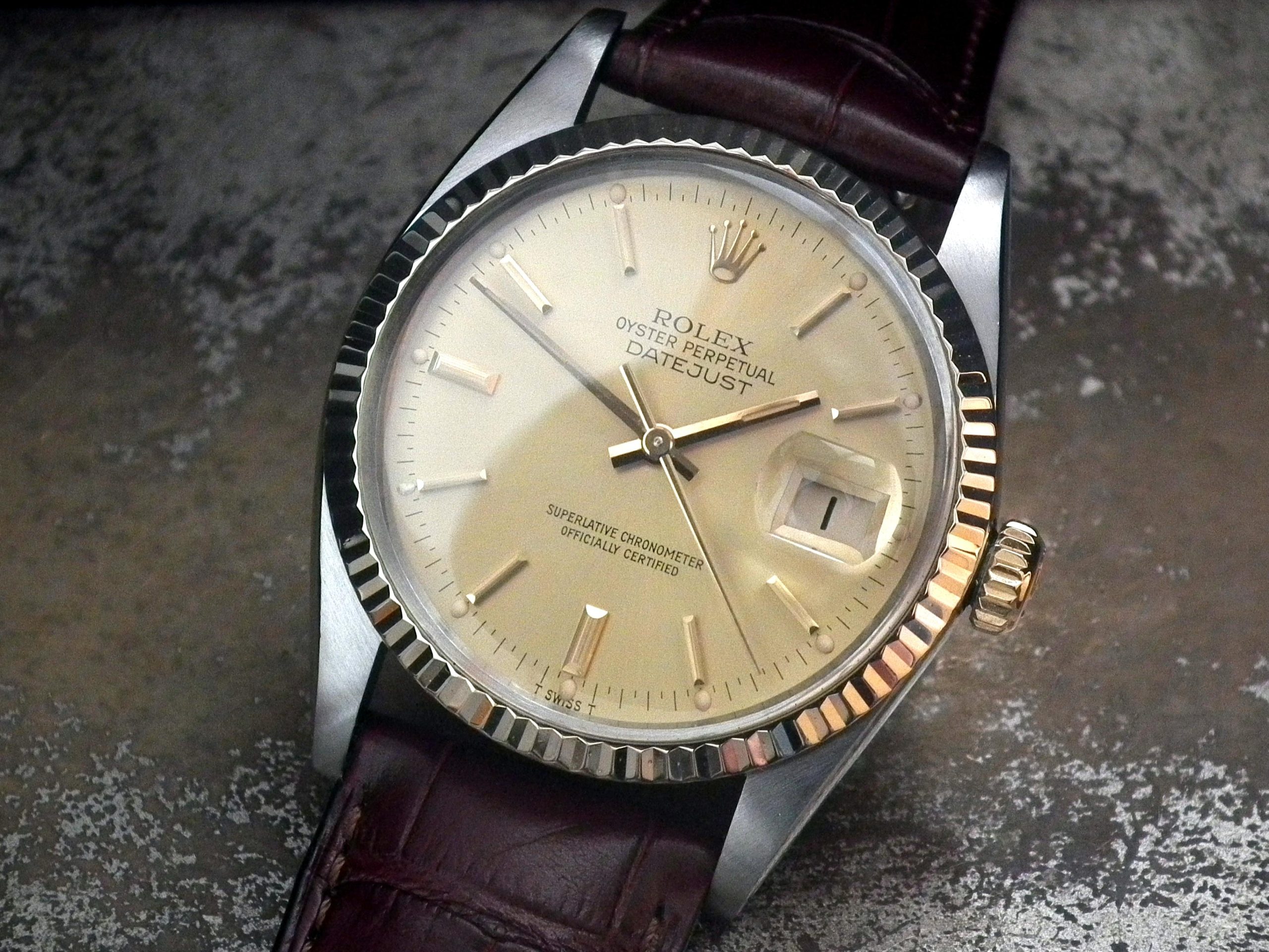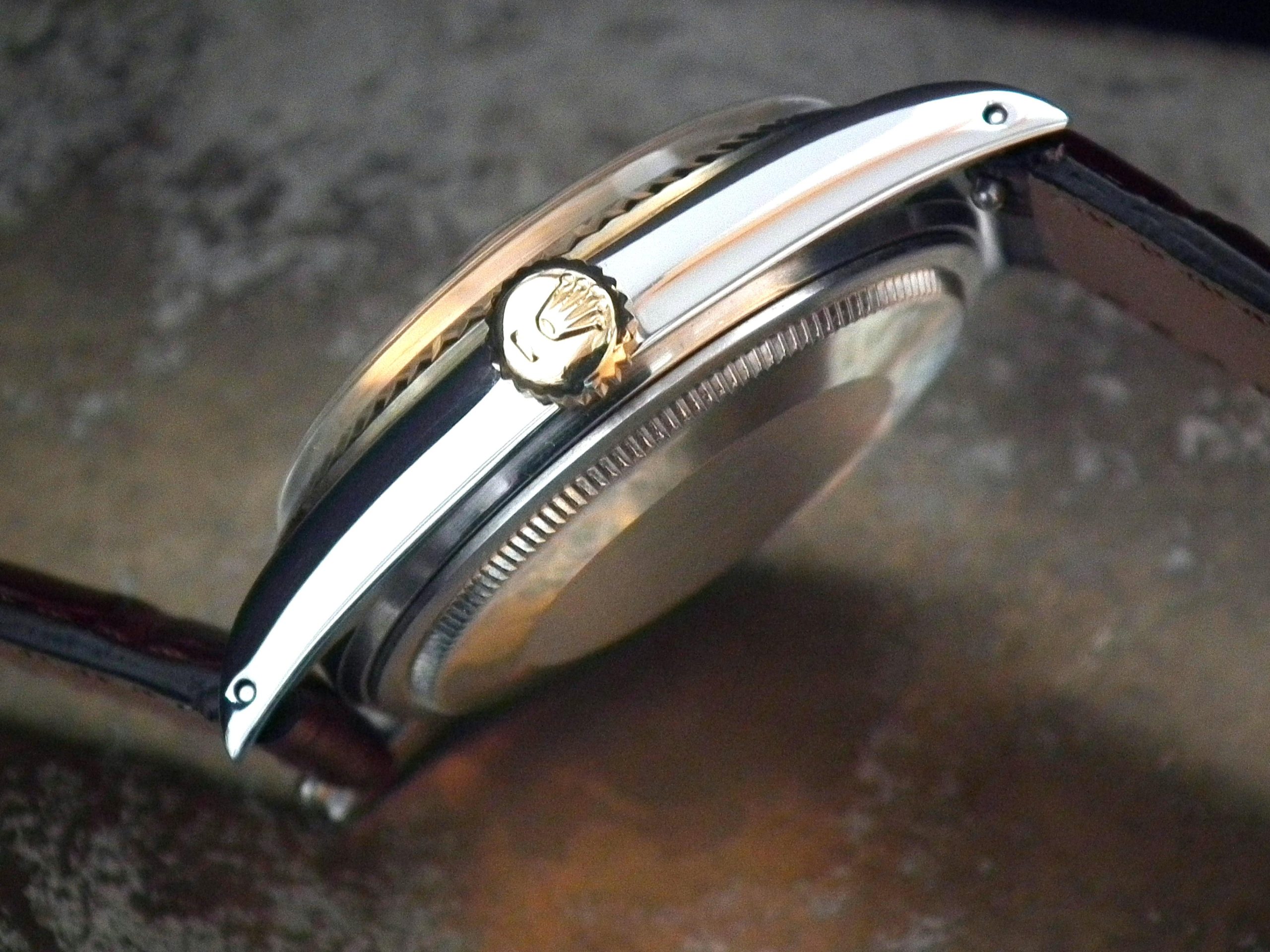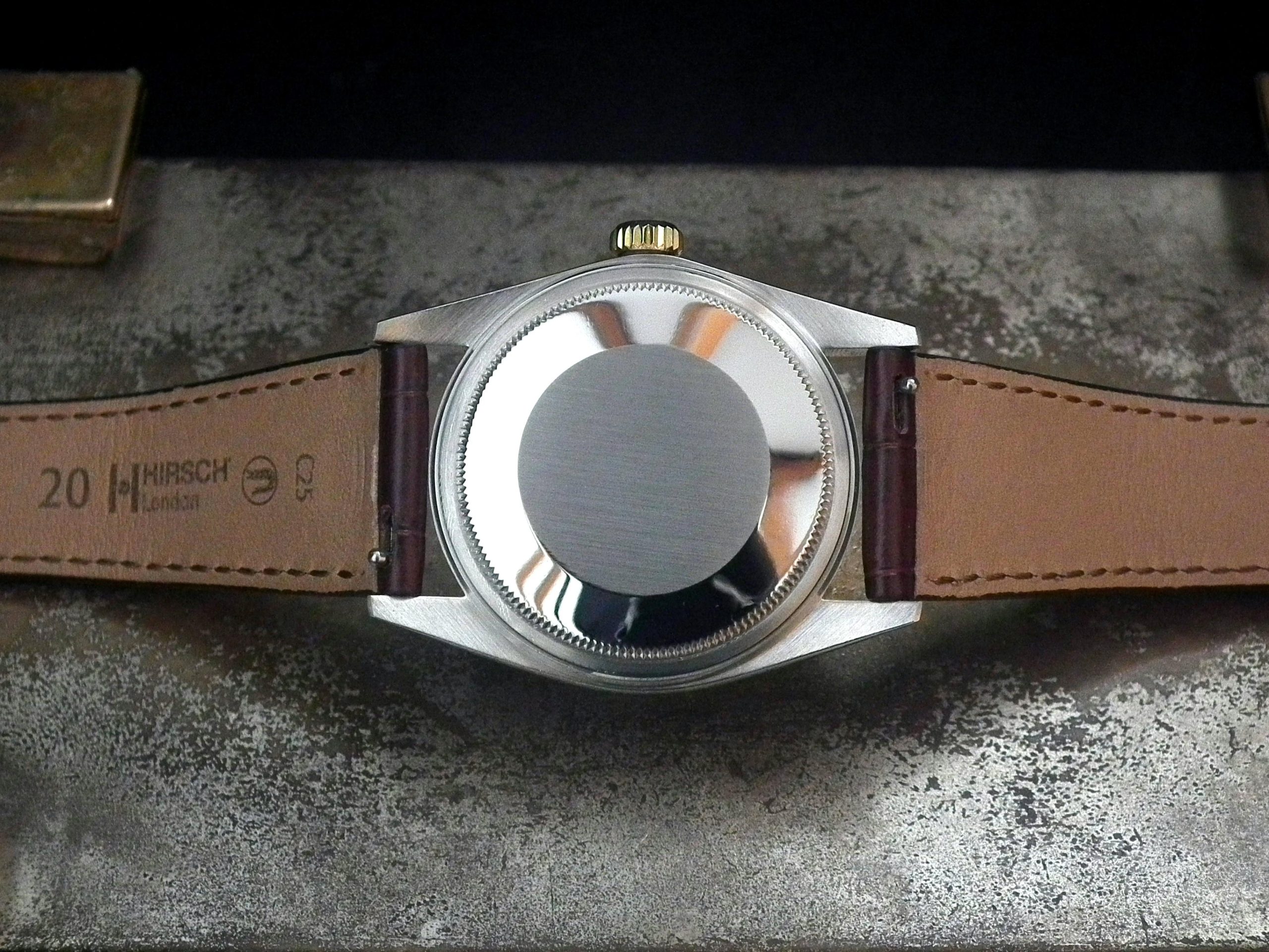 This is a beautiful example of iconic Rolex Datejust from 1982 and it’s also the quick date set model allowing the date to be changed without turning the hands round the dial twice. The steel and solid gold (fluted bezel) case is in near faultless condition with only the most minor signs of wear. The original Rolex signed champagne pearlescent dial is again in excellent condition. The very high grade Rolex signed ‘chronometer’ standard automatic movement is also in excellent condition and has just been fully serviced by our professional watchmaker. The watch sits on a new, super high quality, dark brown Hirsch ‘London’ alligator strap with Hirsch gold plated buckle.