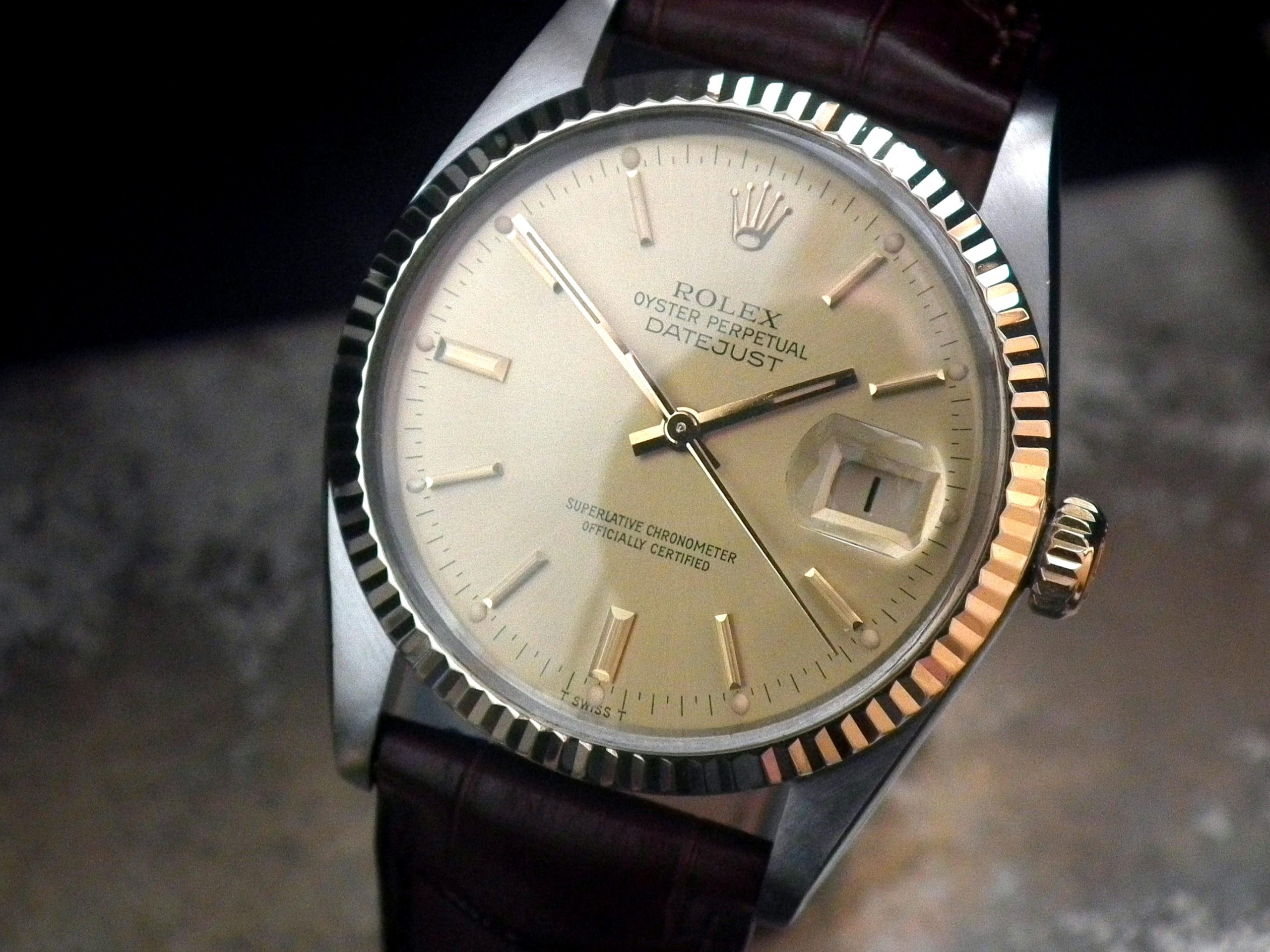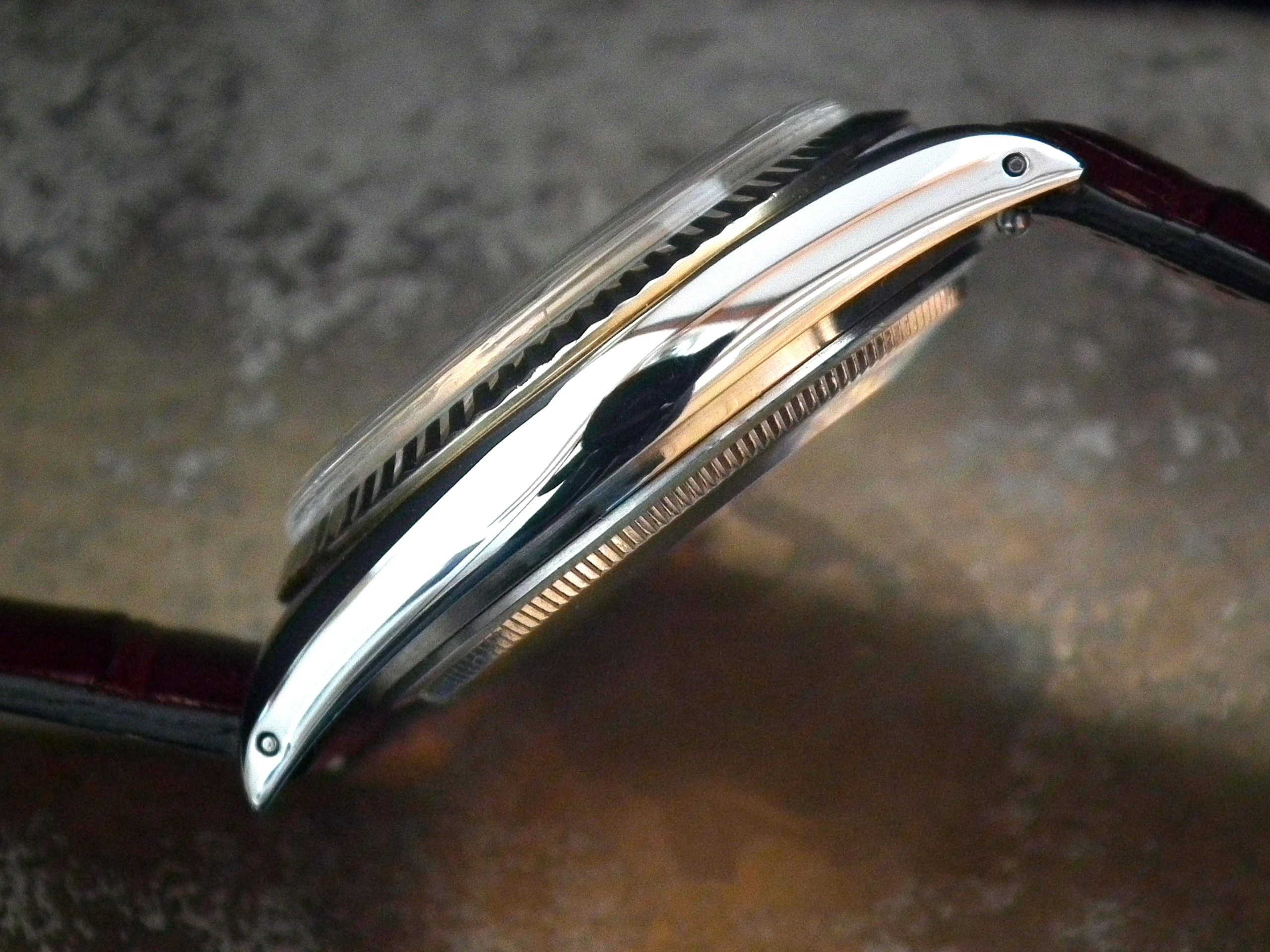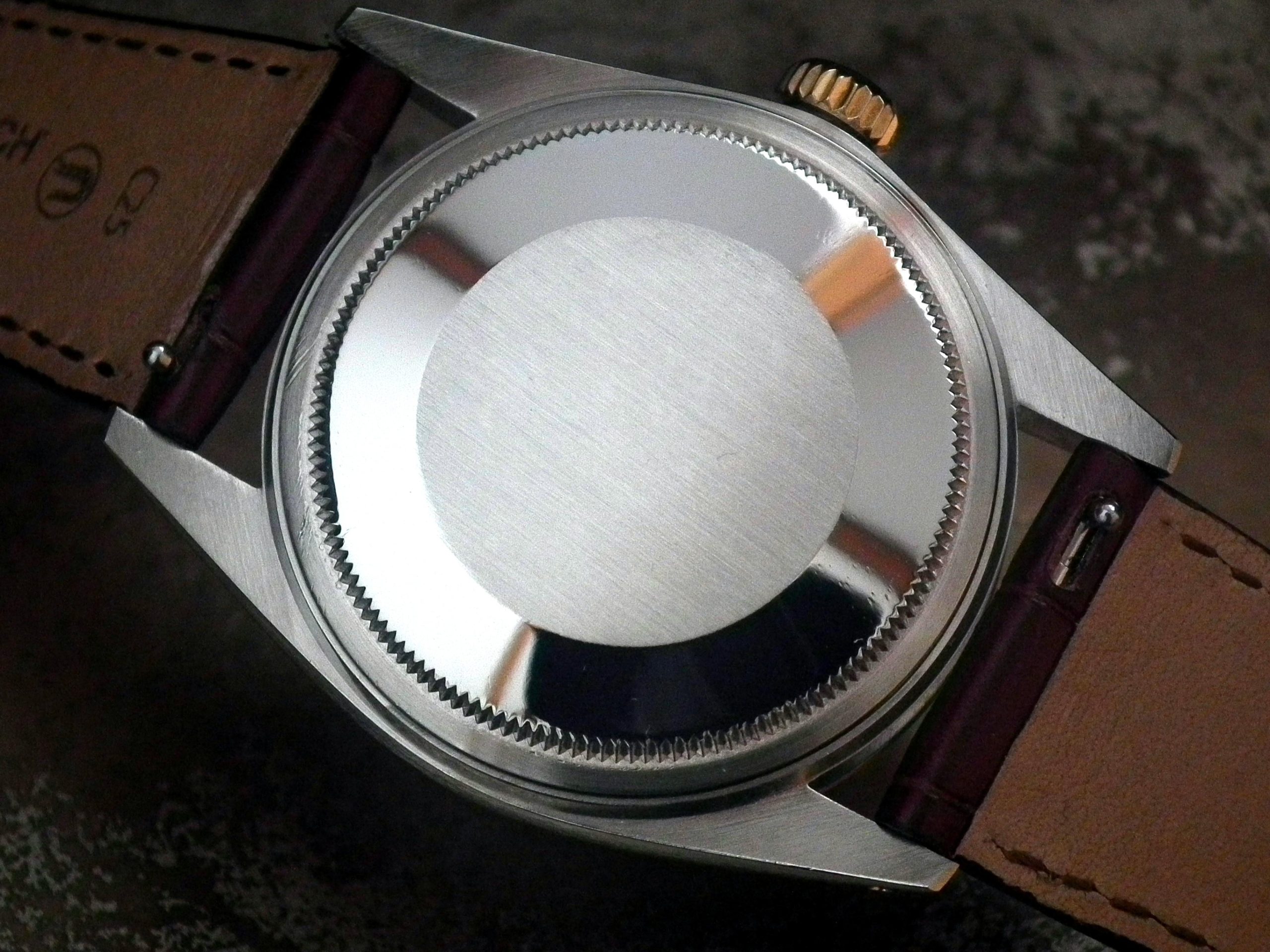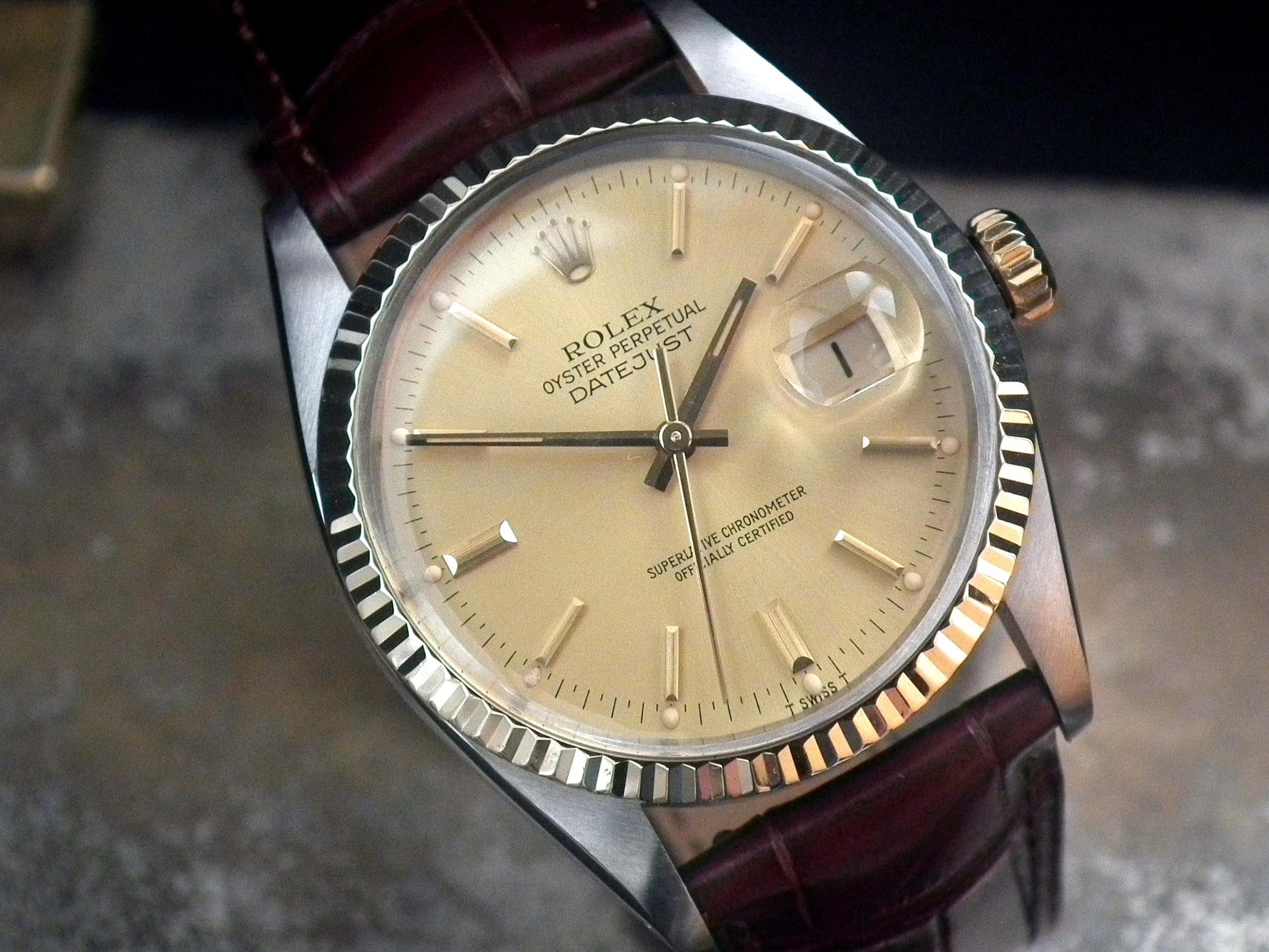 This is a beautiful example of iconic Rolex Datejust from 1982 and it’s also the quick date set model allowing the date to be changed without turning the hands round the dial twice. The steel and solid gold (fluted bezel) case is in near faultless condition with only the most minor signs of wear. The original Rolex signed champagne pearlescent dial is again in excellent condition. The very high grade Rolex signed ‘chronometer’ standard automatic movement is also in excellent condition and has just been fully serviced by our professional watchmaker. The watch sits on a new, super high quality, dark brown Hirsch ‘London’ alligator strap with Hirsch gold plated buckle.