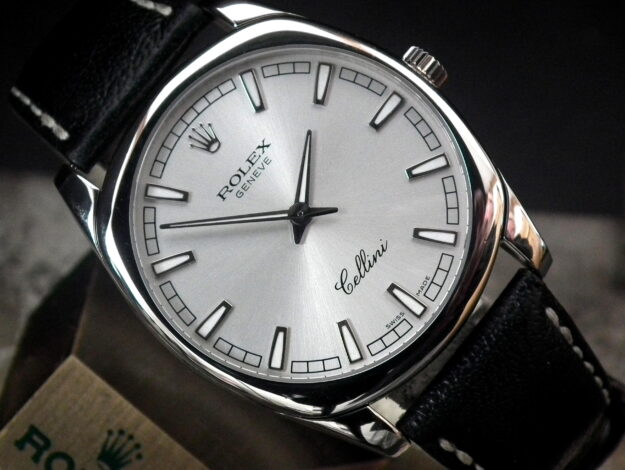 This is a simply beautiful watch. The solid 18ct white gold case is in near faultless condition and the very high grade manual wind Rolex signed movement has just been fully serviced by Steven Hale. The original steel pearlescent dial with white enamel applied hour batons and match hands is wonderfully understated and matches the large (38mm) and slim case. The watch sits on a lightly used but genuine black Rolex leather strap with a solid 18ct white gold Rolex signed deployment clasp. The Cellini is designed to be an everyday watch from the office through to dinner.