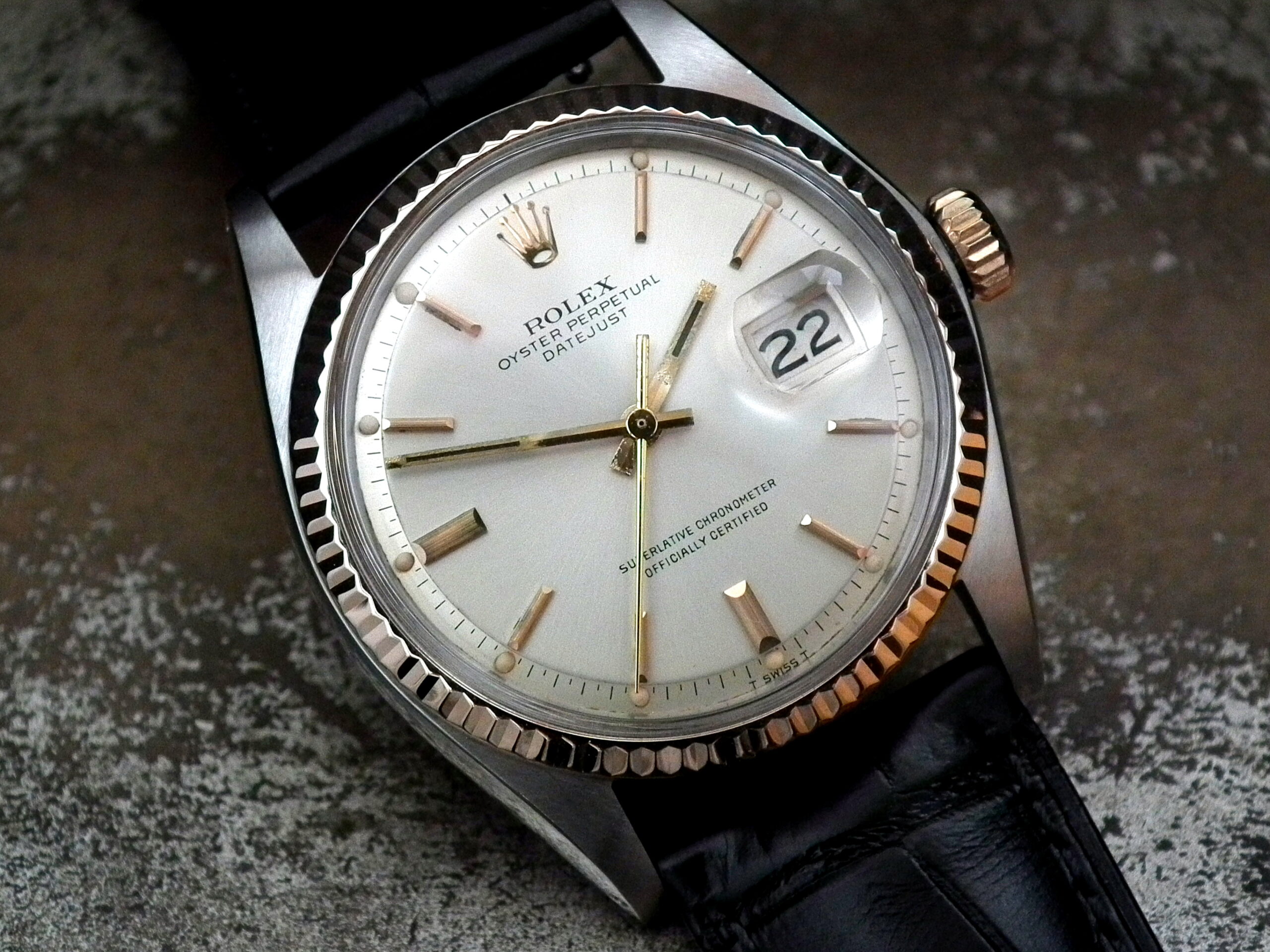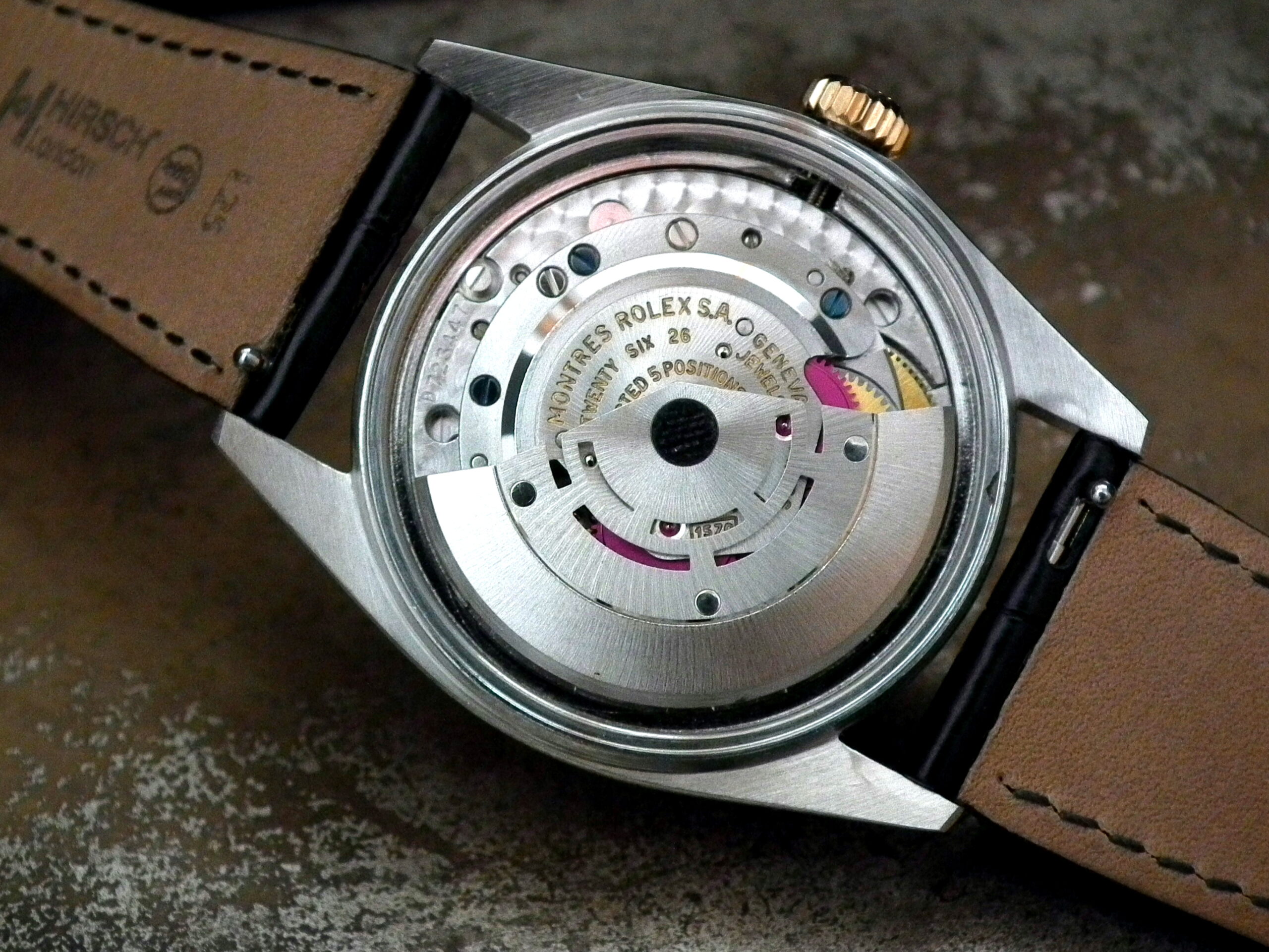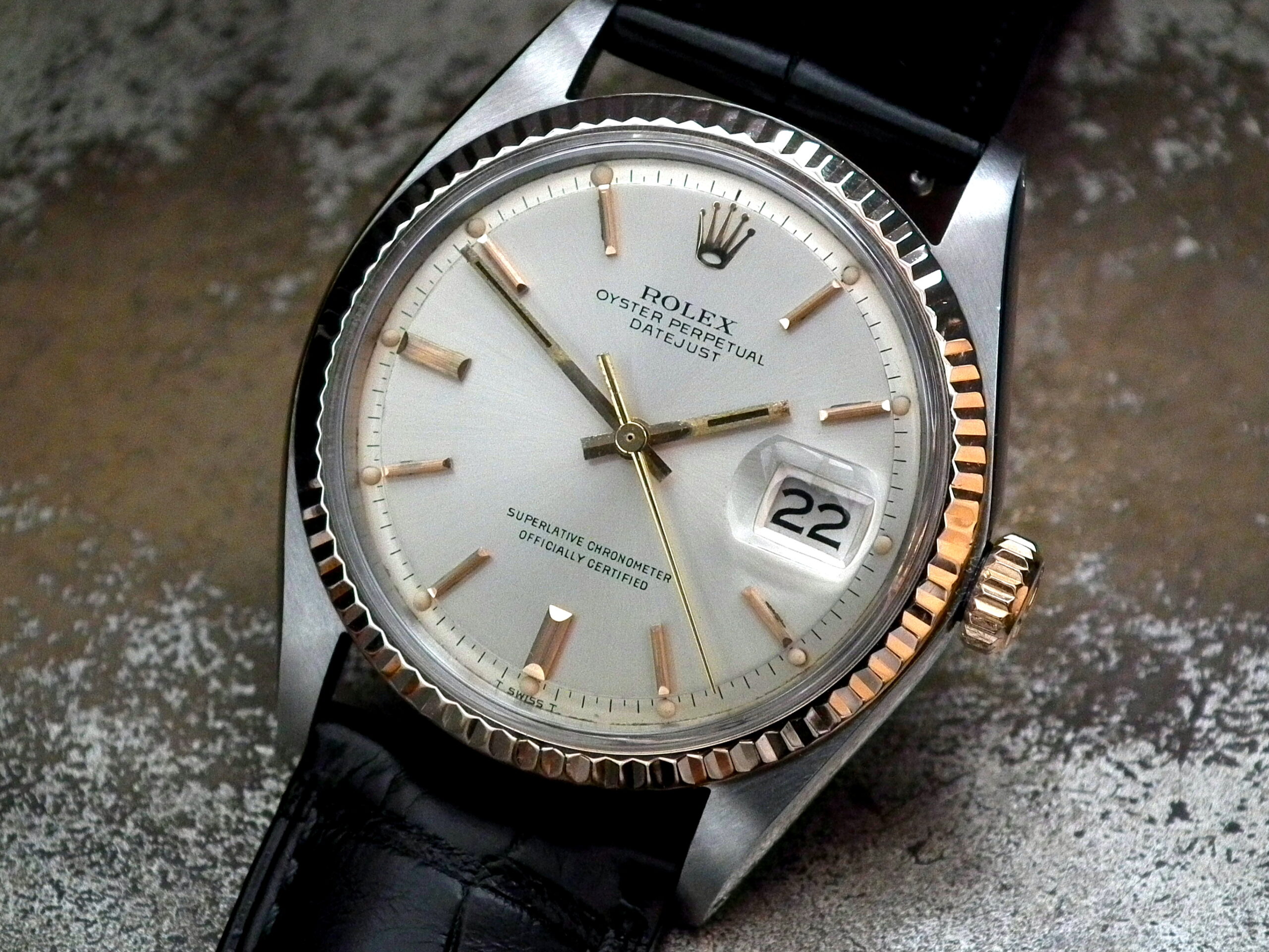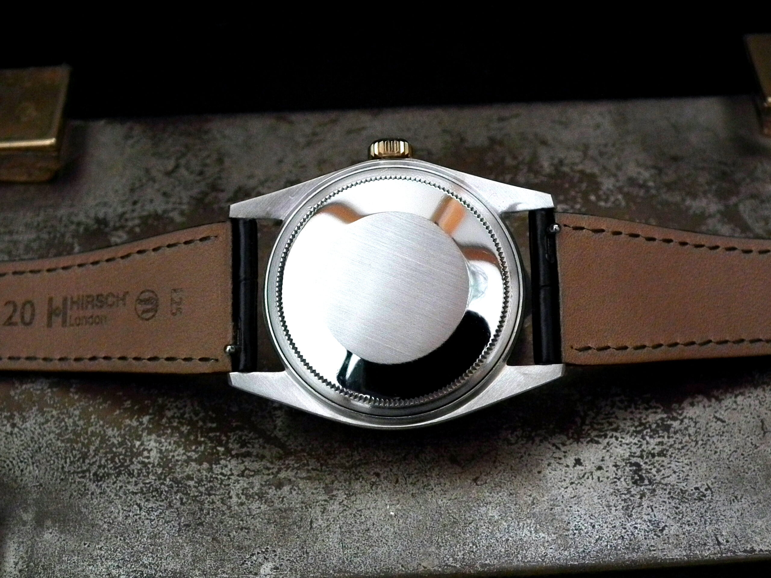 This is a beautiful example of the iconic Rolex Datejust from 1970. The steel and solid rose gold (fluted bezel) case is in excellent condition with only the most minor signs of wear. The original steel pearlescent dial is again in very good condition with only a few minor signs of wear around a couple of the batons and outer edge – I’ve highlighted the batons and it’s hard to see with the naked eye. The applied rose gold hour batons and hands give the softest contrast to the dial and are perfectly framed by the solid rose gold fluted bezel. Always happy to send high resolution pictures of a wrist video. The super high grade Rolex signed chronometer standard movement is again in excellent condition and has just been fully serviced by our professional watchmaker. To complete this amazing watch we’ve added a new, super high quality, black Hirsch ‘London’ alligator strap with non-Rolex rose gold plated buckle.