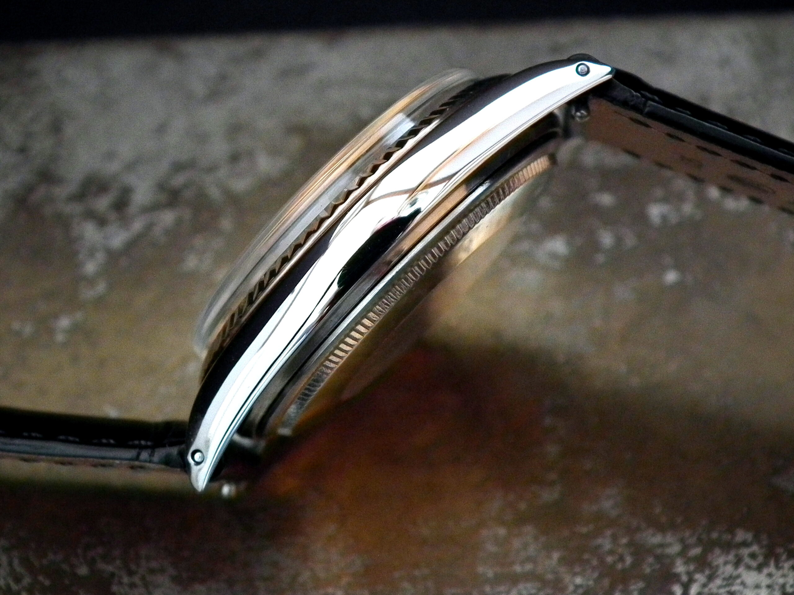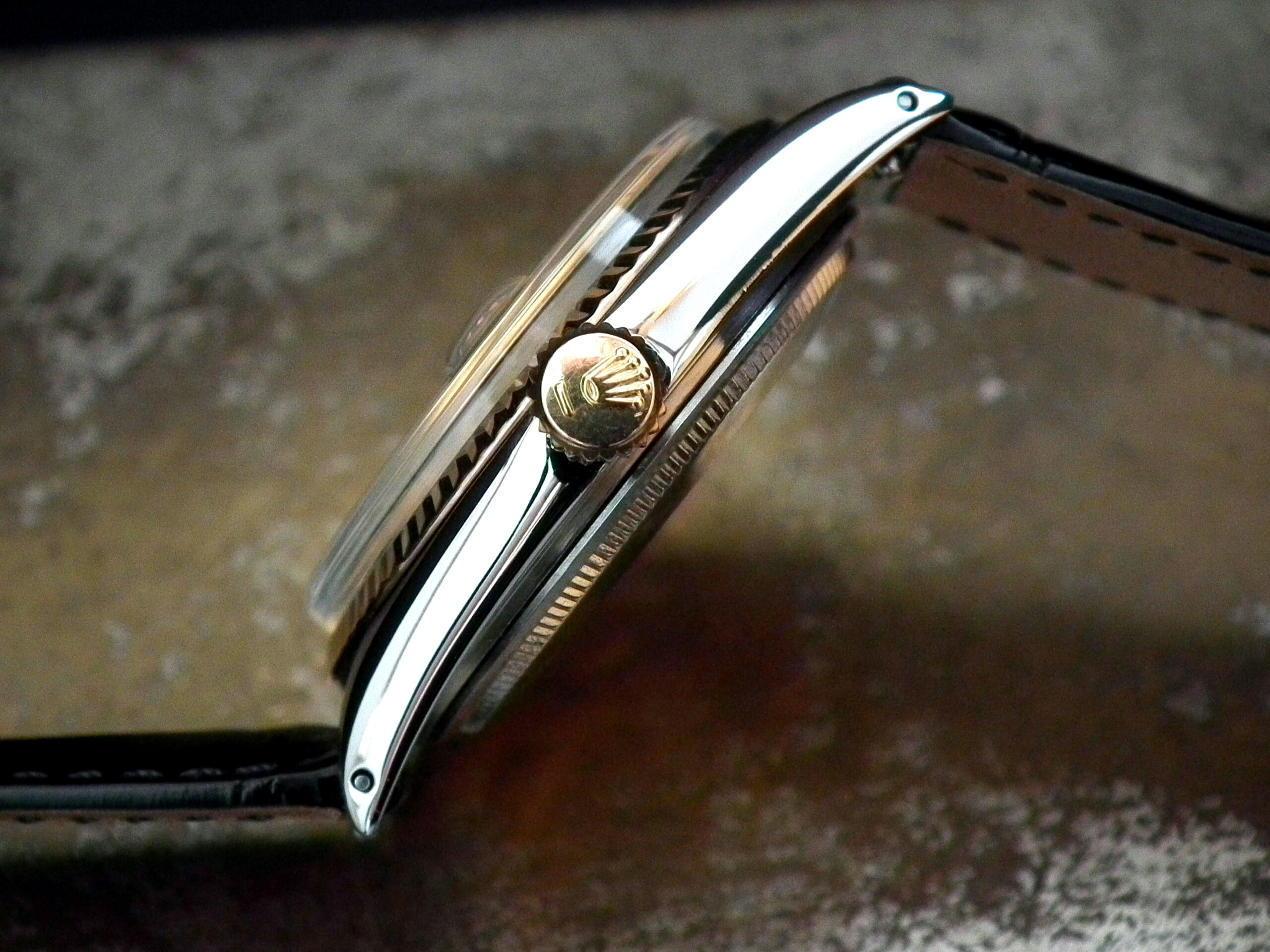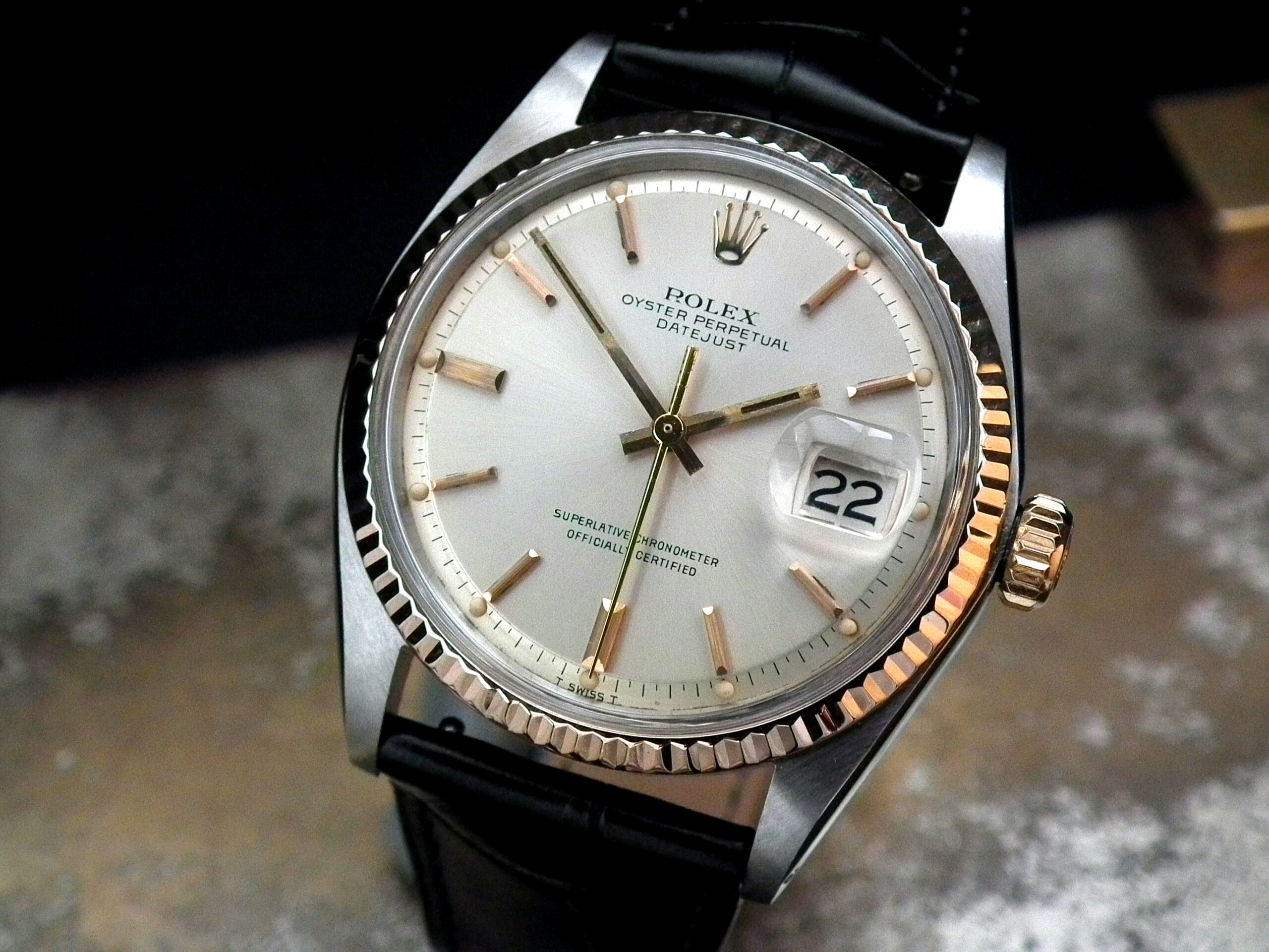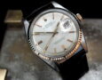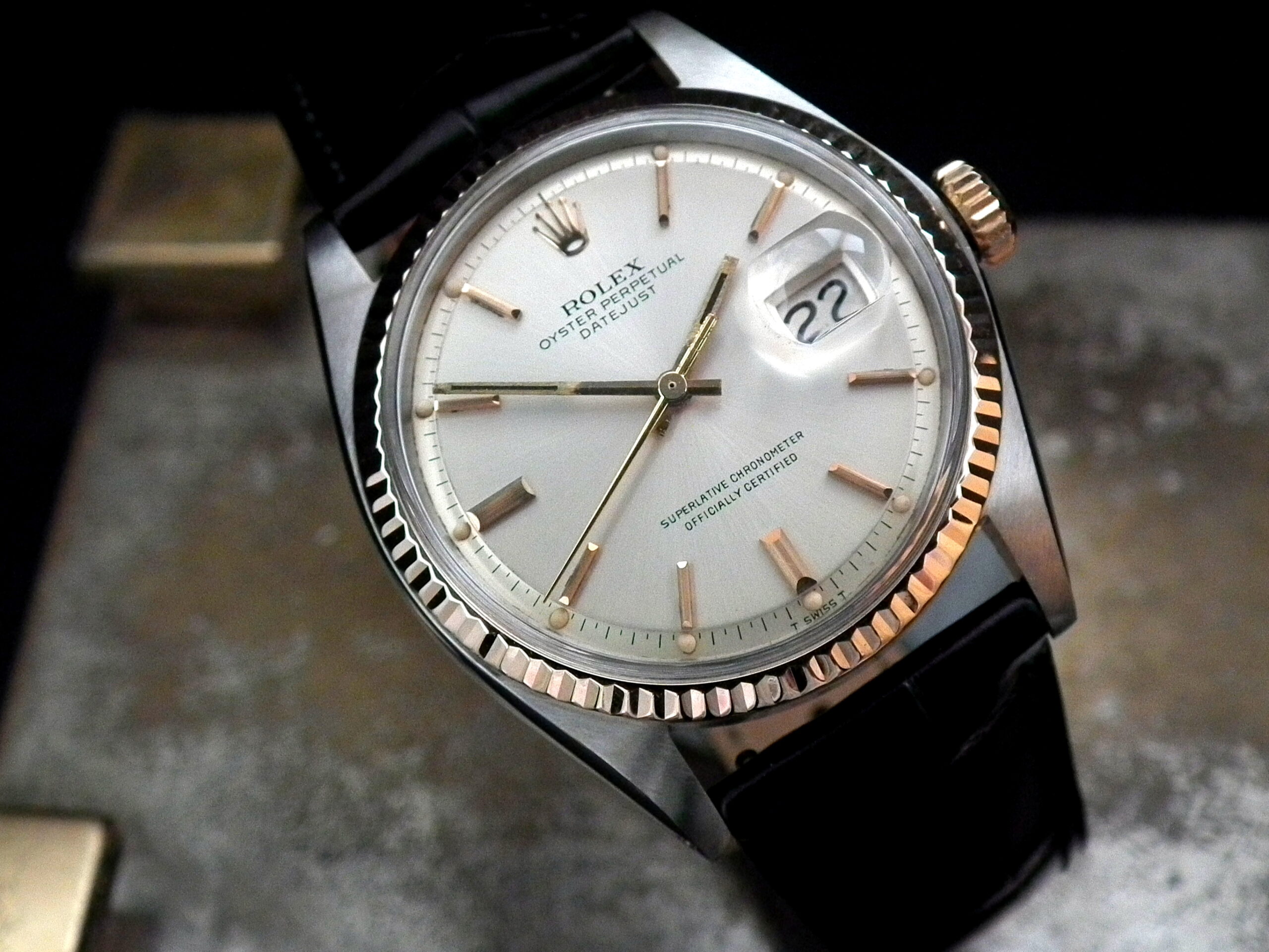 This is a beautiful example of the iconic Rolex Datejust from 1970. The steel and solid rose gold (fluted bezel) case is in excellent condition with only the most minor signs of wear. The original steel pearlescent dial is again in very good condition with only a few minor signs of wear around a couple of the batons and outer edge – I’ve highlighted the batons and it’s hard to see with the naked eye. The applied rose gold hour batons and hands give the softest contrast to the dial and are perfectly framed by the solid rose gold fluted bezel. Always happy to send high resolution pictures of a wrist video. The super high grade Rolex signed chronometer standard movement is again in excellent condition and has just been fully serviced by our professional watchmaker. To complete this amazing watch we’ve added a new, super high quality, black Hirsch ‘London’ alligator strap with non-Rolex rose gold plated buckle.