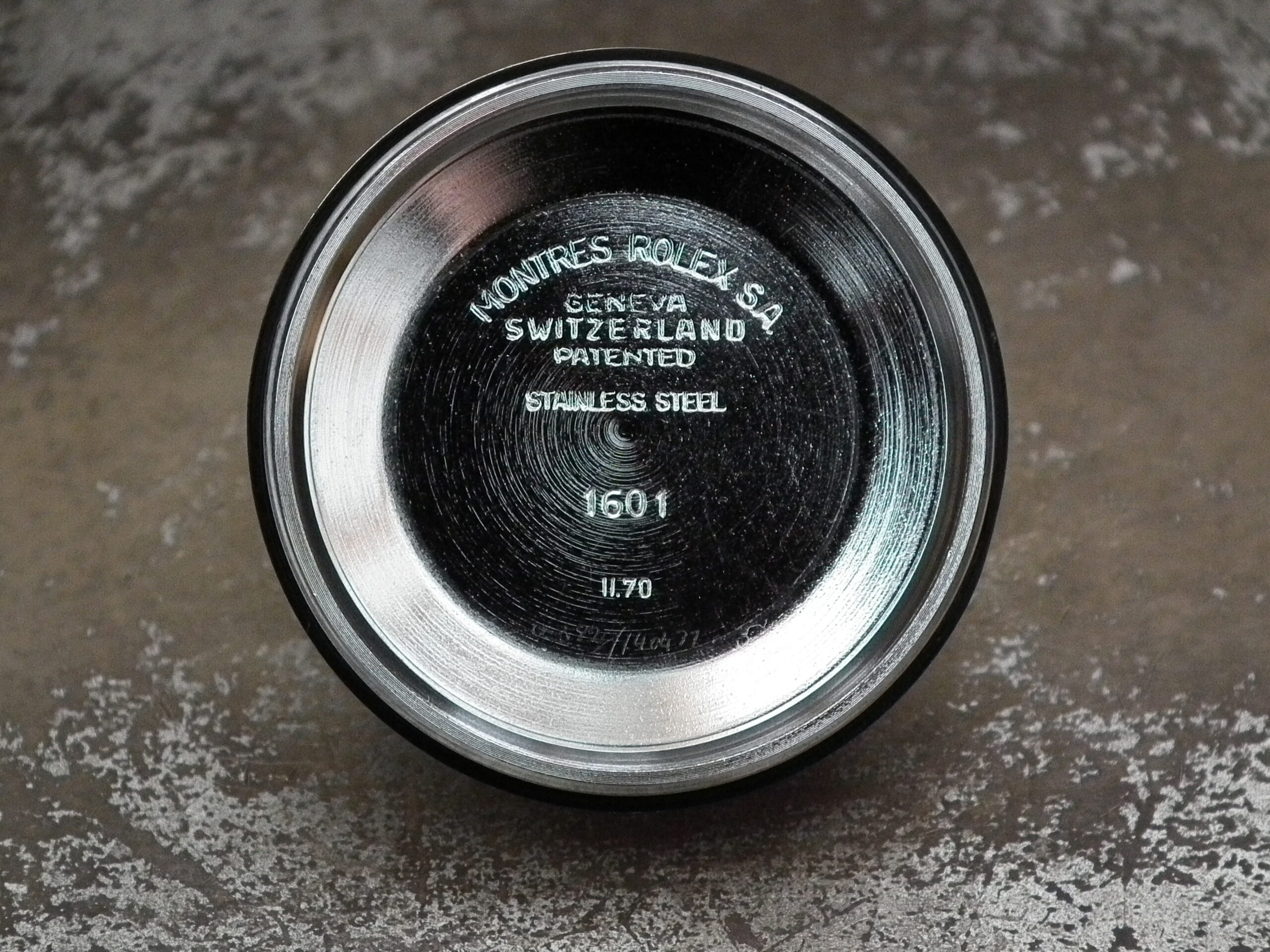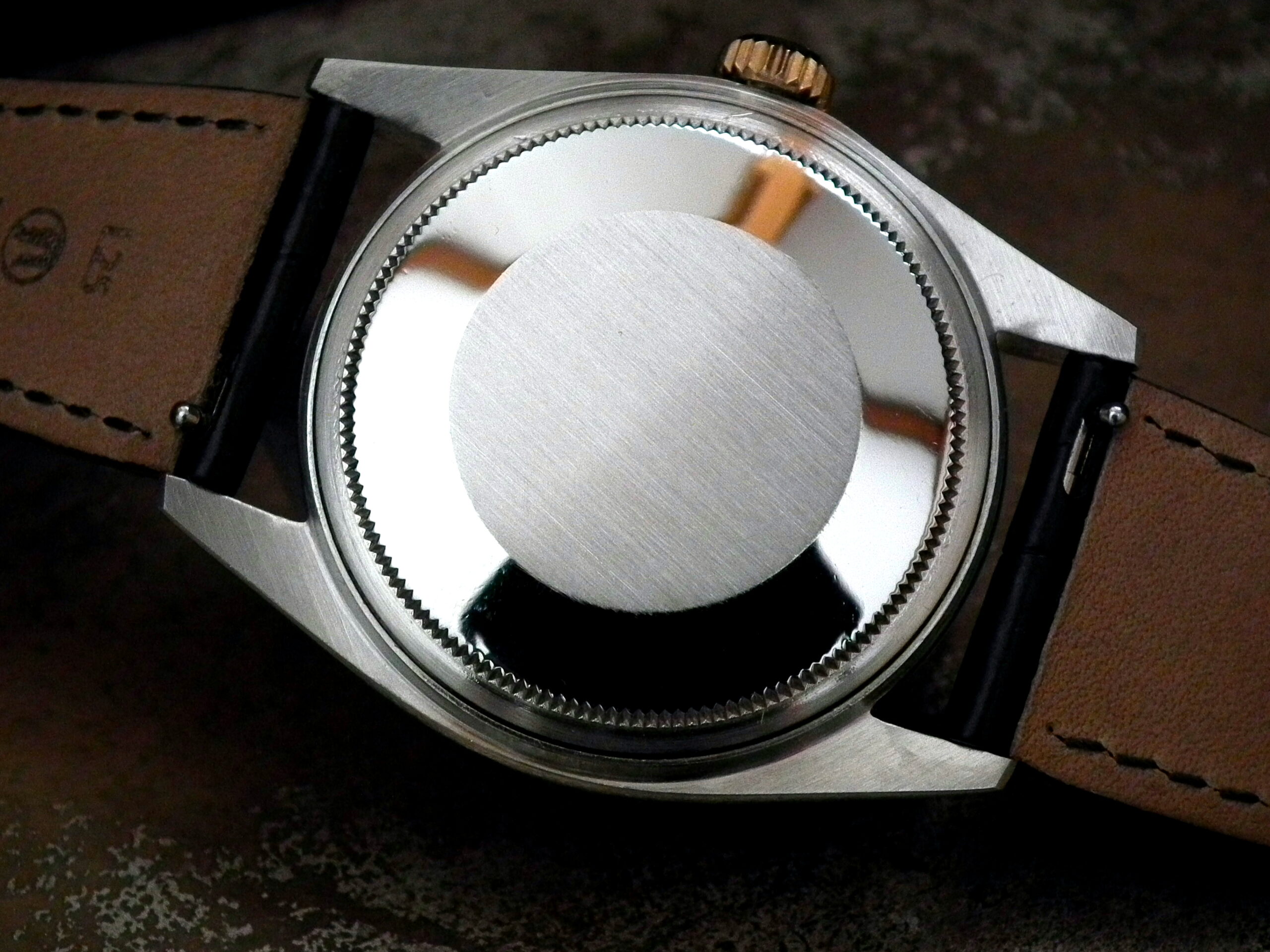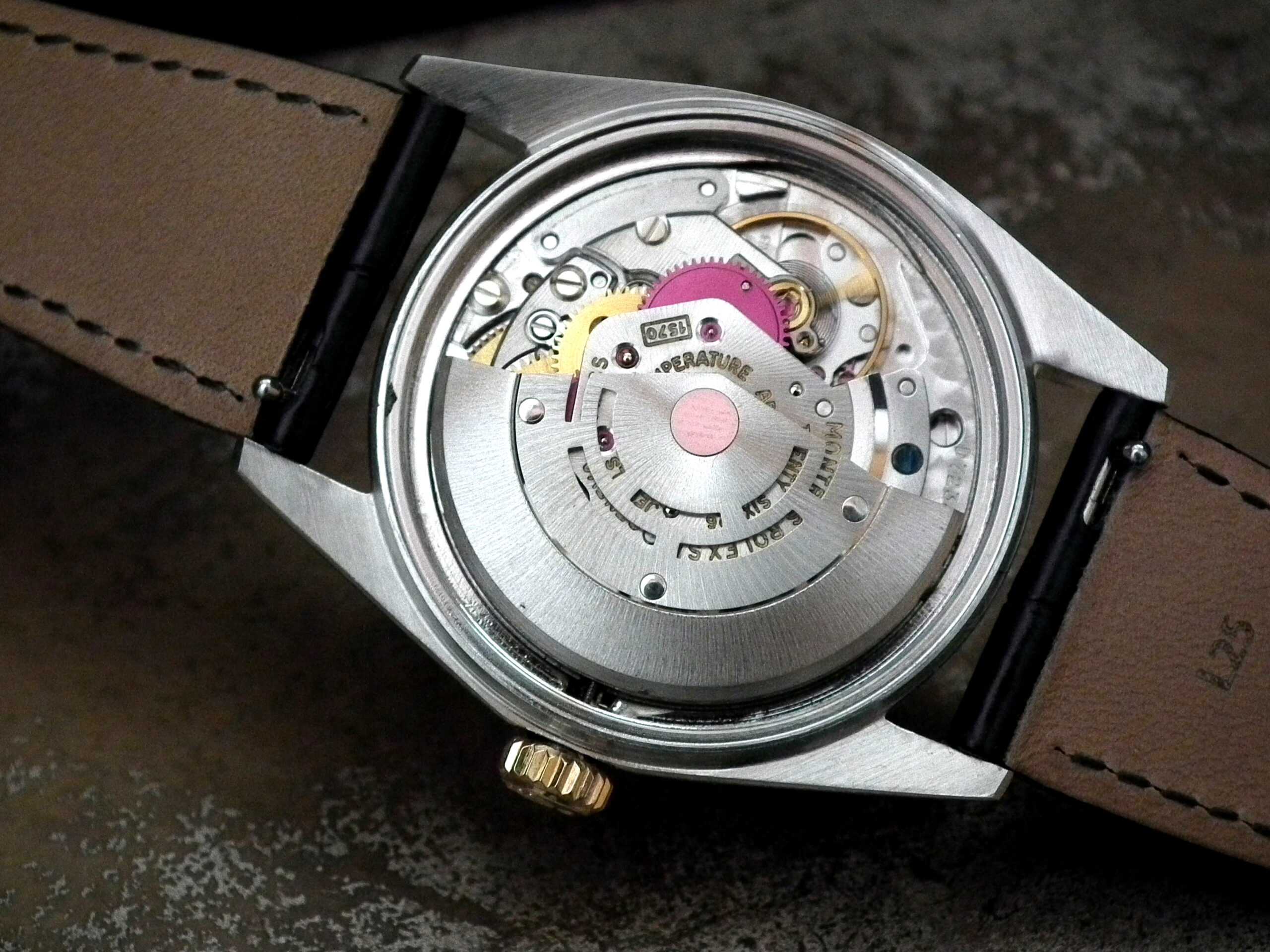 The steel and solid rose gold (fluted bezel) case is in excellent condition with only the most minor signs of wear. The case measures 36mm across, excluding the Rolex signed rose gold crown and 43mm long including the lugs. The inside case is signed ‘Montres Rolex SA Geneva Switzerland’, ‘Patented Stainless Steel’, ‘1601’ and the age reference is ‘11.70’.