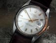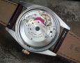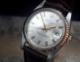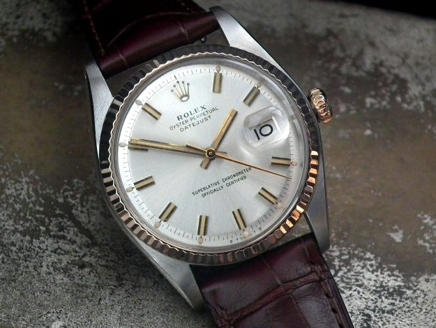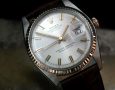 This is a beautiful example of the iconic Rolex Datejust from 1973. It’s also the ‘wide boy’ baton ‘Sigma’ Dial (solid gold hour batons and hands) model creating a stunning dial. The steel and solid rose gold (fluted bezel) case is in near faultless condition. The original Rolex signed steel pearlescent dial with rose gold hands and batons is again in excellent condition. The very high grade ‘chronometer’ standard Rolex signed automatic movement is also in excellent condition and has just been fully serviced by our professional watchmaker. The watch sits on a new, super high quality, dark brown Hirsch ‘London’ alligator strap with non-Rolex rose gold plated buckle. In view of the quality and condition of the movement we will give a 12 month guarantee.
