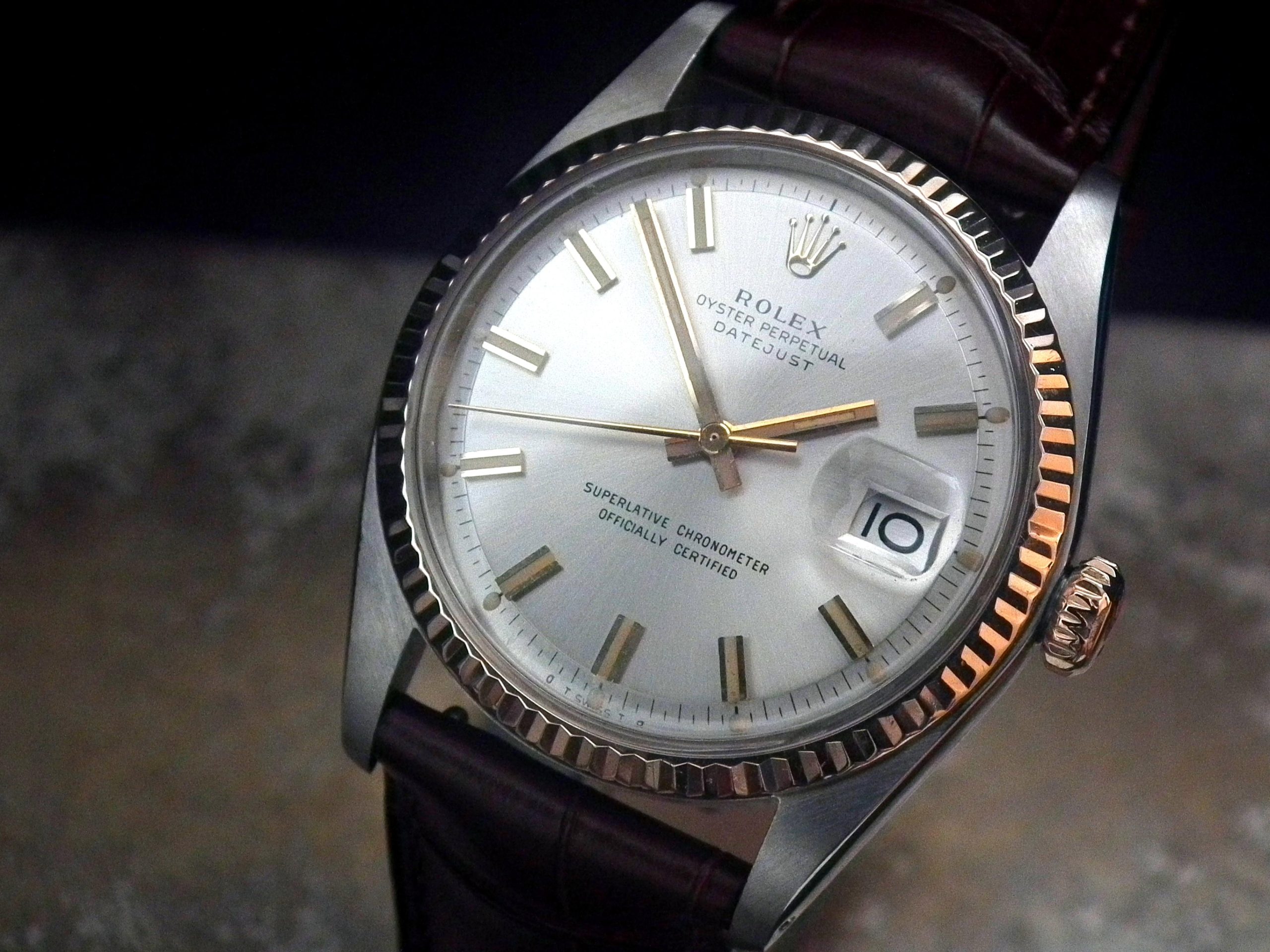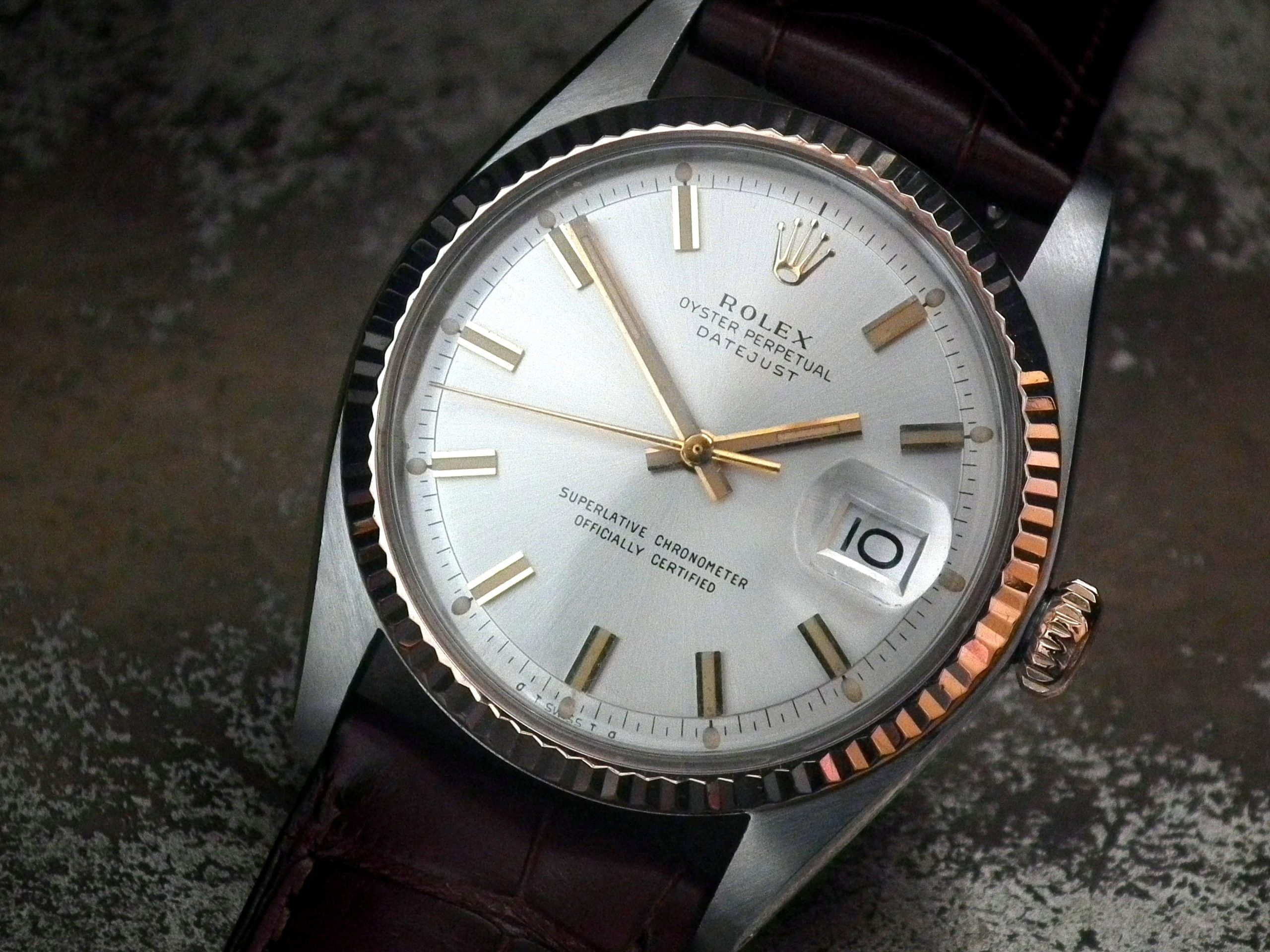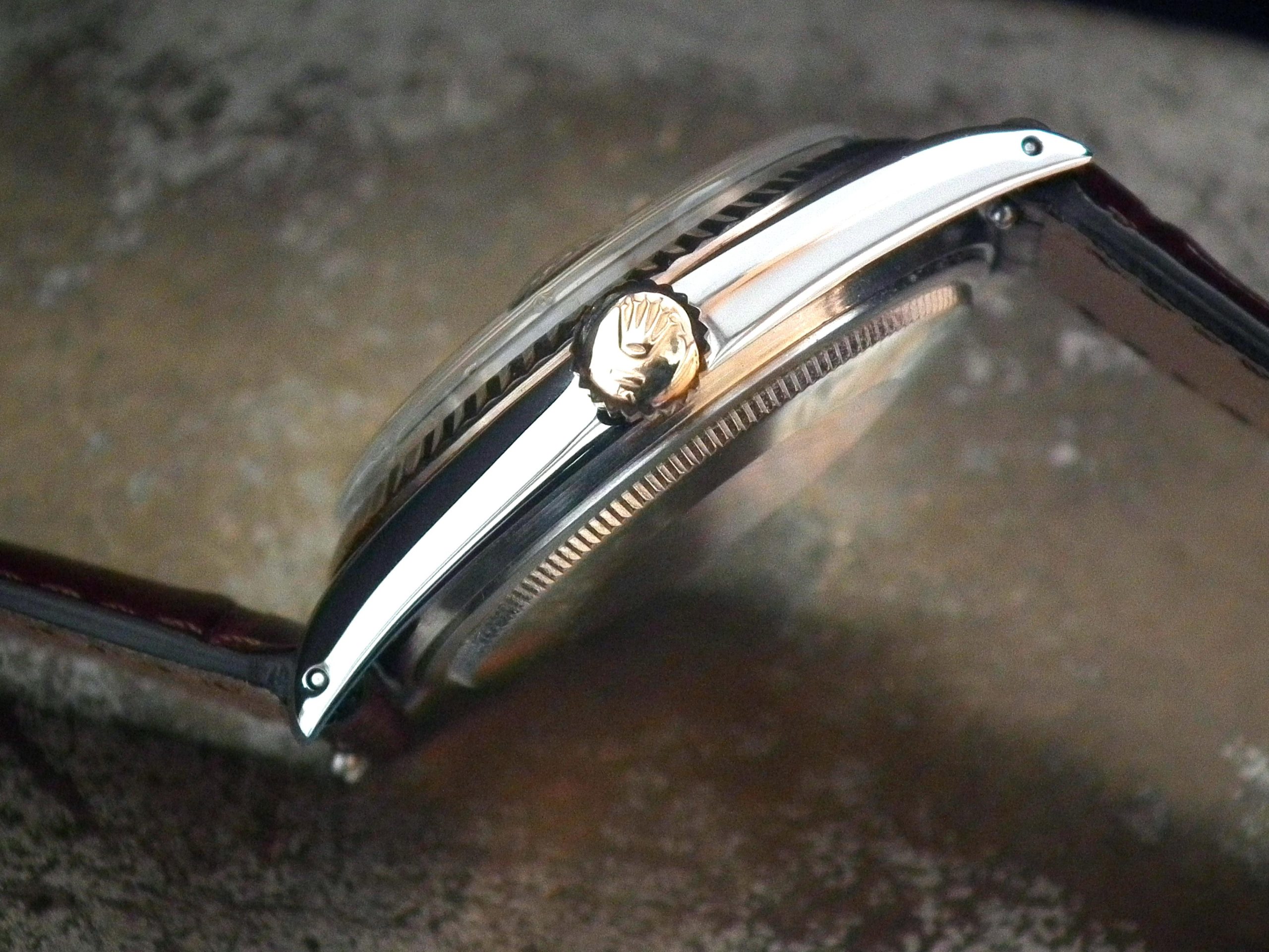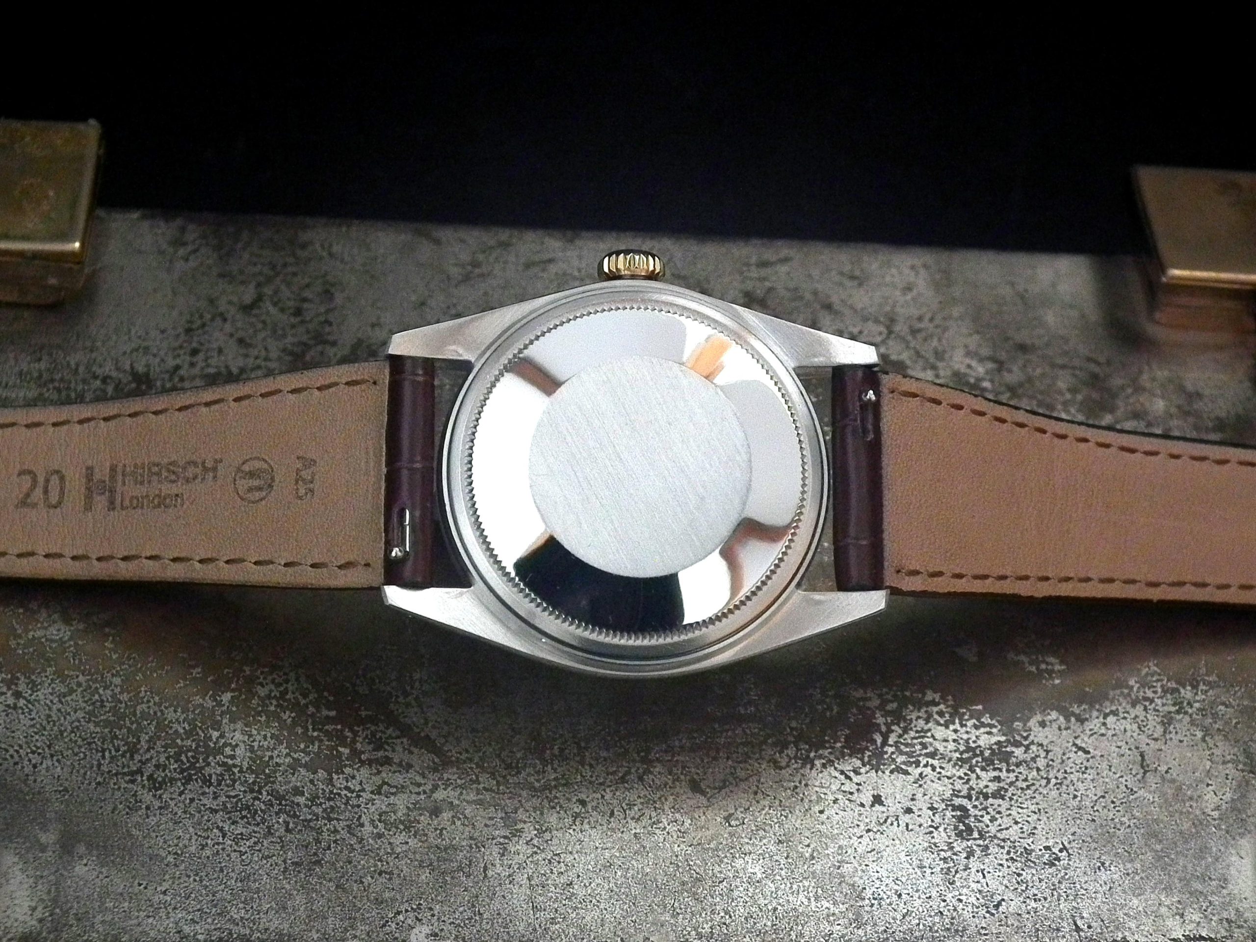 This is a beautiful example of the iconic Rolex Datejust from 1973. It’s also the ‘wide boy’ baton ‘Sigma’ Dial (solid gold hour batons and hands) model creating a stunning dial. The steel and solid rose gold (fluted bezel) case is in near faultless condition. The original Rolex signed steel pearlescent dial with rose gold hands and batons is again in excellent condition. The very high grade ‘chronometer’ standard Rolex signed automatic movement is also in excellent condition and has just been fully serviced by our professional watchmaker. The watch sits on a new, super high quality, dark brown Hirsch ‘London’ alligator strap with non-Rolex rose gold plated buckle. In view of the quality and condition of the movement we will give a 12 month guarantee.
