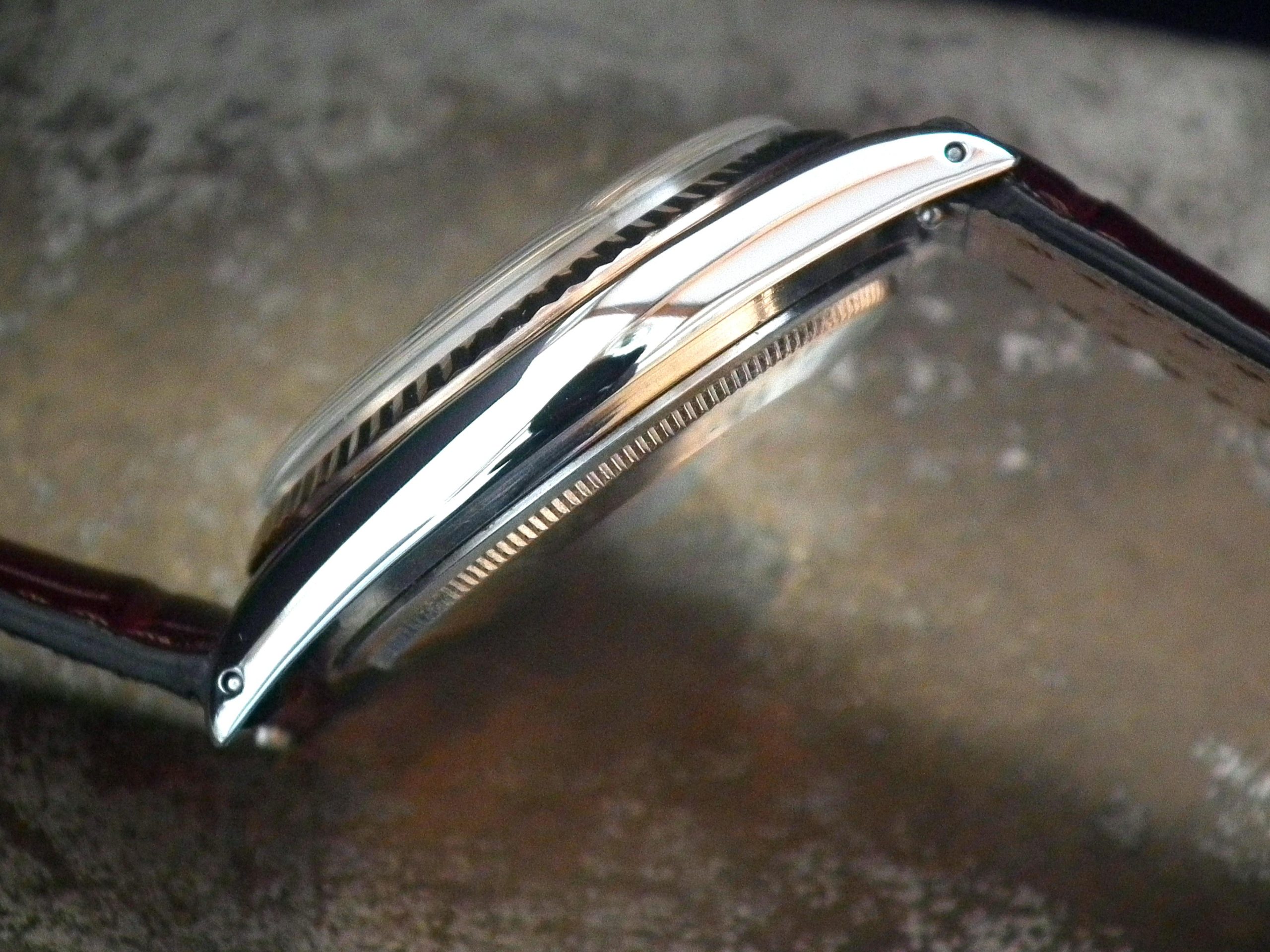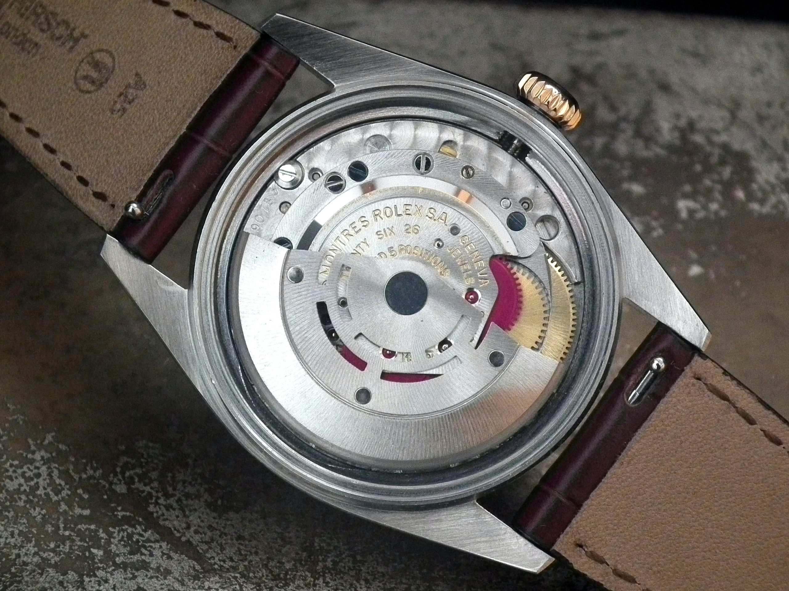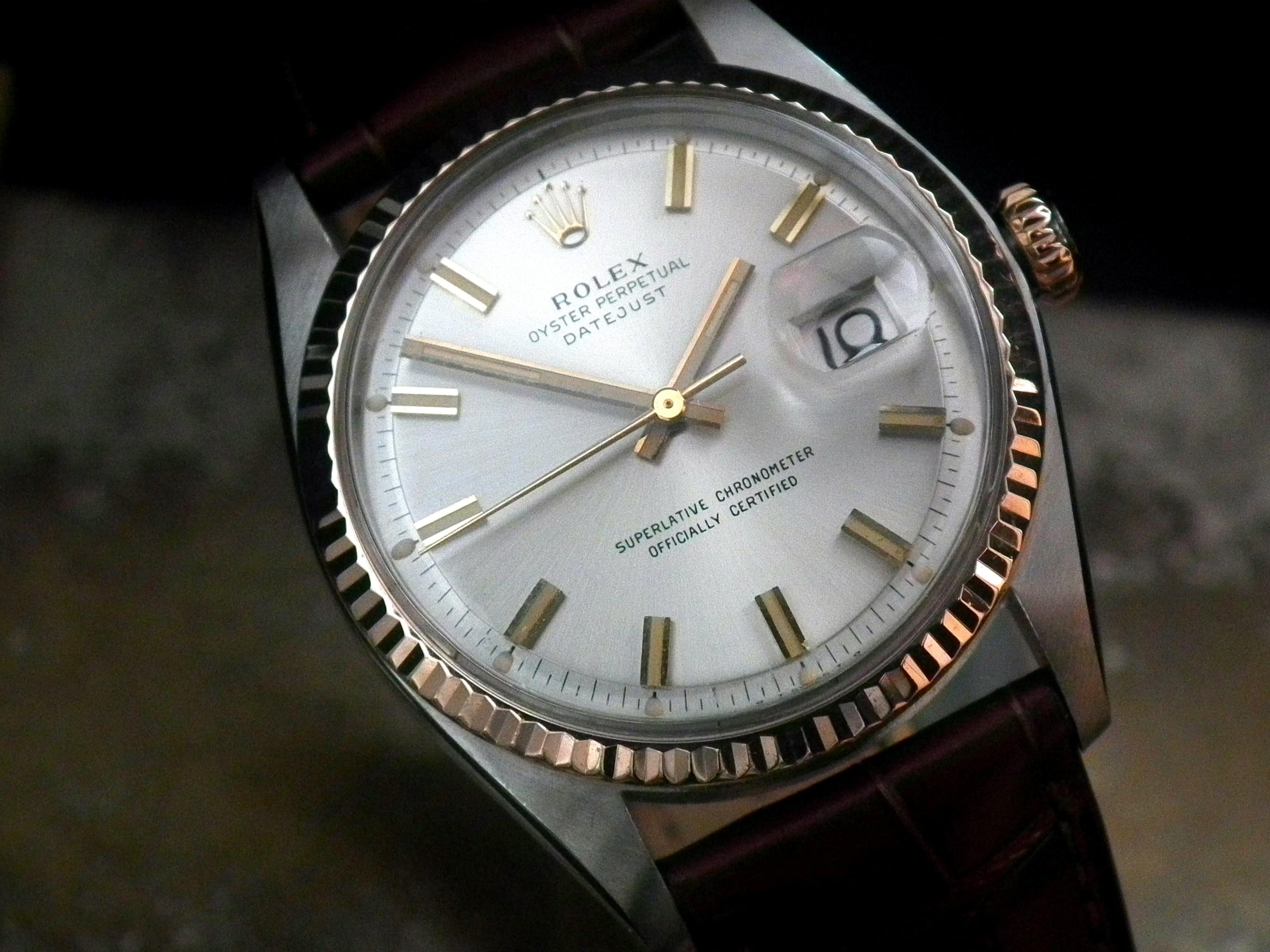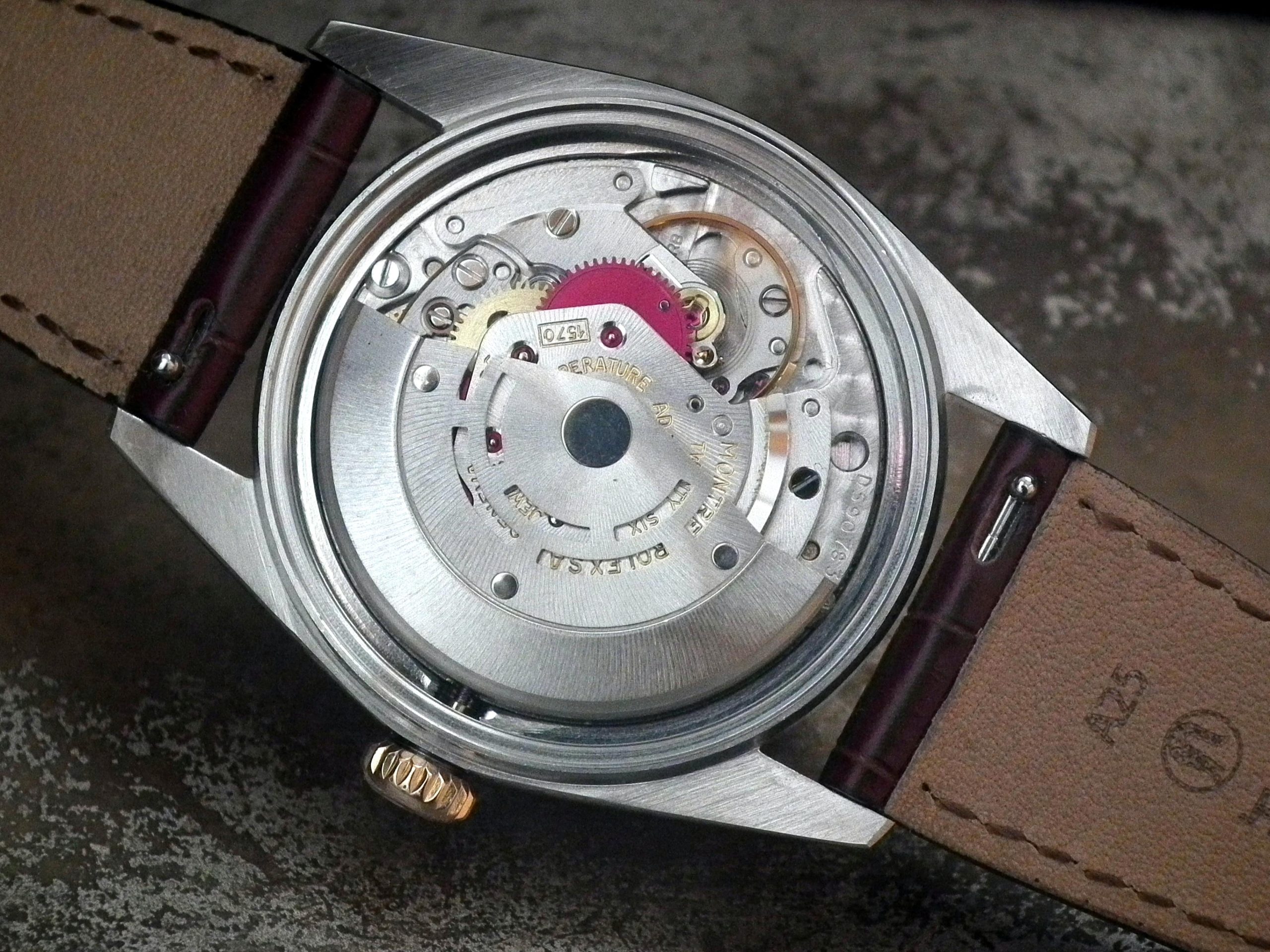This is a beautiful example of the iconic Rolex Datejust from 1973. It’s also the ‘wide boy’ baton ‘Sigma’ Dial (solid gold hour batons and hands) model creating a stunning dial. The steel and solid rose gold (fluted bezel) case is in near faultless condition. The original Rolex signed steel pearlescent dial with rose gold hands and batons is again in excellent condition. The very high grade ‘chronometer’ standard Rolex signed automatic movement is also in excellent condition and has just been fully serviced by our professional watchmaker. The watch sits on a new, super high quality, dark brown Hirsch ‘London’ alligator strap with non-Rolex rose gold plated buckle. In view of the quality and condition of the movement we will give a 12 month guarantee.