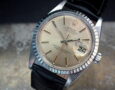 This a beautiful example of the Rolex Datejust from 1977. The steel engine-turned (fluted bezel) and steel case is as near faultless as can be with only the most minimal signs of wear. The original Rolex signed sigma champagne dial is stunning – Sigma dials are very rare (denoted by the 2 ‘O’s either side of the ‘T Swiss T’ and means the applied hour batons and hands are solid gold. The chronometer standard Rolex signed automatic is again in excellent condition and has just been fully serviced by our professional watchmaker. The watch sits on a new, super high quality, dark brown Hirsch ‘London’ alligator strap with gold plated Hirsch buckle. We also have the original Rolex swing tag – high crown version – with the matching serial number.