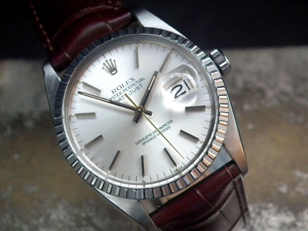 This is a beautiful example of the iconic Rolex Datejust from 1980 and being a little newer is the quick date set model allowing the date to be set without turning the hands round the dial twice for each day. The steel case is in excellent condition with only the most minor signs of wear and a couple of shallow dings on the bottom right lug – I’ve tried to capture this on a photograph but have been unable to. Happy to send a WhatsApp video if required. The very high grade chronometer standard automatic movement is again in excellent condition and has just been fully serviced by our professional watchmaker (the watch was also serviced by Rolex in late 2021 and we have the Rolex card). The watch sits on a new, super high quality dark brown Hirsch ‘London’ alligator strap with a gold plated Hirsch buckle.