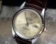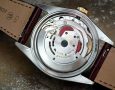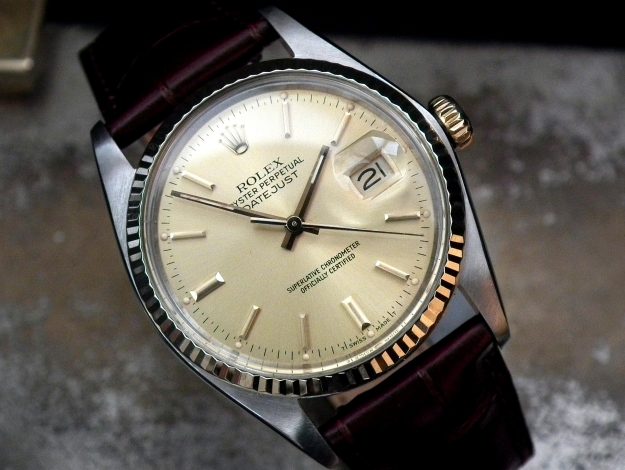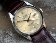 This is a simply beautiful example of the iconic Rolex Datejust from 1985. The steel and solid gold (fluted bezel) case is in near faultless condition with only the most minimal signs of wear. The original Rolex signed champagne pearlescent dial is again in excellent condition with only a few very minor marks (I’ve highlighted one on the second dial picture; hard to see with the naked eye). The original Rolex signed chronometer standard automatic movement is again in excellent condition and it’s just been serviced by our professional watchmaker. The watch sits on a new, super high quality dark brown Hirsch ‘London’ alligator strap with Hirsch gold plated buckle.