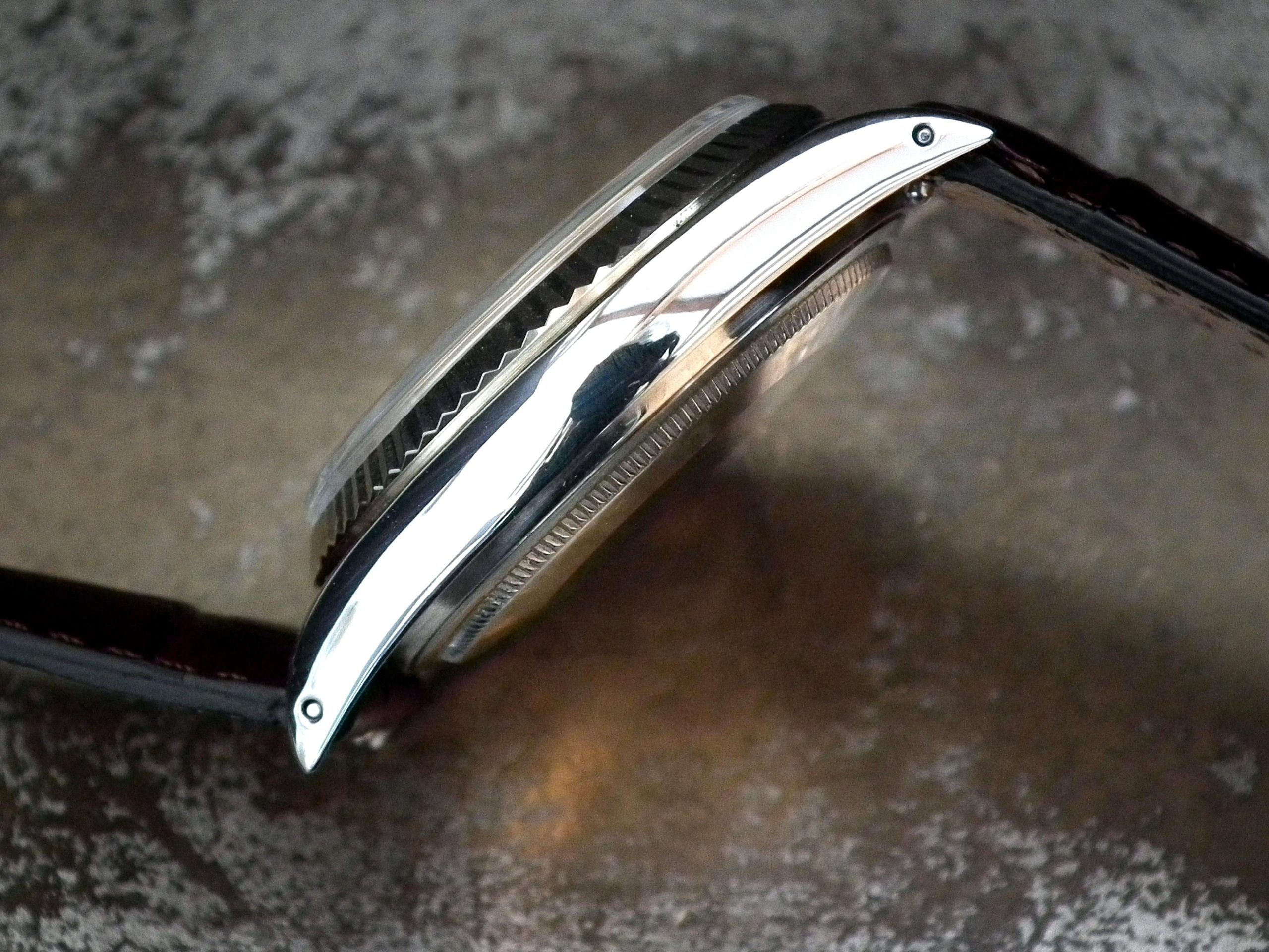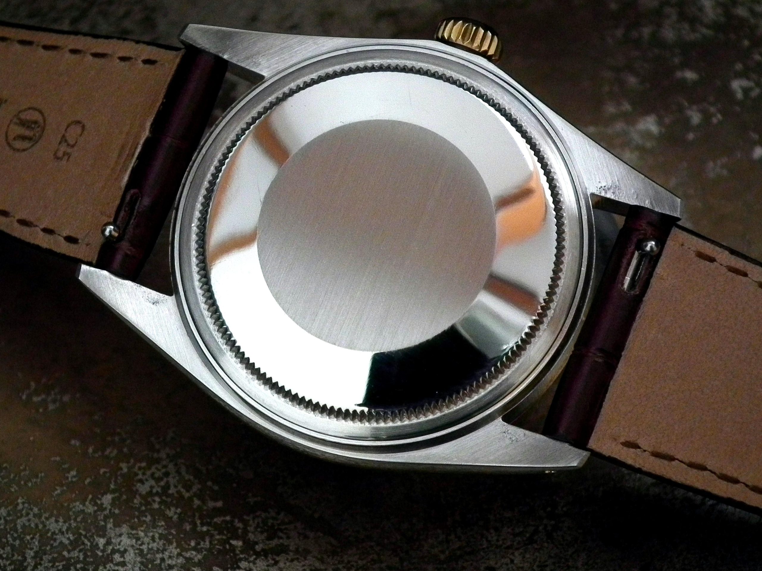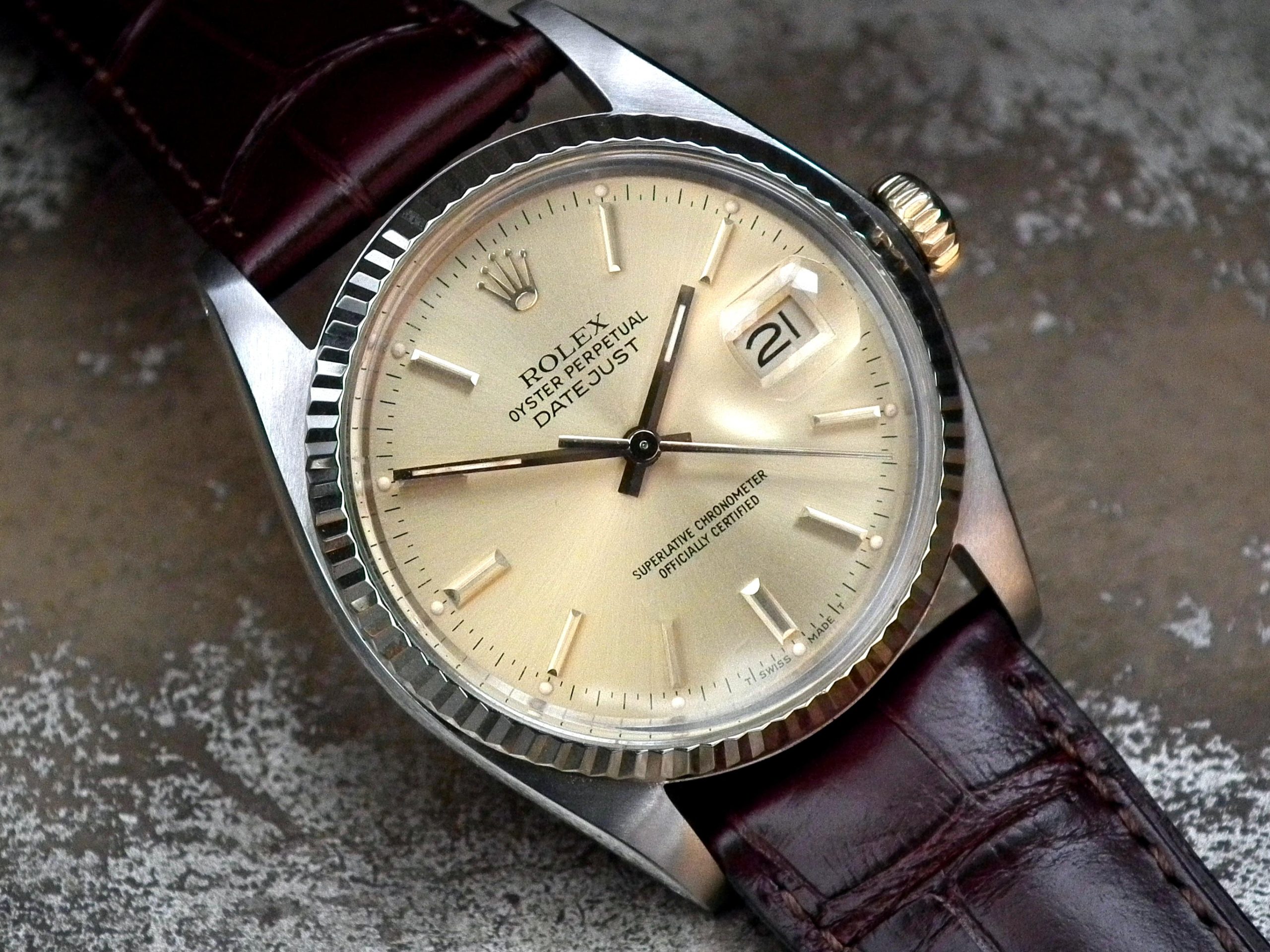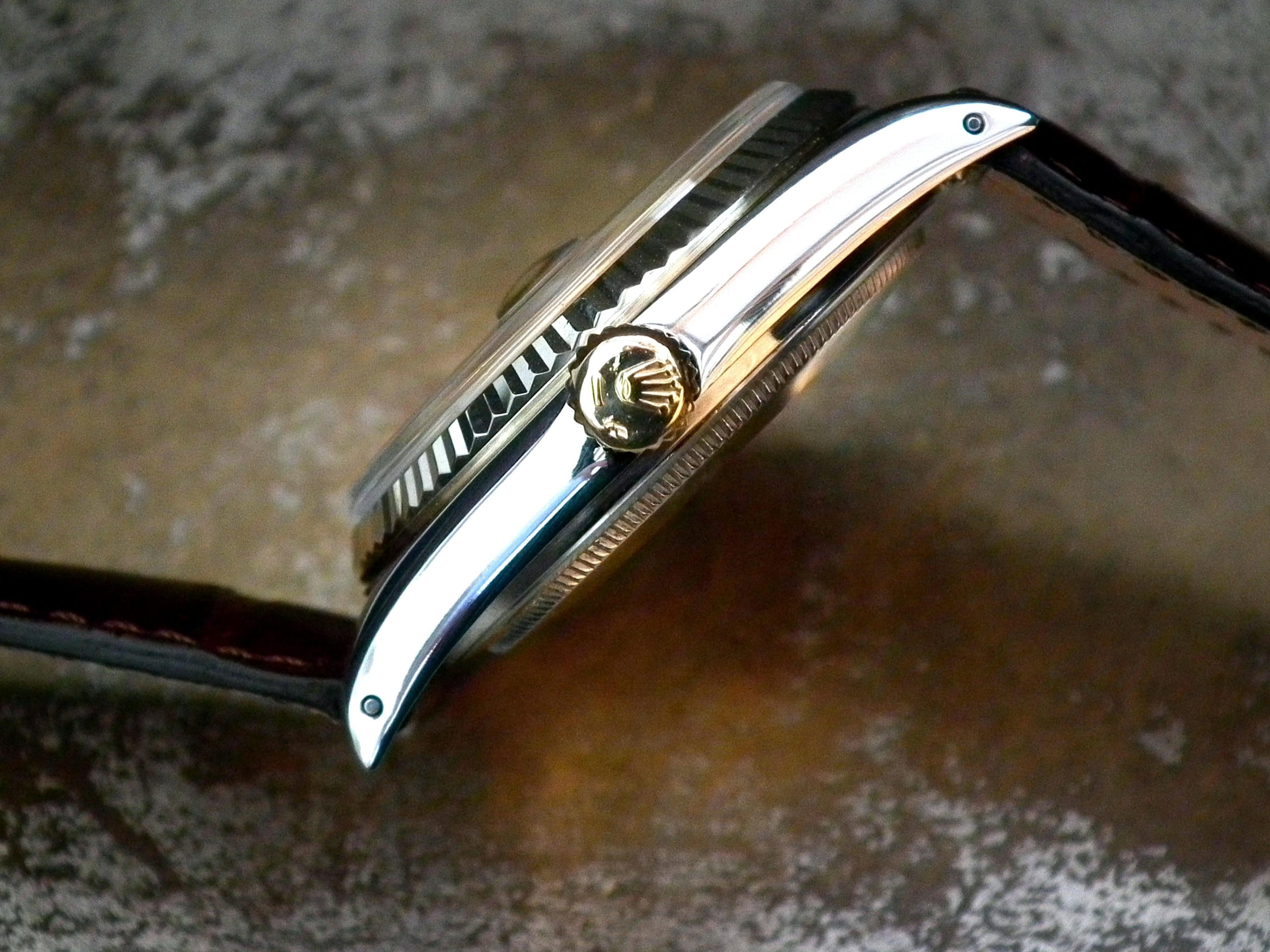 This is a simply beautiful example of the iconic Rolex Datejust from 1985. The steel and solid gold (fluted bezel) case is in near faultless condition with only the most minimal signs of wear. The original Rolex signed champagne pearlescent dial is again in excellent condition with only a few very minor marks (I’ve highlighted one on the second dial picture; hard to see with the naked eye). The original Rolex signed chronometer standard automatic movement is again in excellent condition and it’s just been serviced by our professional watchmaker. The watch sits on a new, super high quality dark brown Hirsch ‘London’ alligator strap with Hirsch gold plated buckle.