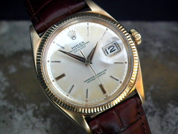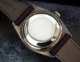 I love all the watches in our collection but every now and again something even more special comes along and this Datejust is just such a watch. Rolex launched the Datejust in 1945 and this one was made in 1948. Very rarely it’s in solid 18ct gold and the case and fluted bezel are in overall excellent condition with only minor signs of wear and surface scratching – I’ve tried to capture these on the photographs and happy to send the high resolution ones or a WhatsApp wrist video. The original steel/champagne Rolex signed dial has aged beautifully. The gold hands and applied hour batons provide the softest contrast to the dial and are perfectly framed by the solid 18ct gold fluted bezel. The very high grade Rolex signed ‘chronometer’ standard automatic movement is again in very good condition and has just been serviced by our professional watchmaker. To complete this stunning piece I’ve added a new, super high quality, dark brown Hirsch ‘London’ alligator strap along with a genuine solid 9ct gold Rolex buckle from the 1950’s – this is signed ‘ALD’ who made cases and buckles for a number of the major Swiss brands and is extremely rare (the strap retails at £230 and the buckle would sell for £500…).