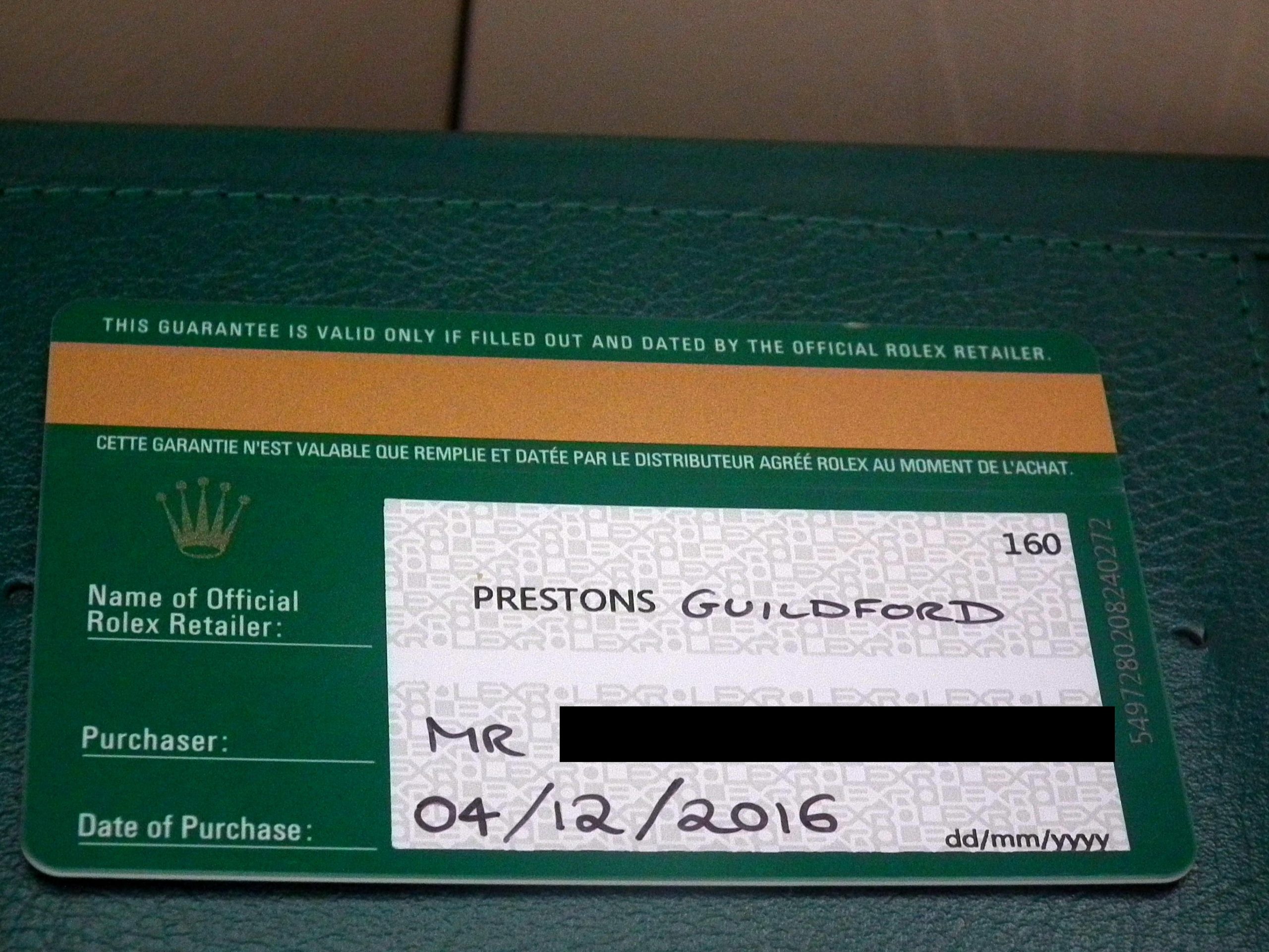 • The Rolex warranty card