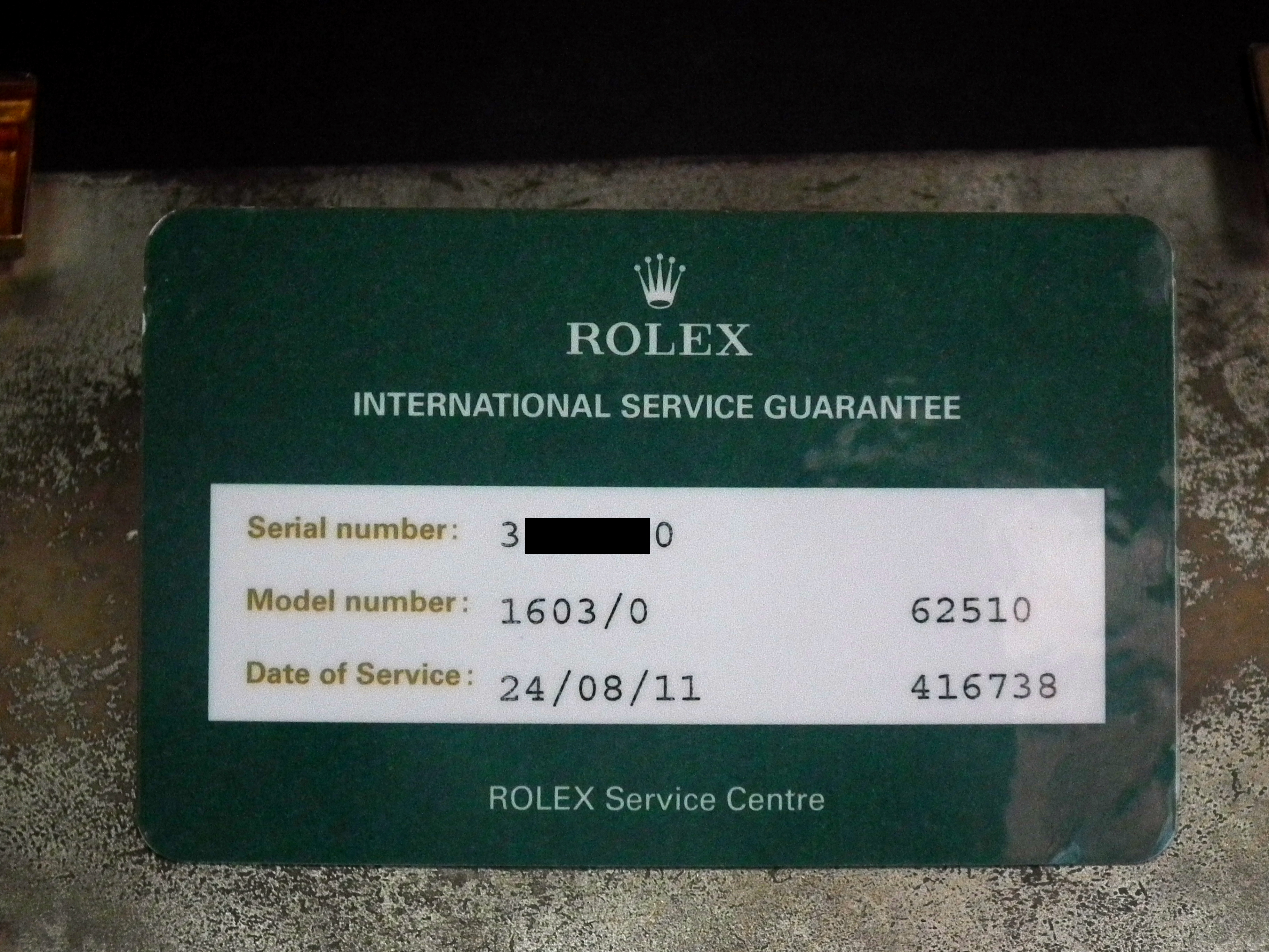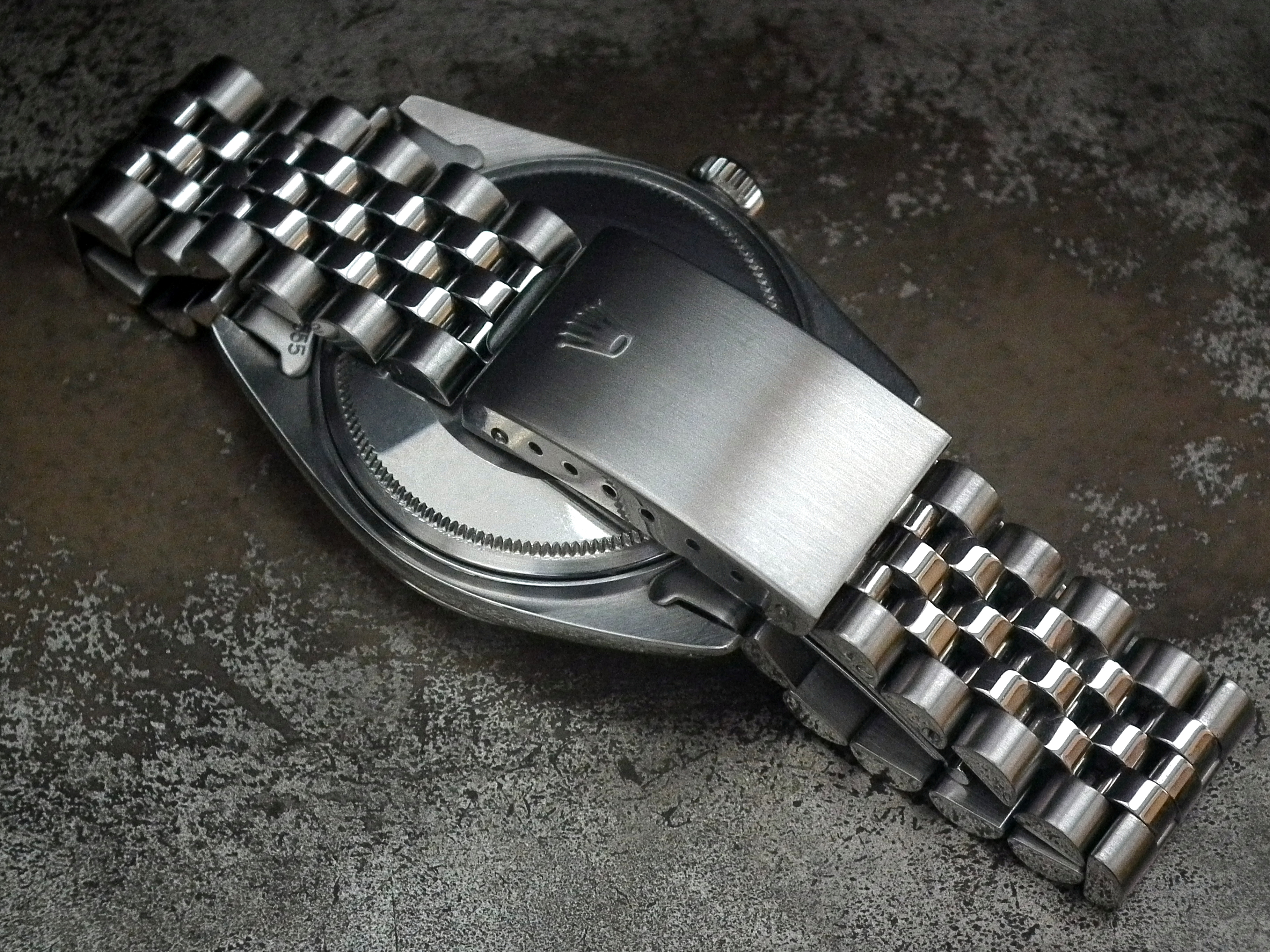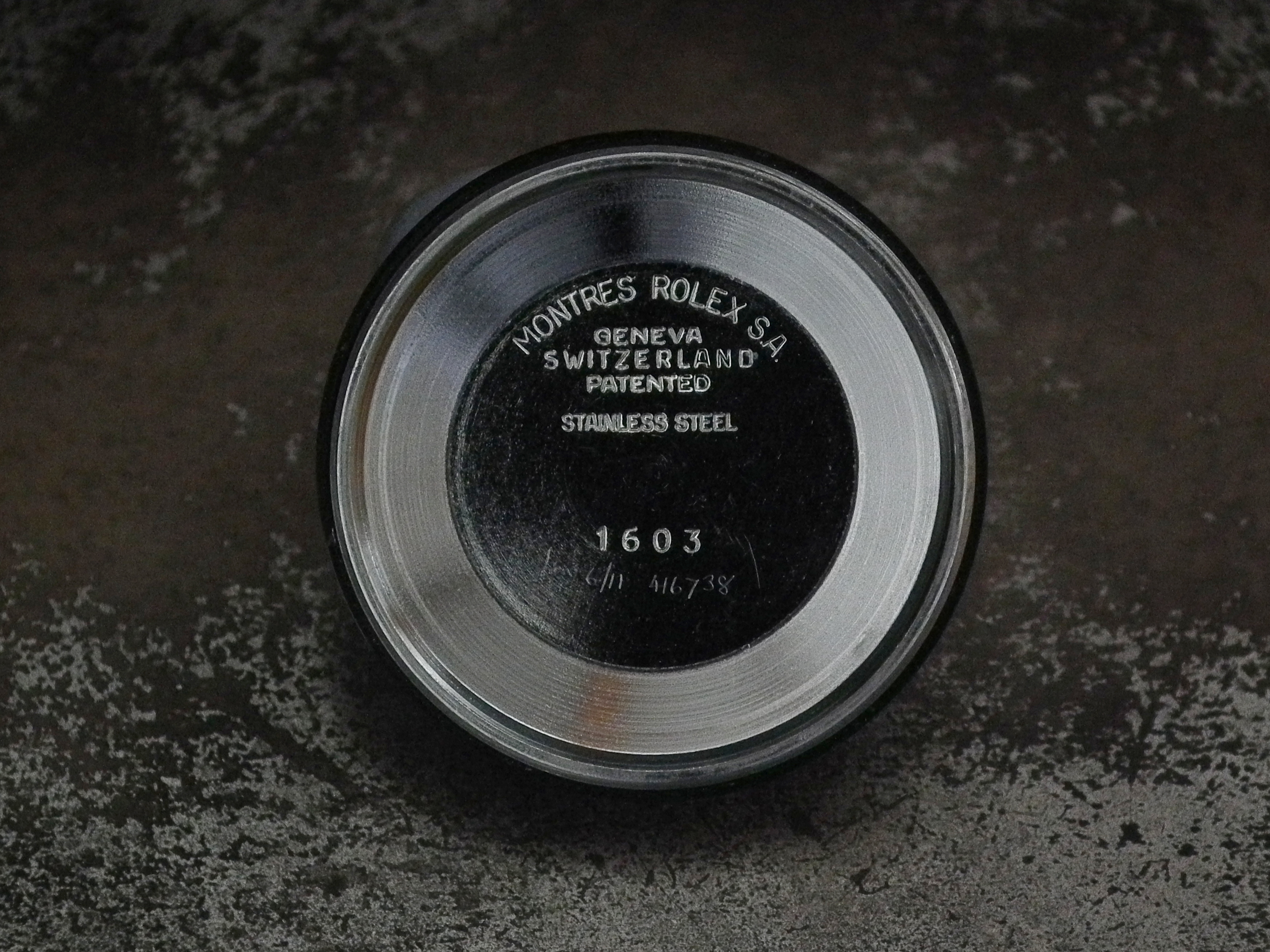 The watch also had a full Rolex service in 2011 and hasn’t been worn more than a handful of times since so is in excellent condition with only the most minor signs of wear on the steel case (we have the Rolex Service card). The case measures 36mm across, excluding the Rolex signed crown and 43mm long including the lugs. The inside case is signed ‘Montres Rolex SA Geneva Switzerland’, ‘Patented Stainless Steel’ and ‘1603’.