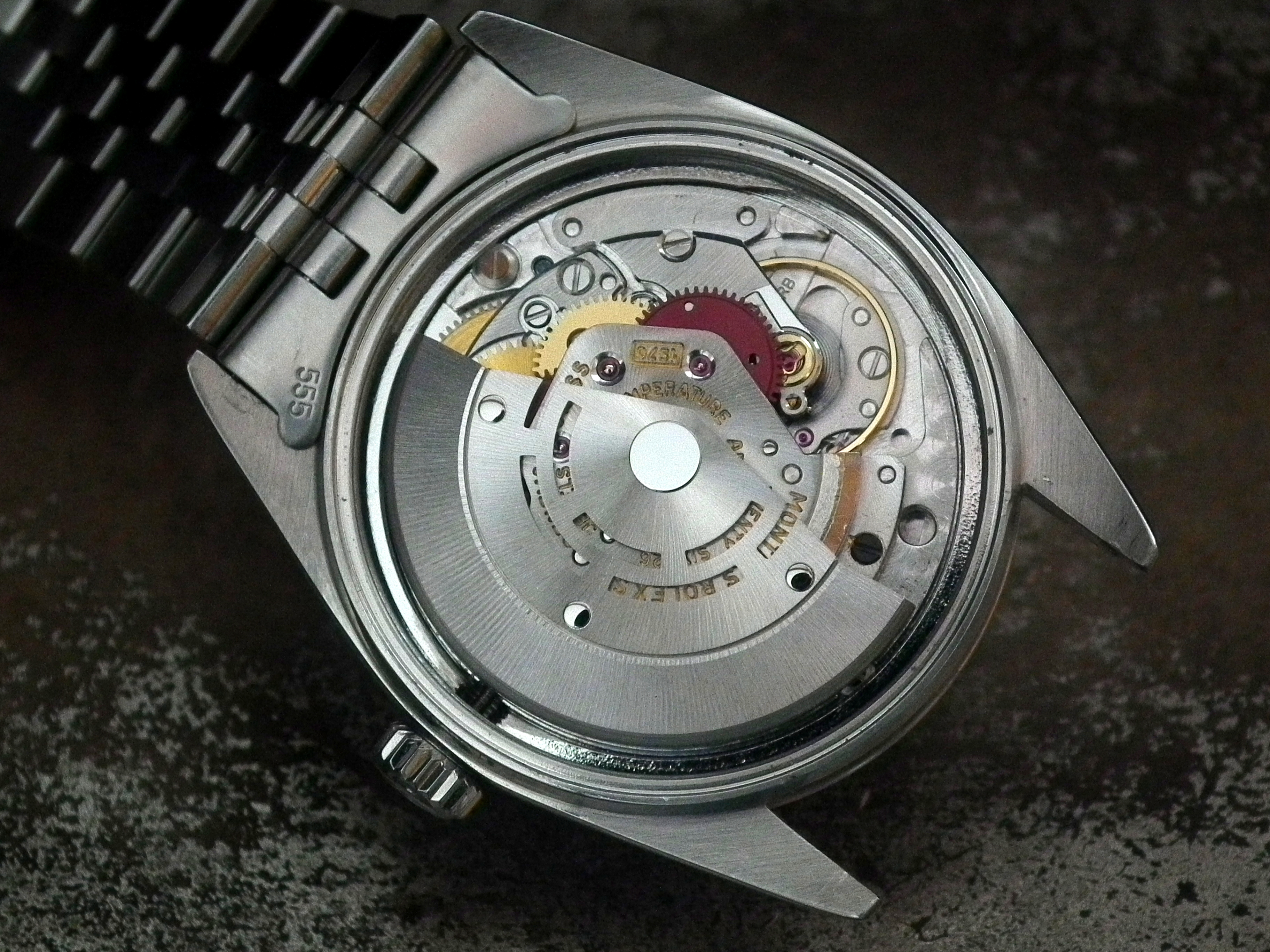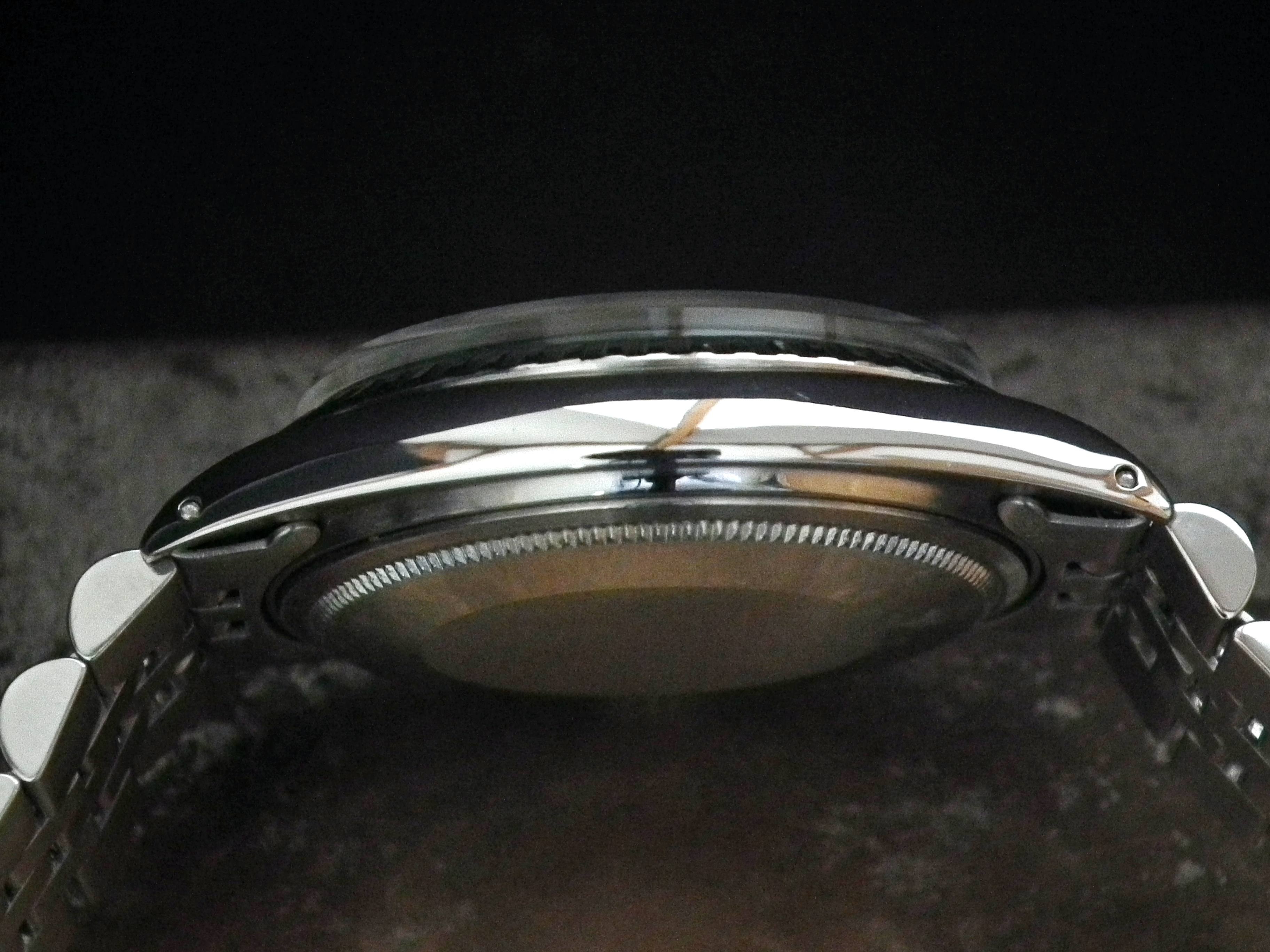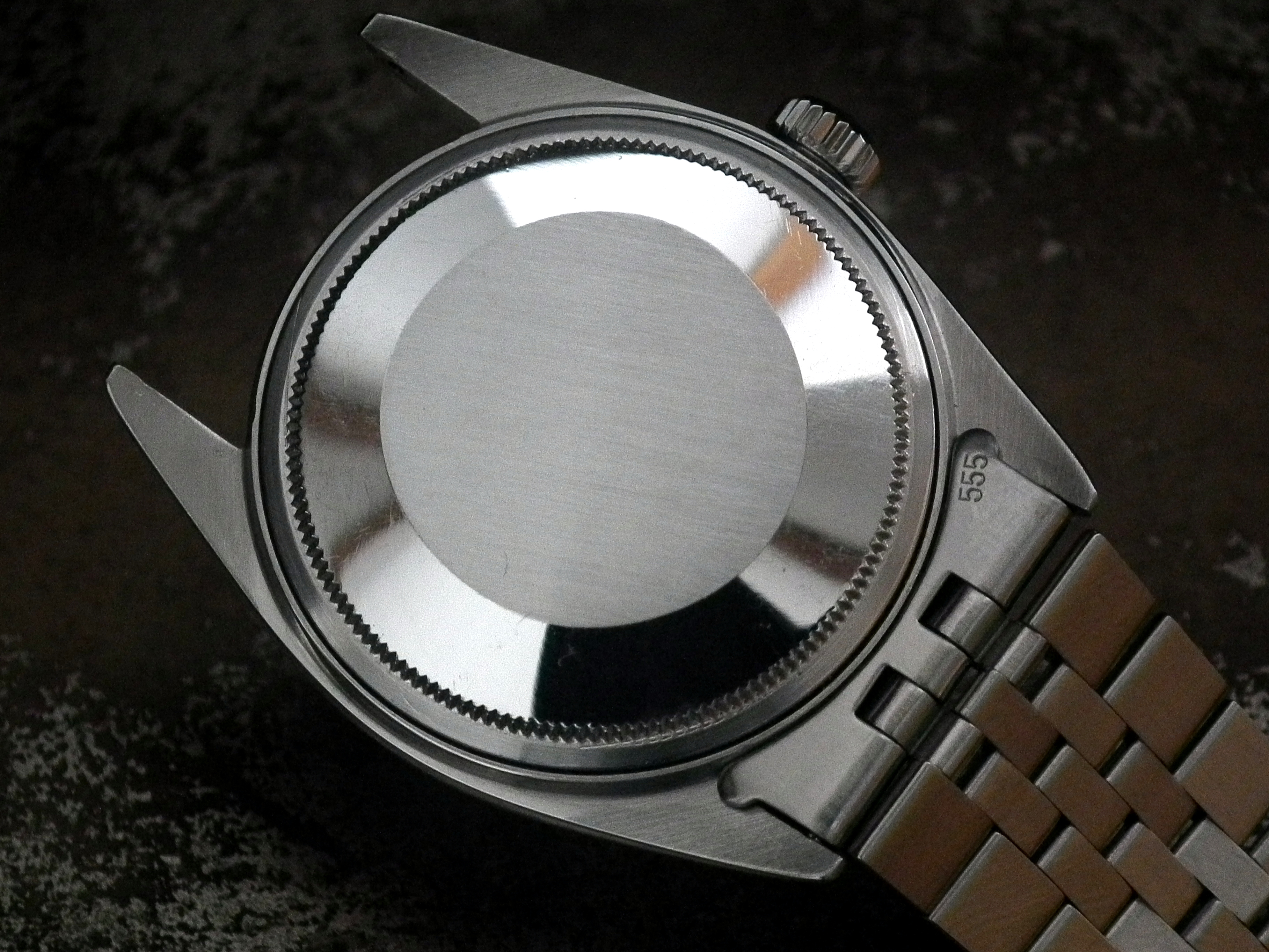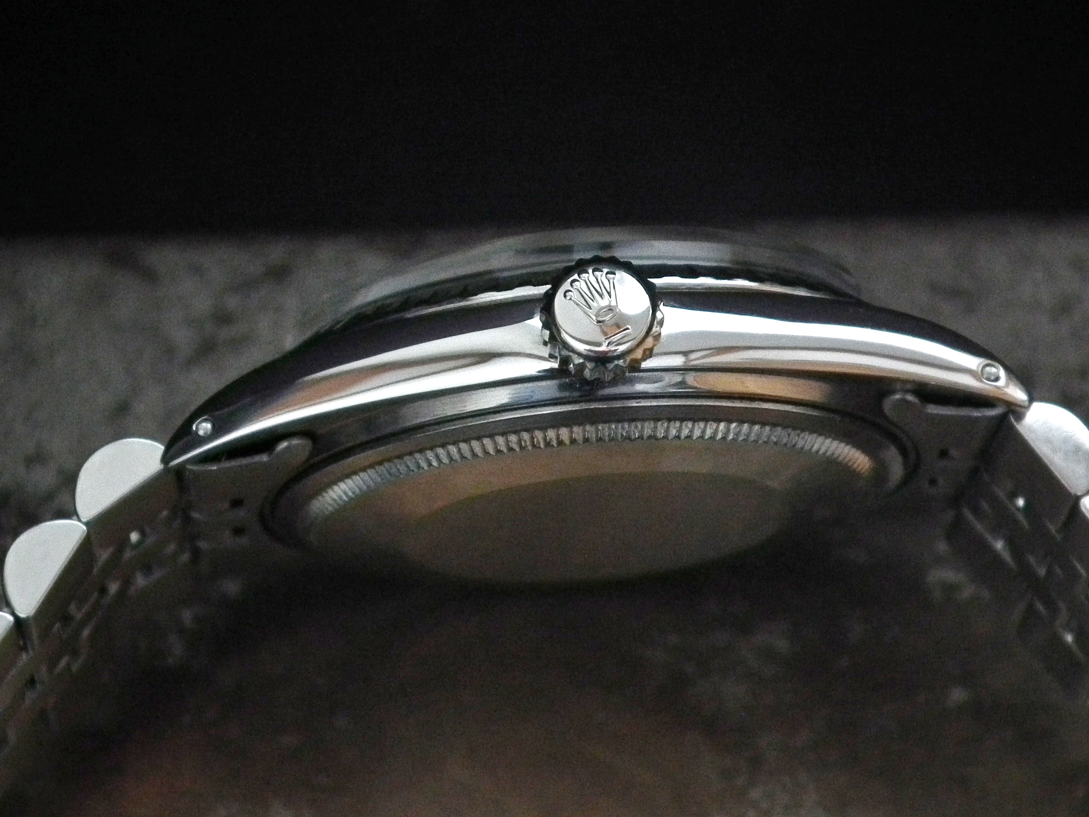 The watch also had a full Rolex service in 2011 and hasn’t been worn more than a handful of times since so is in excellent condition with only the most minor signs of wear on the steel case (we have the Rolex Service card). The case measures 36mm across, excluding the Rolex signed crown and 43mm long including the lugs. The inside case is signed ‘Montres Rolex SA Geneva Switzerland’, ‘Patented Stainless Steel’ and ‘1603’.