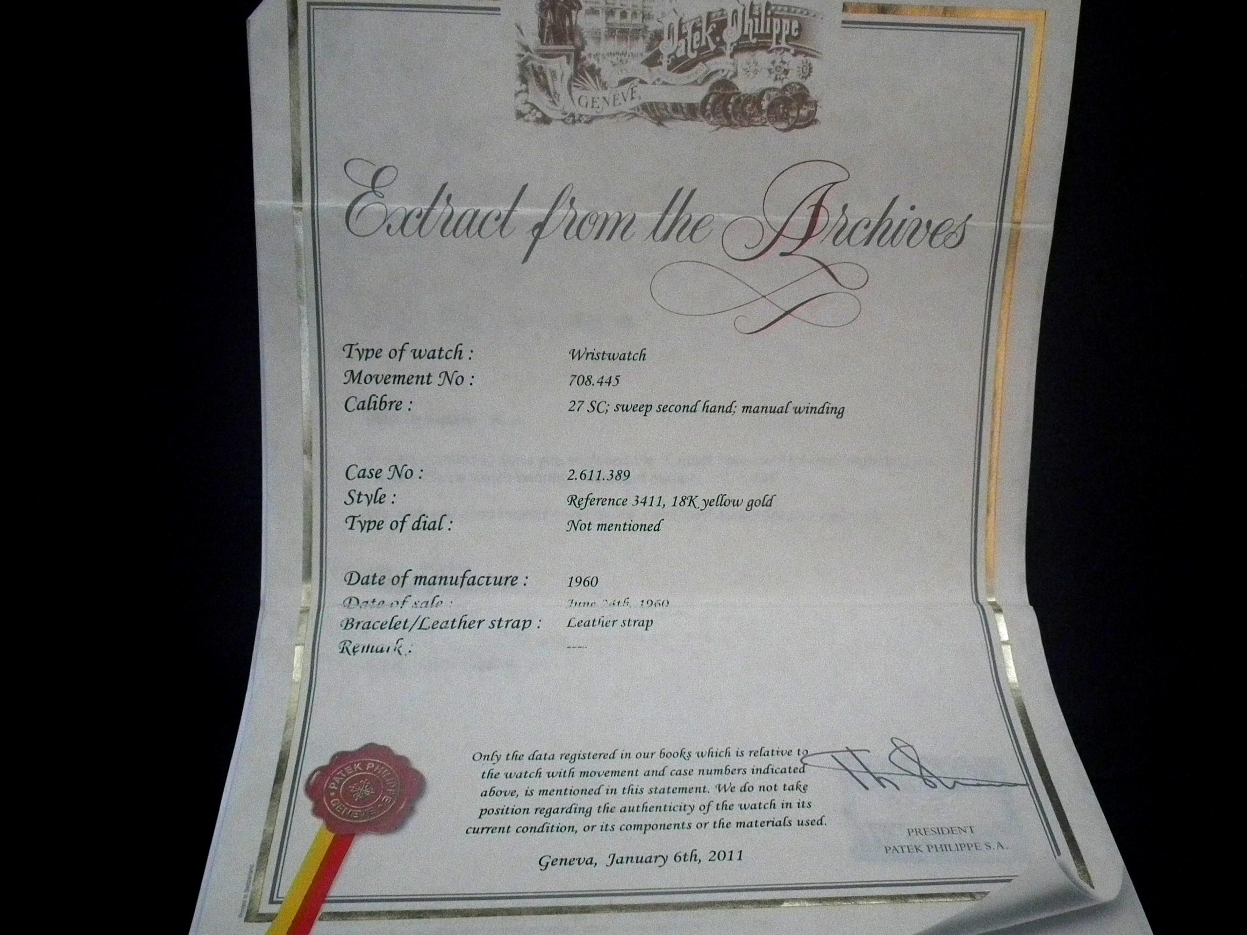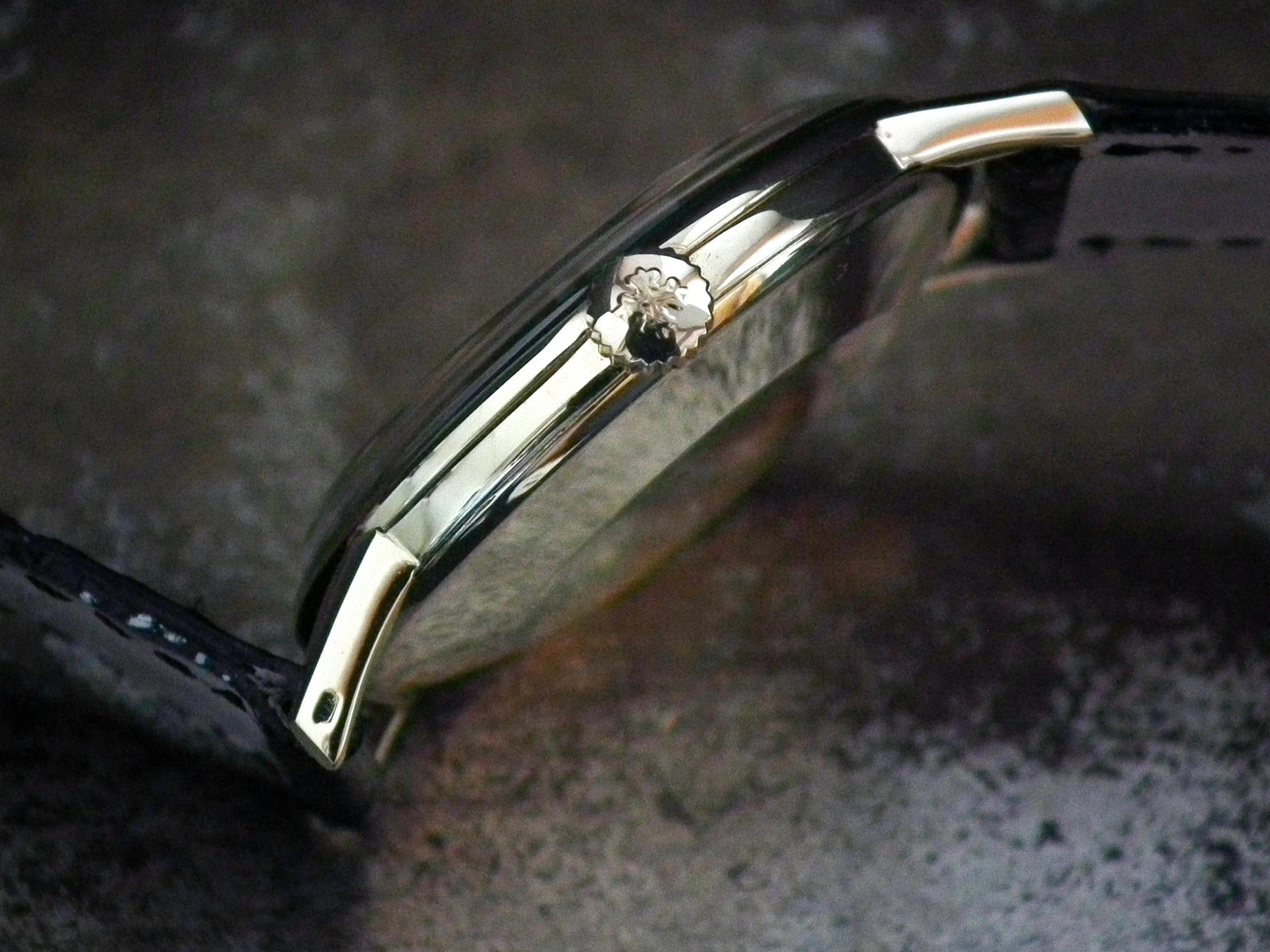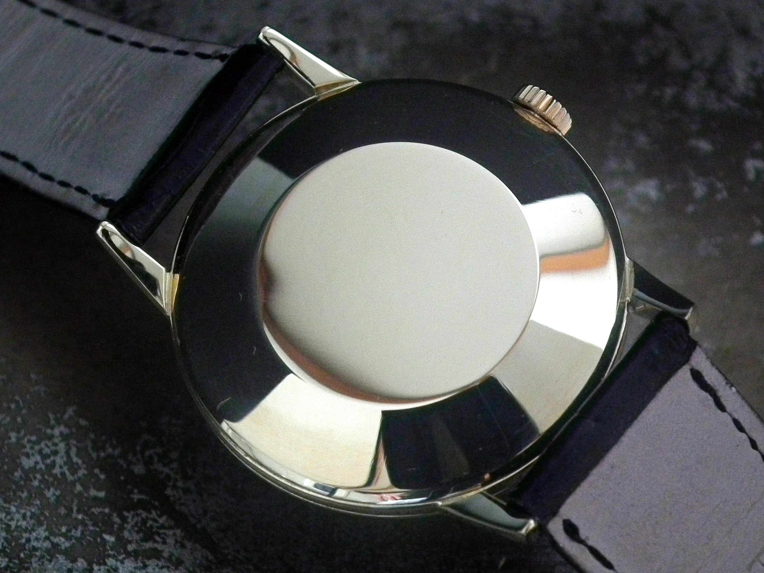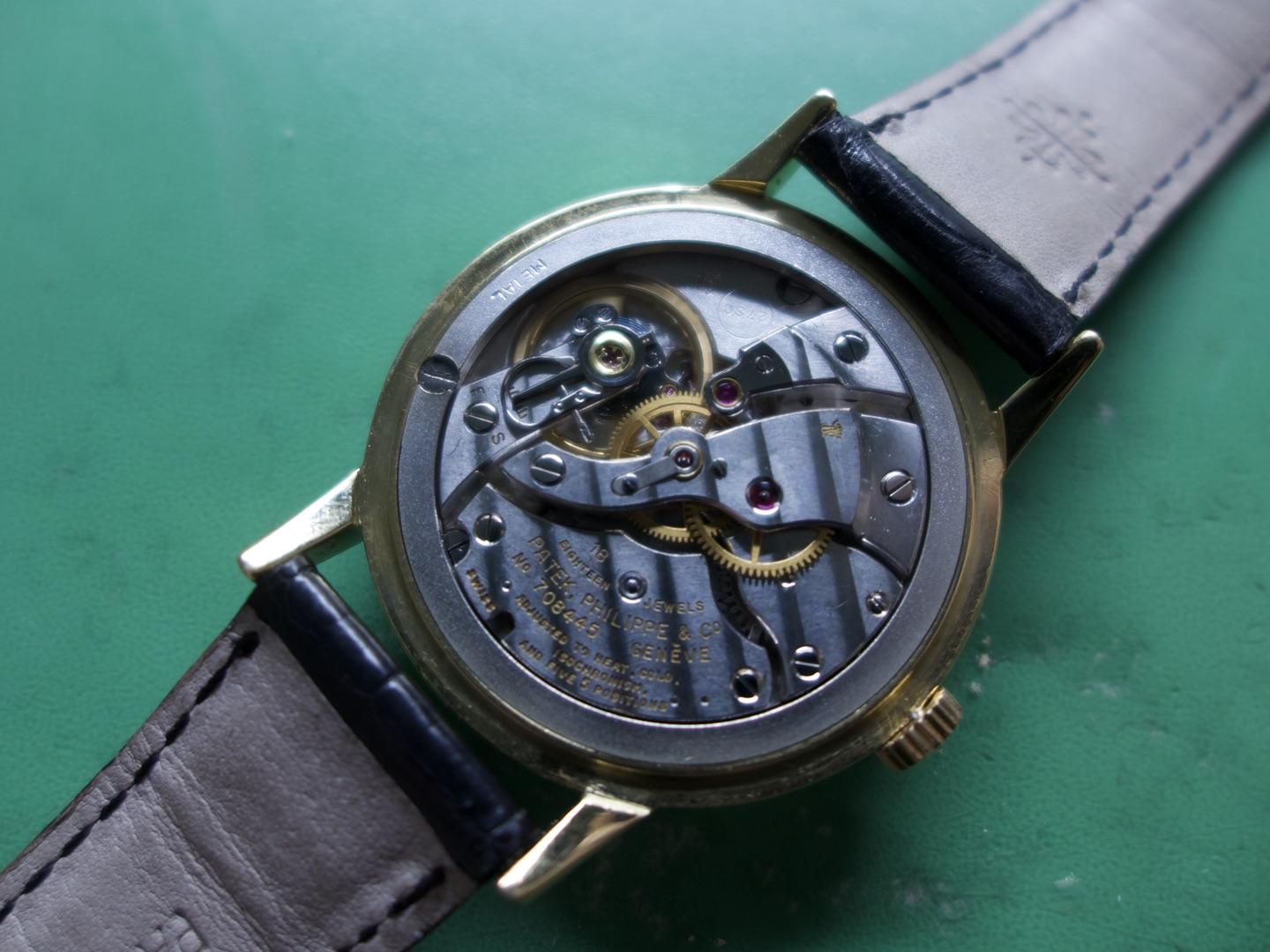 This is a wonderful example of the larger size Patek Philippe from 1960. Measuring just under 35mm excluding the Patek Philippe signed winding crown when the average size of Patek at this time was 32/33mm….. The solid 18ct yellow gold Patek signed case is in excellent condition with only the most minor signs of wear. The original and untouched Patek signed steel/silver dial is in excellent condition with only minor signs of fading around some of the batons – ‘3’ and ‘5’ in particular but this is hard to see with the naked eye. The super high grade Patek signed manual wind movement is again in excellent condition and has just been fully serviced by our professional watchmaker (the movement pictures were taken by our watchmaker). The watch sits on a new black Patek Philippe crocodile skin strap with new solid 18ct gold Patek signed buckle (£1,150…). We also have a genuine period correct Patek box (scabby on the inside) with the cardboard outer box. We also have the Patek Philippe Extract of Archives.
