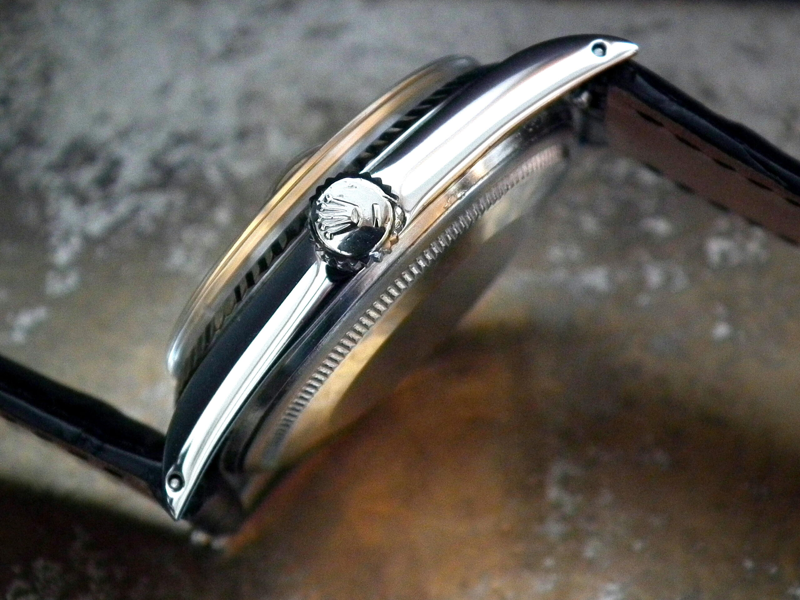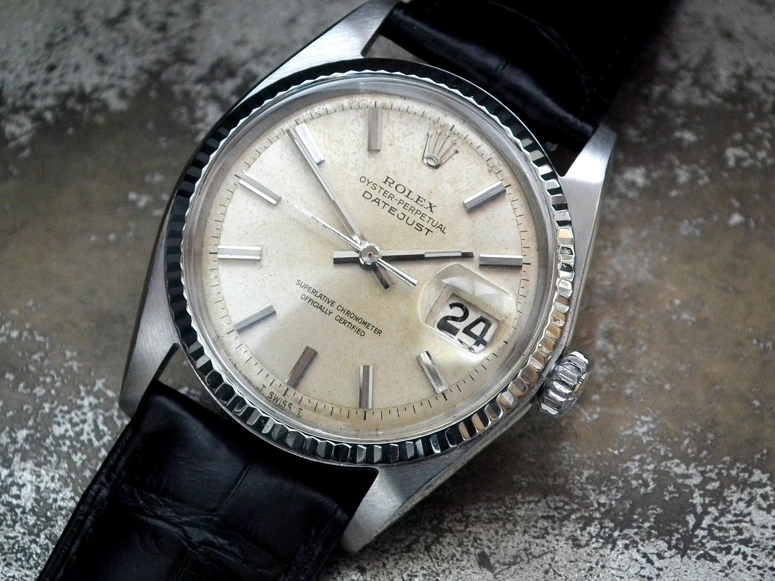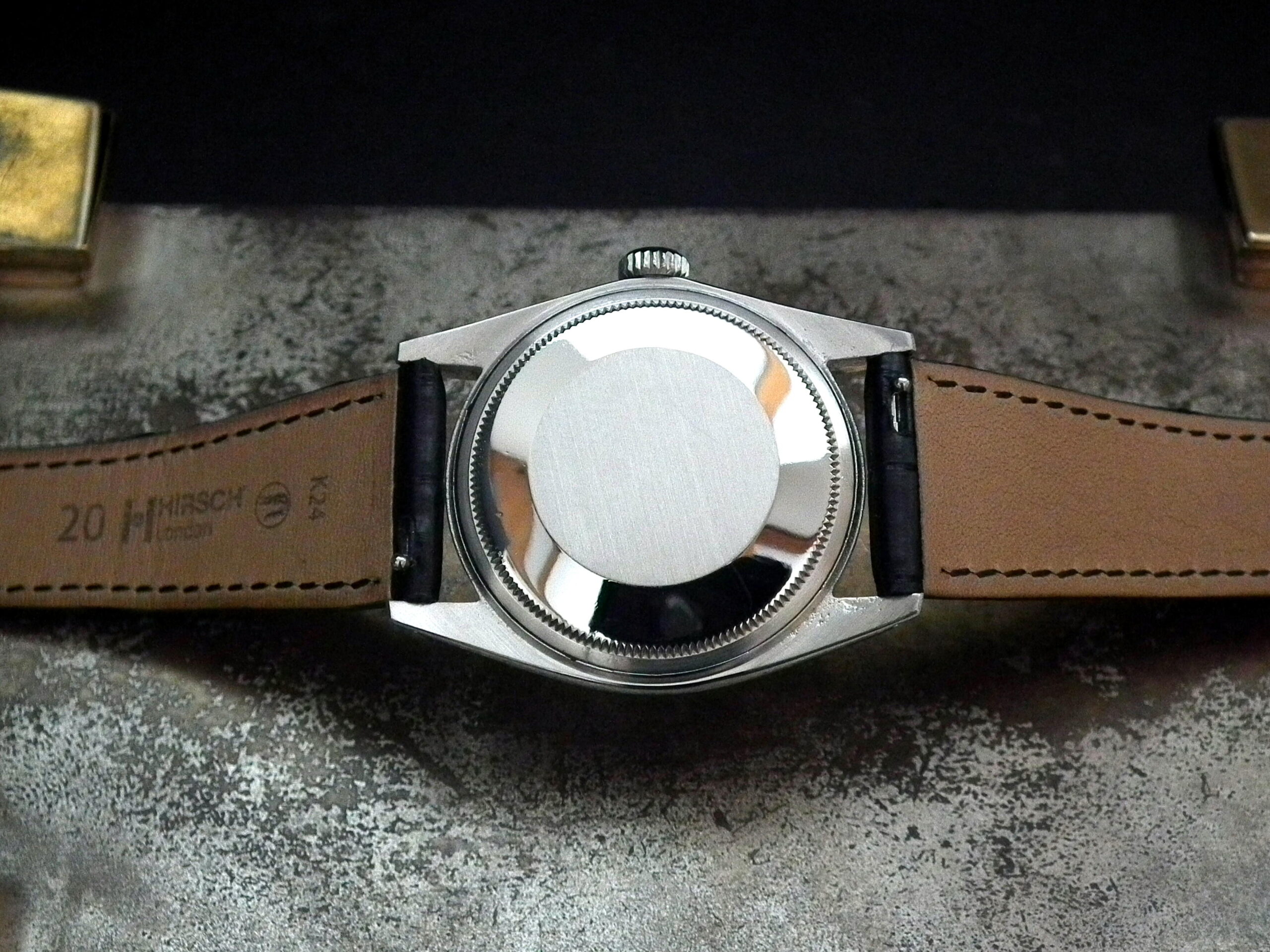 This is a wonderful example of an untouched Datejust from 1967. The steel and solid white gold (fluted bezel) case is in excellent condition with only minor signs of wear and corrosion around the back of the case where the case back sits. The original Rolex signed dial has aged beautifully to a tropical ivory/cream and looks stunning. The serial number is very difficult to read due to wear and corrosion but the case back confirms it’s a 1967. The very high grade chronometer standard Rolex signed automatic movement is in excellent condition and has just been fully serviced by our professional watchmaker. The watch sits on a new, super high quality, black Hirsch ‘London’ alligator strap with a steel Hirsch buckle.