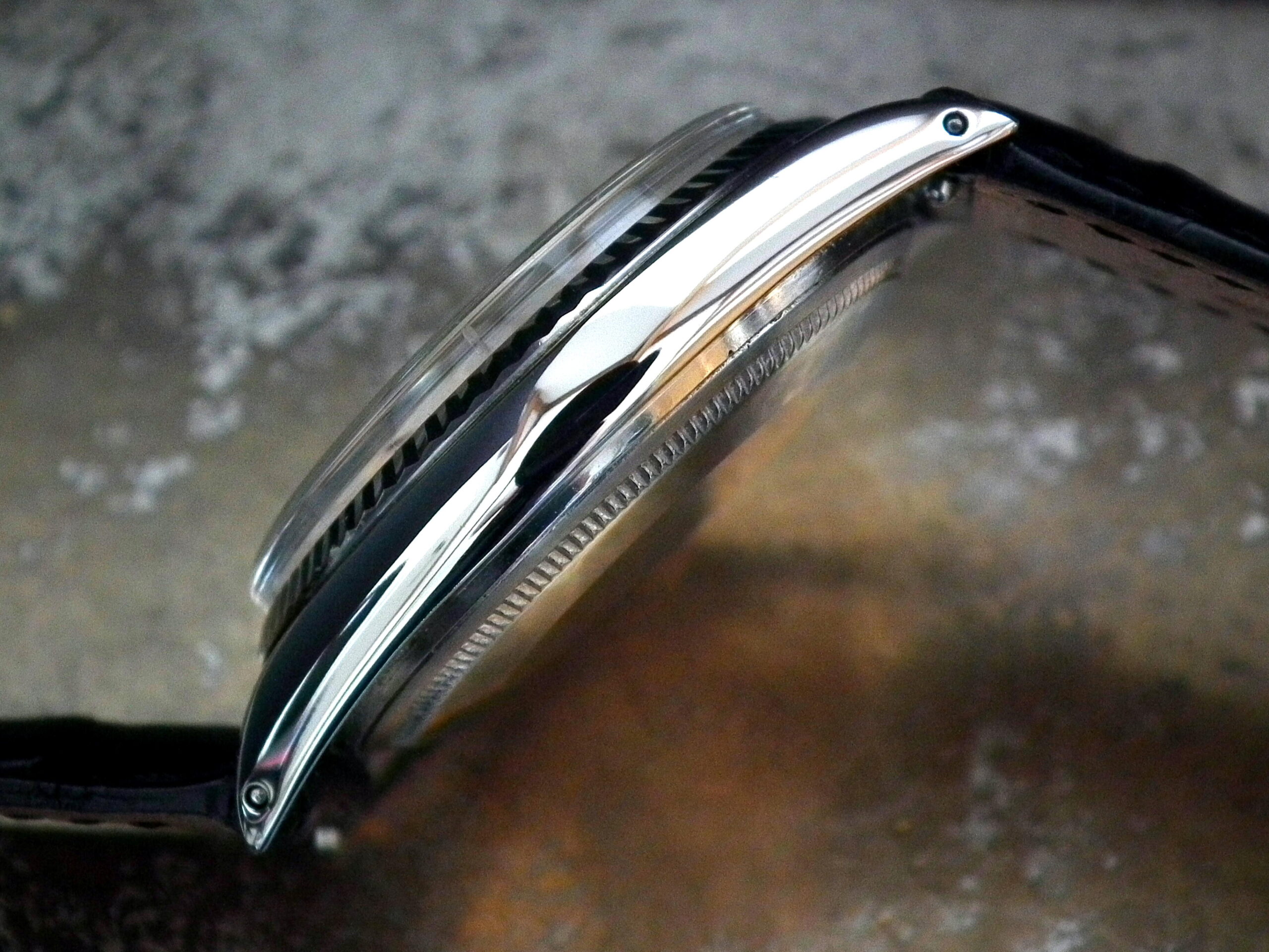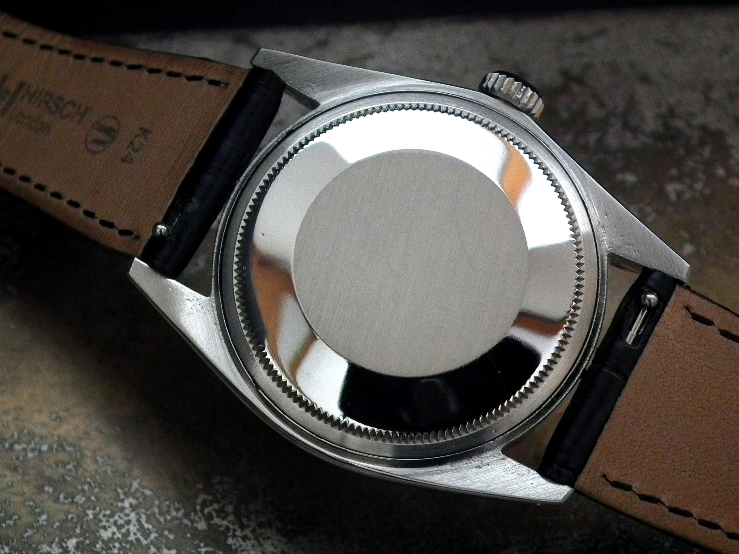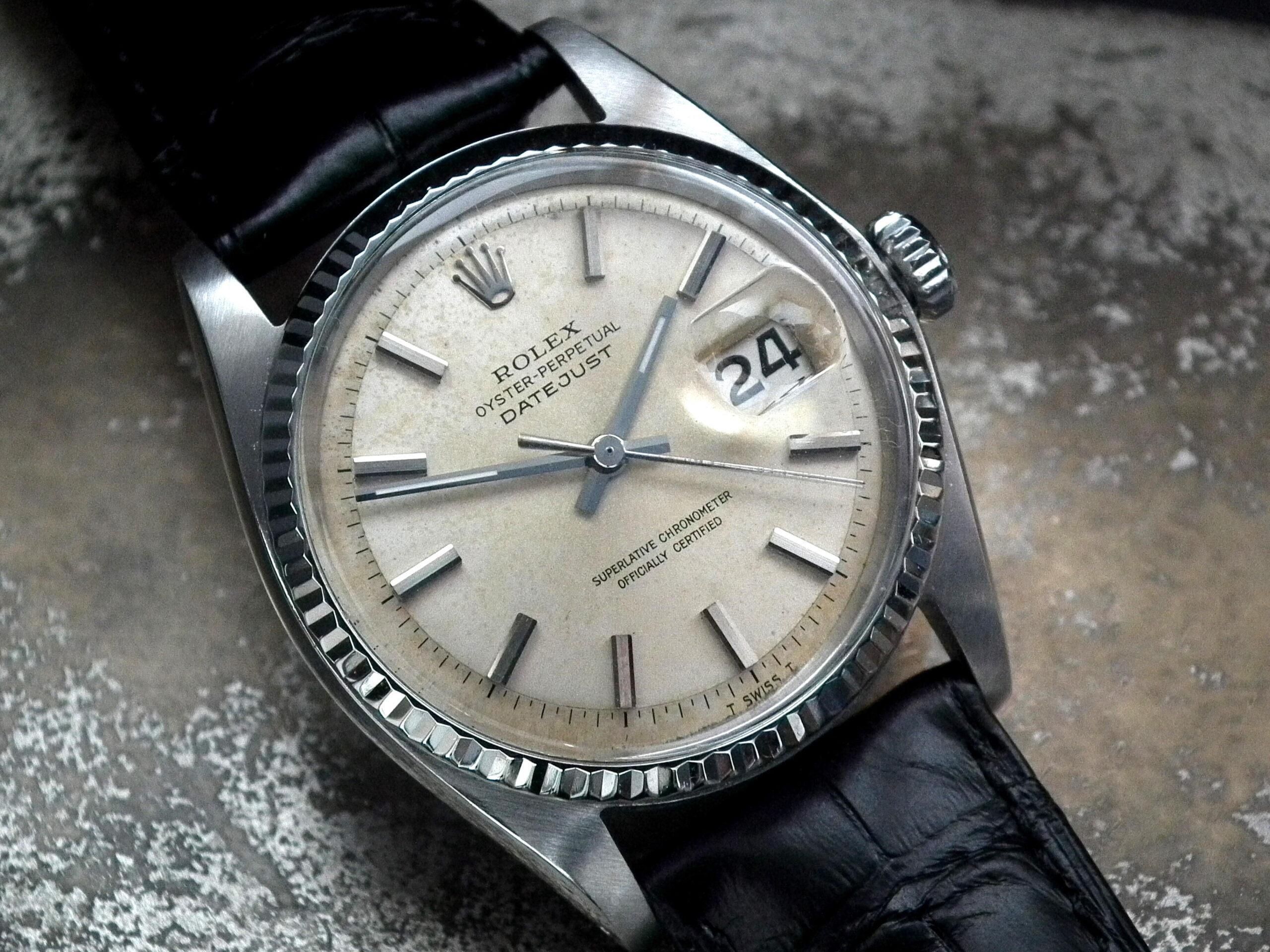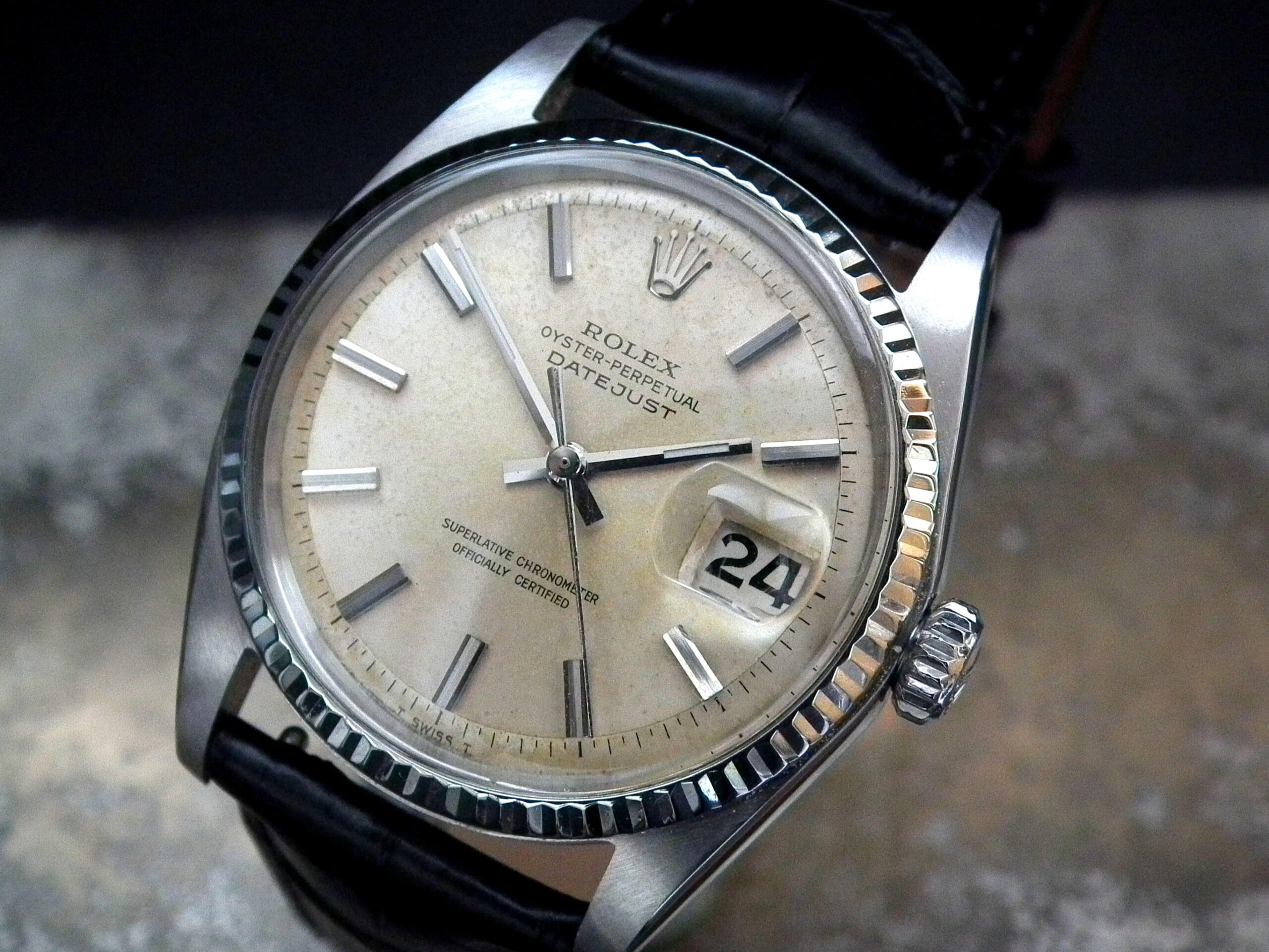 This is a wonderful example of an untouched Datejust from 1967. The steel and solid white gold (fluted bezel) case is in excellent condition with only minor signs of wear and corrosion around the back of the case where the case back sits. The original Rolex signed dial has aged beautifully to a tropical ivory/cream and looks stunning. The serial number is very difficult to read due to wear and corrosion but the case back confirms it’s a 1967. The very high grade chronometer standard Rolex signed automatic movement is in excellent condition and has just been fully serviced by our professional watchmaker. The watch sits on a new, super high quality, black Hirsch ‘London’ alligator strap with a steel Hirsch buckle.