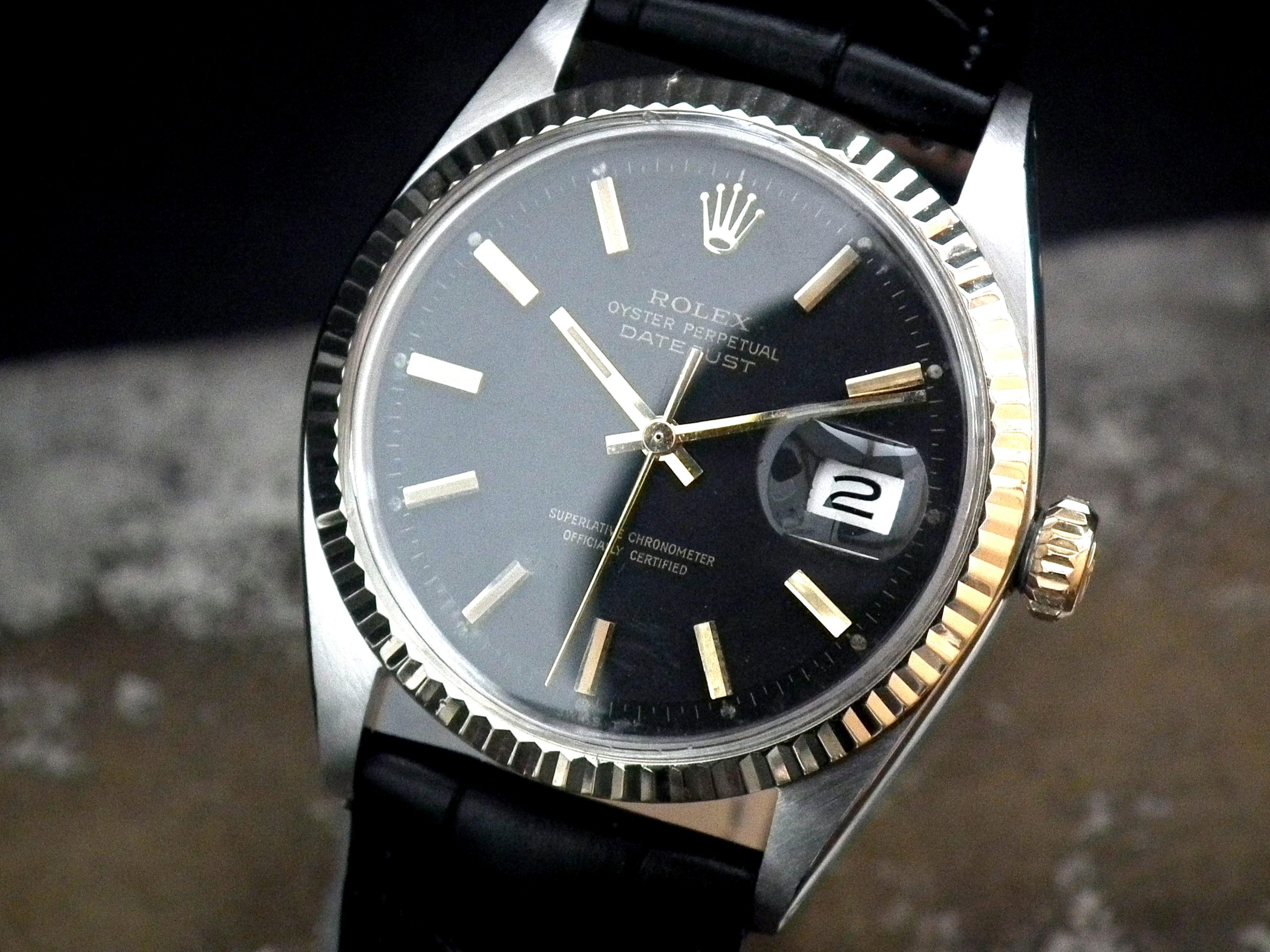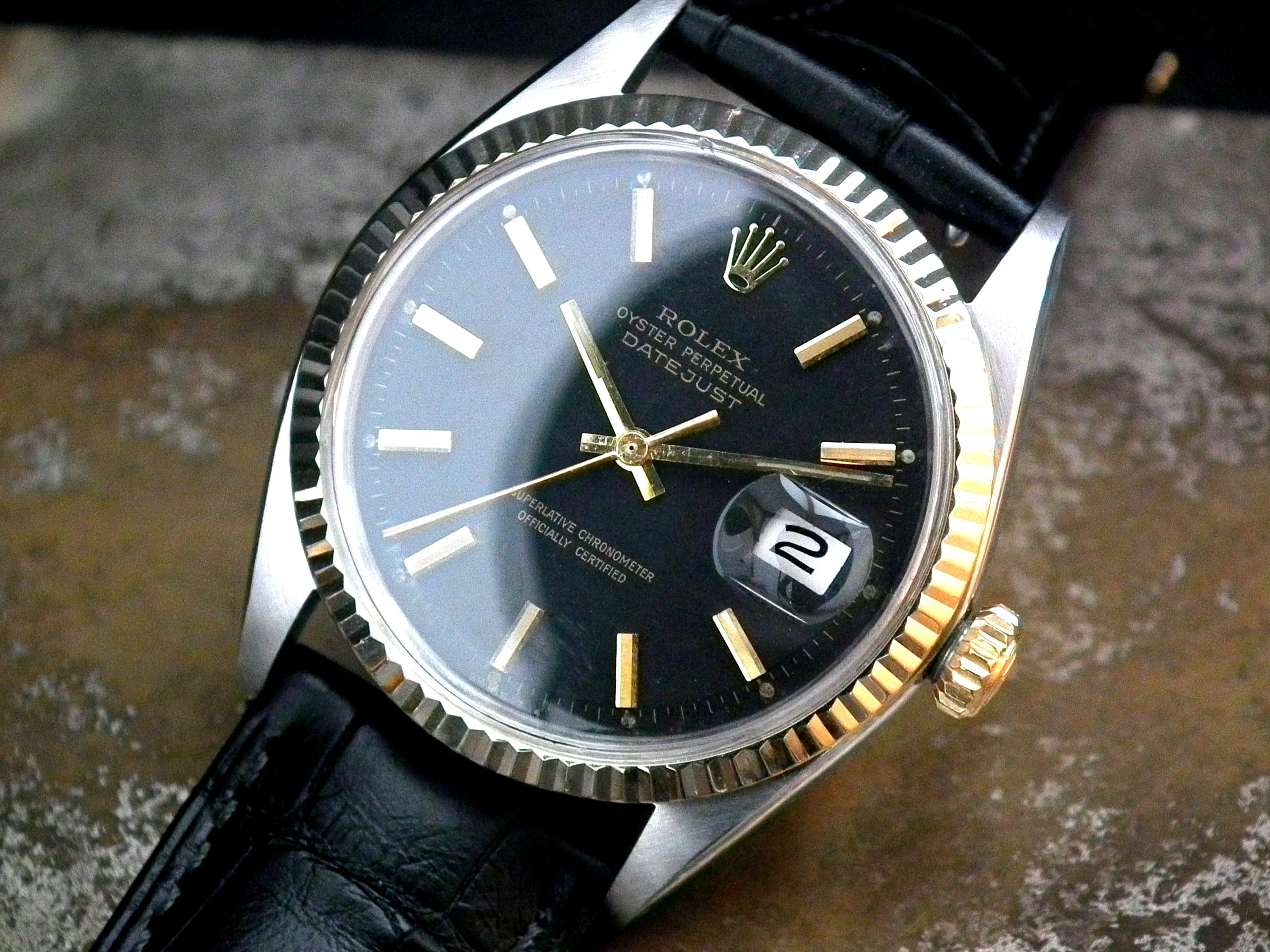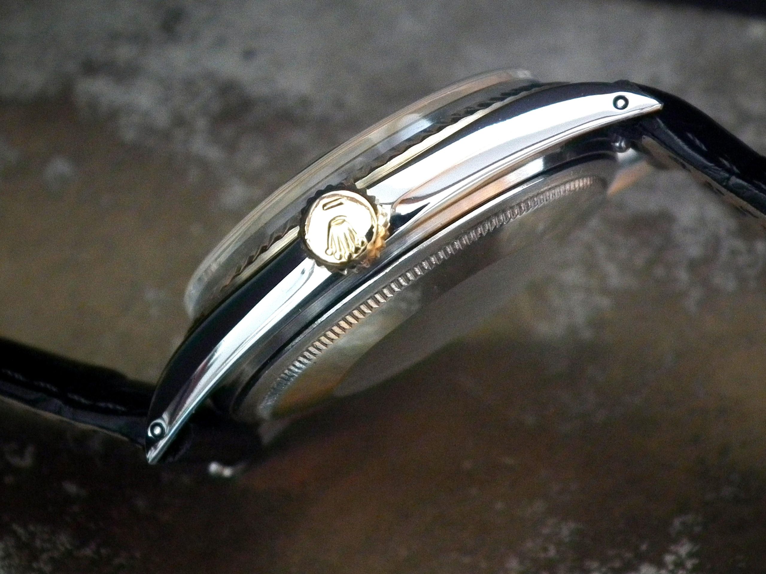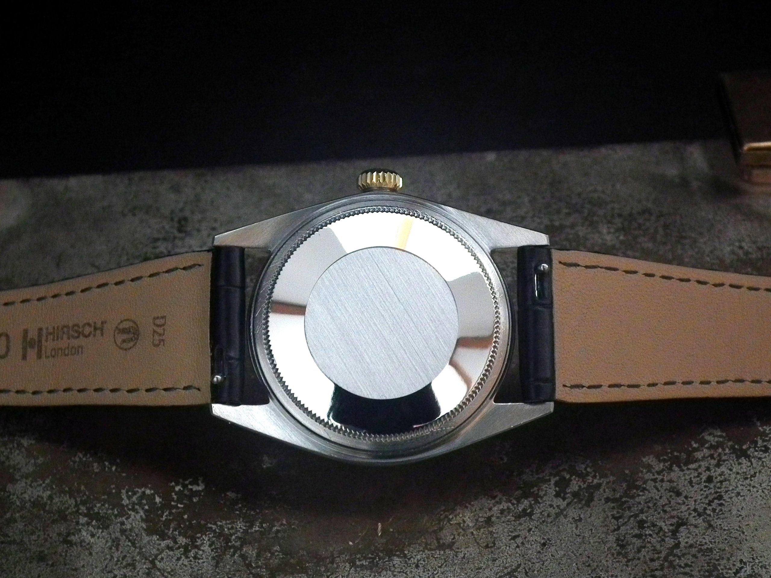 This is a beautiful example of the iconic Rolex Datejust from 1968. The steel and solid gold (fluted bezel) case is in near flawless condition with only the most minor signs of wear. The original jet black Rolex signed dial is in very good condition (please disregard the small spec around the ‘9’ baton, the joys of photographing black dial watches; just a spec of dust). The super high grade chronometer standard Rolex automatic movement is again in very good condition and has just been fully serviced by our professional watchmaker. The watch sits on a new, super high quality, black Hirsch ‘London’ alligator strap with gold plated Hirsch buckle.