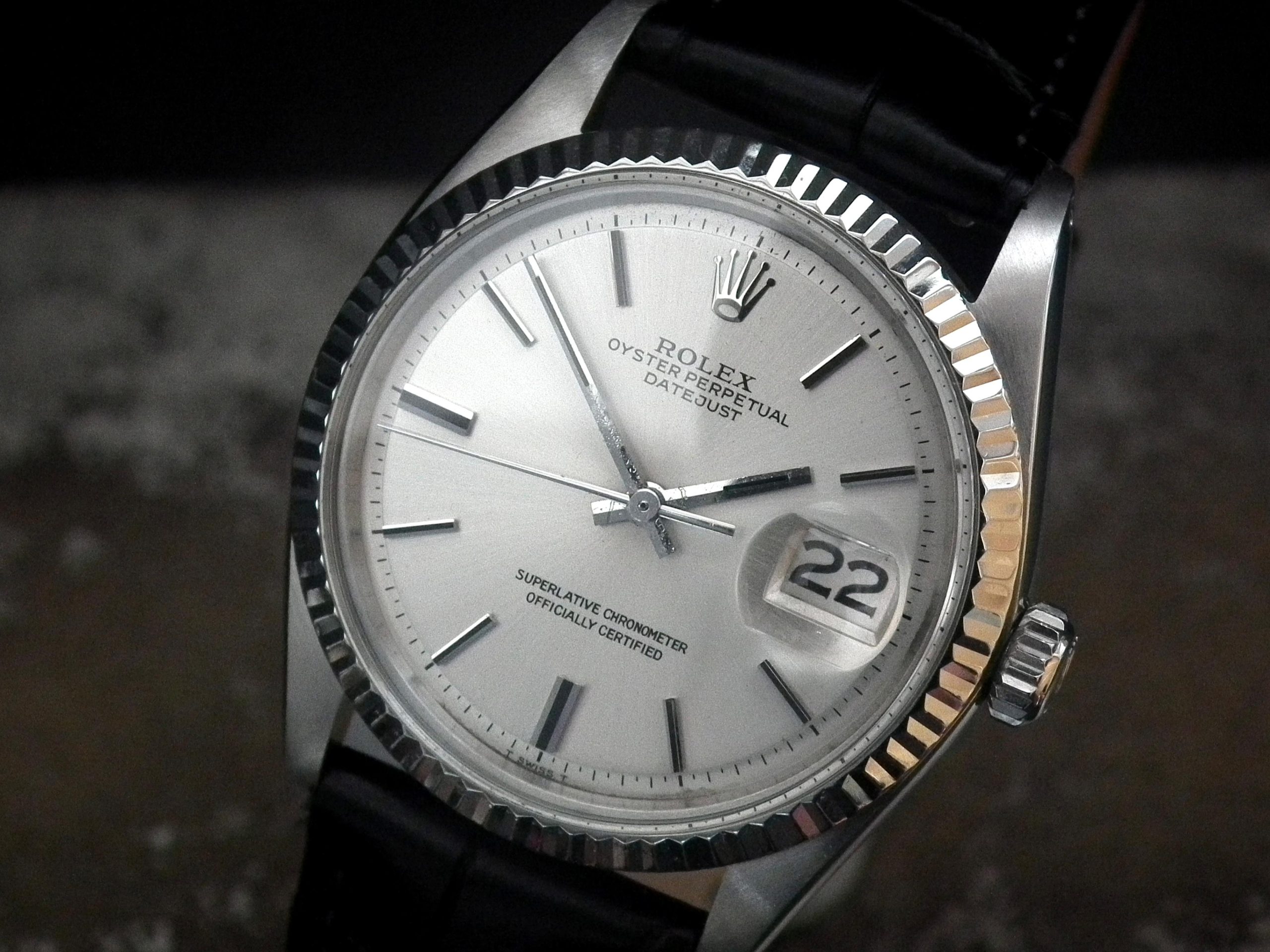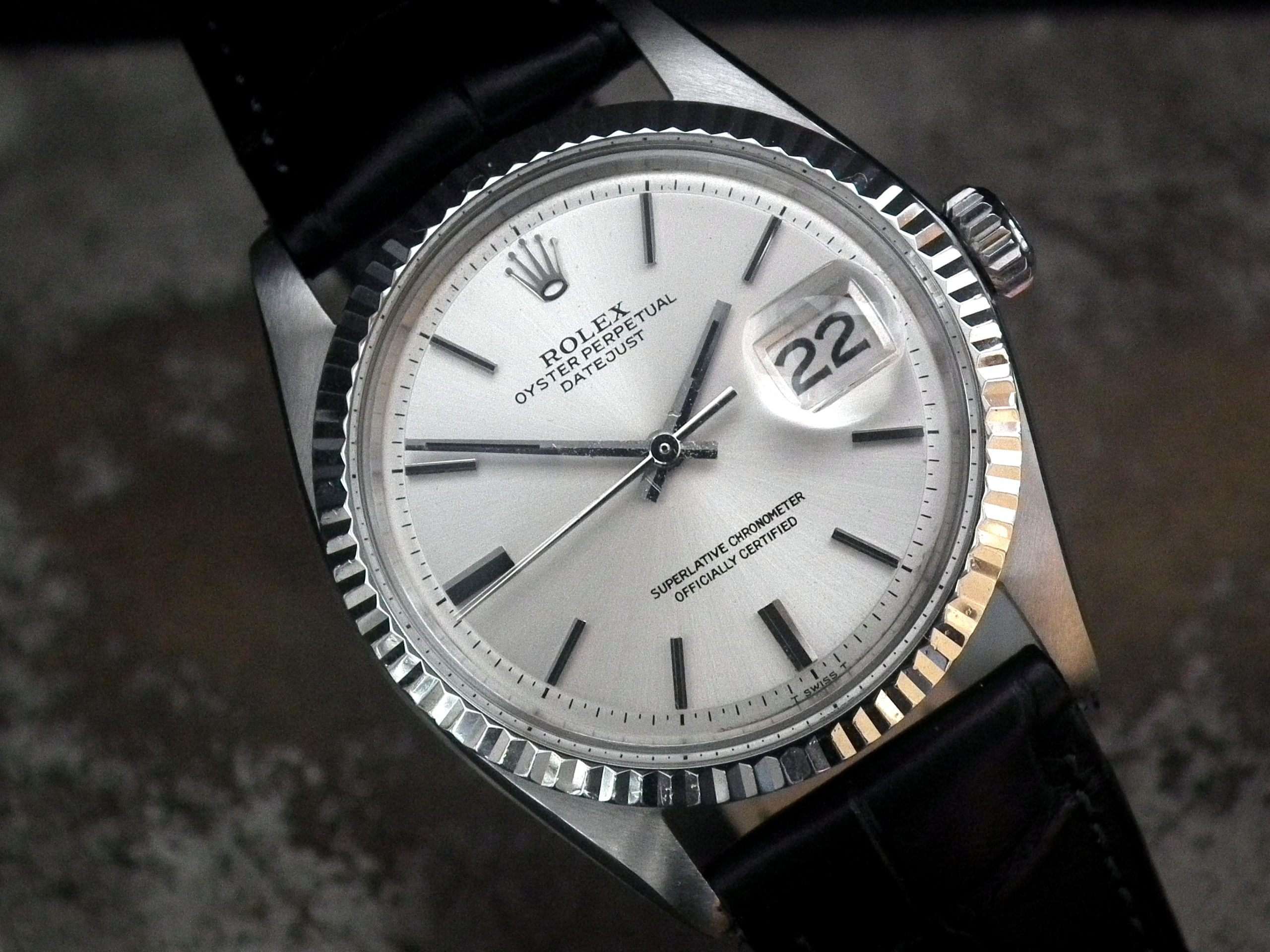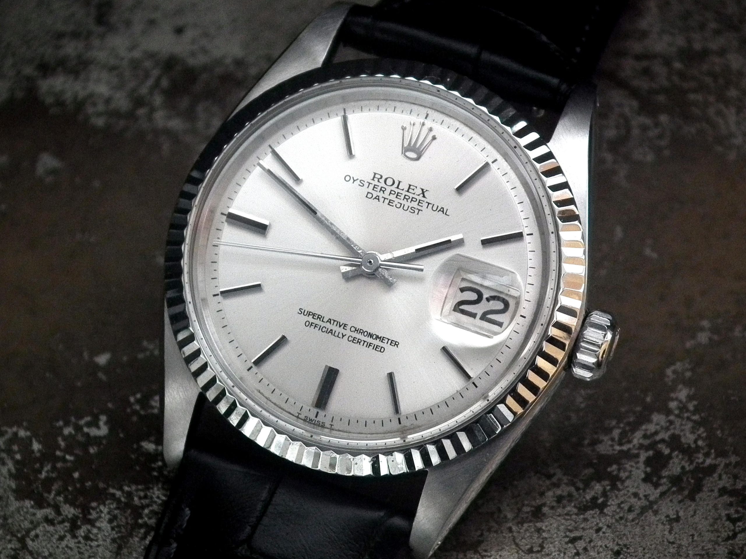 This is a beautiful example of the iconic Rolex Datejust from 1970. The steel and solid gold (fluted bezel) case is in near faultless condition with only the most minor signs of wear. The original Rolex signed steel pearlescent dial is again in excellent condition with only some very minor paint missing at the very edge between the ‘5’ and ‘7’ batons (very hard to see with the naked eye). The very high grade chronometer standard Rolex signed automatic movement is again in excellent condition and has just been fully serviced by our professional watchmaker. The watch sits on a new, super high quality, black Hirsch ‘London’ alligator strap with a steel Hirsch buckle.