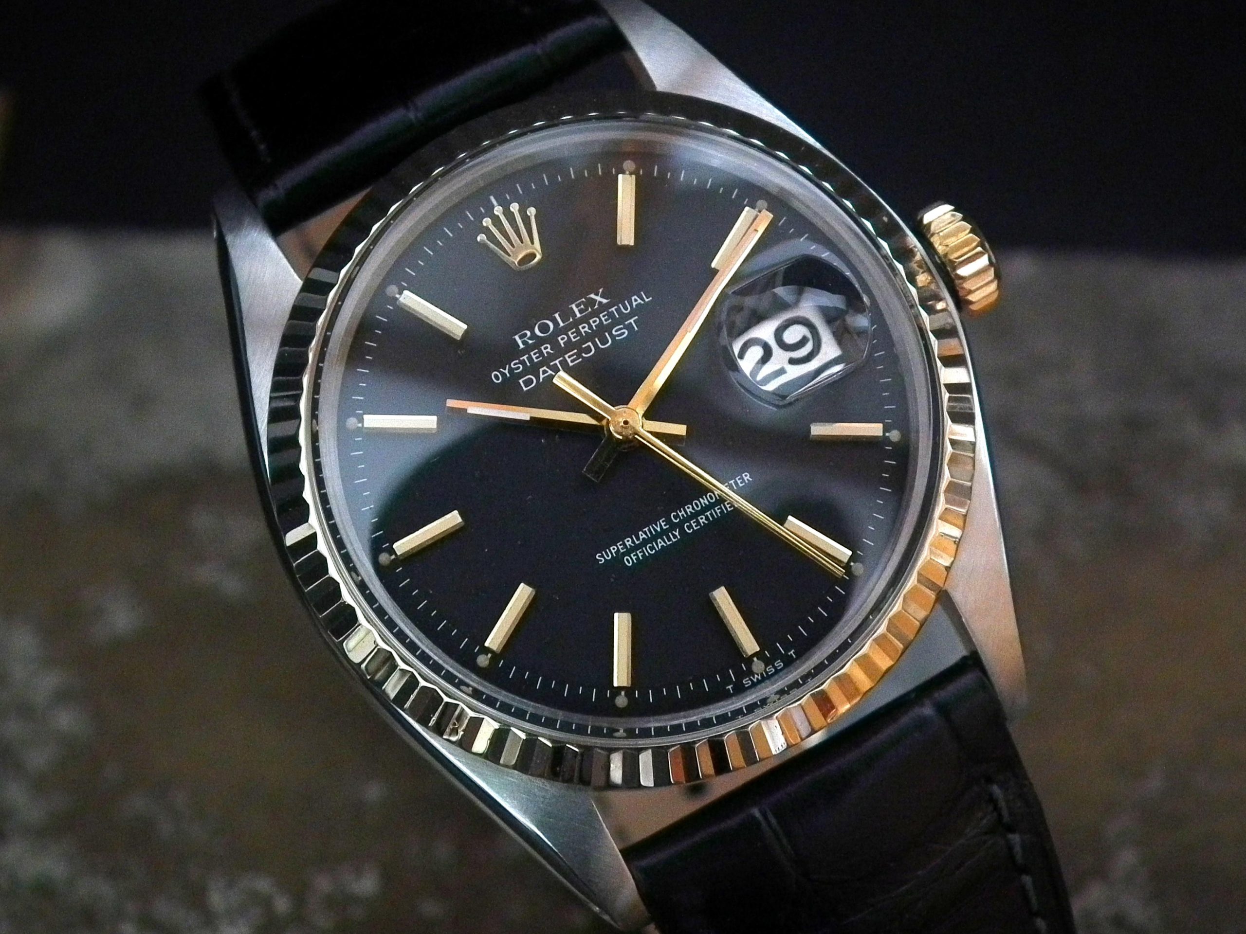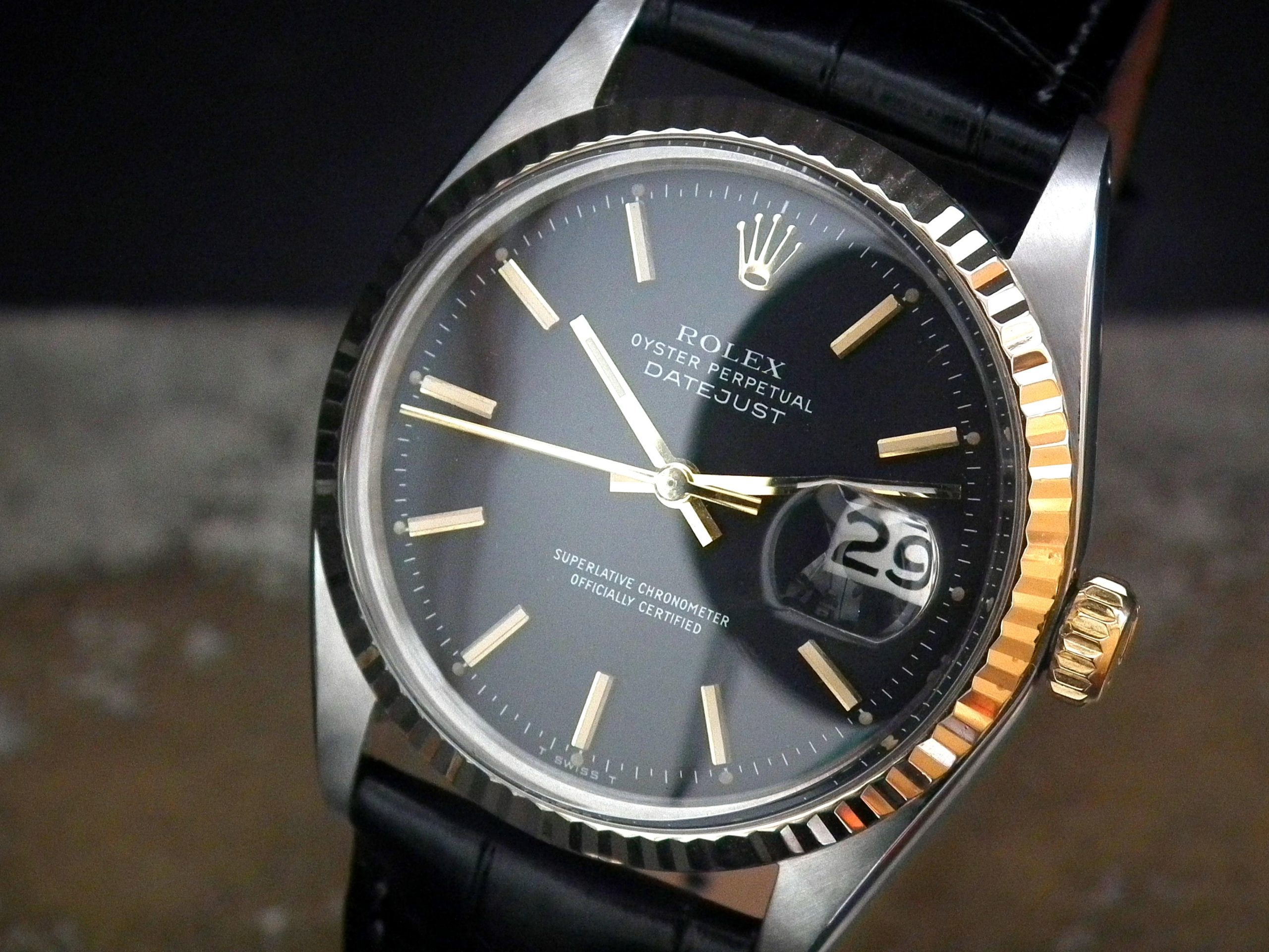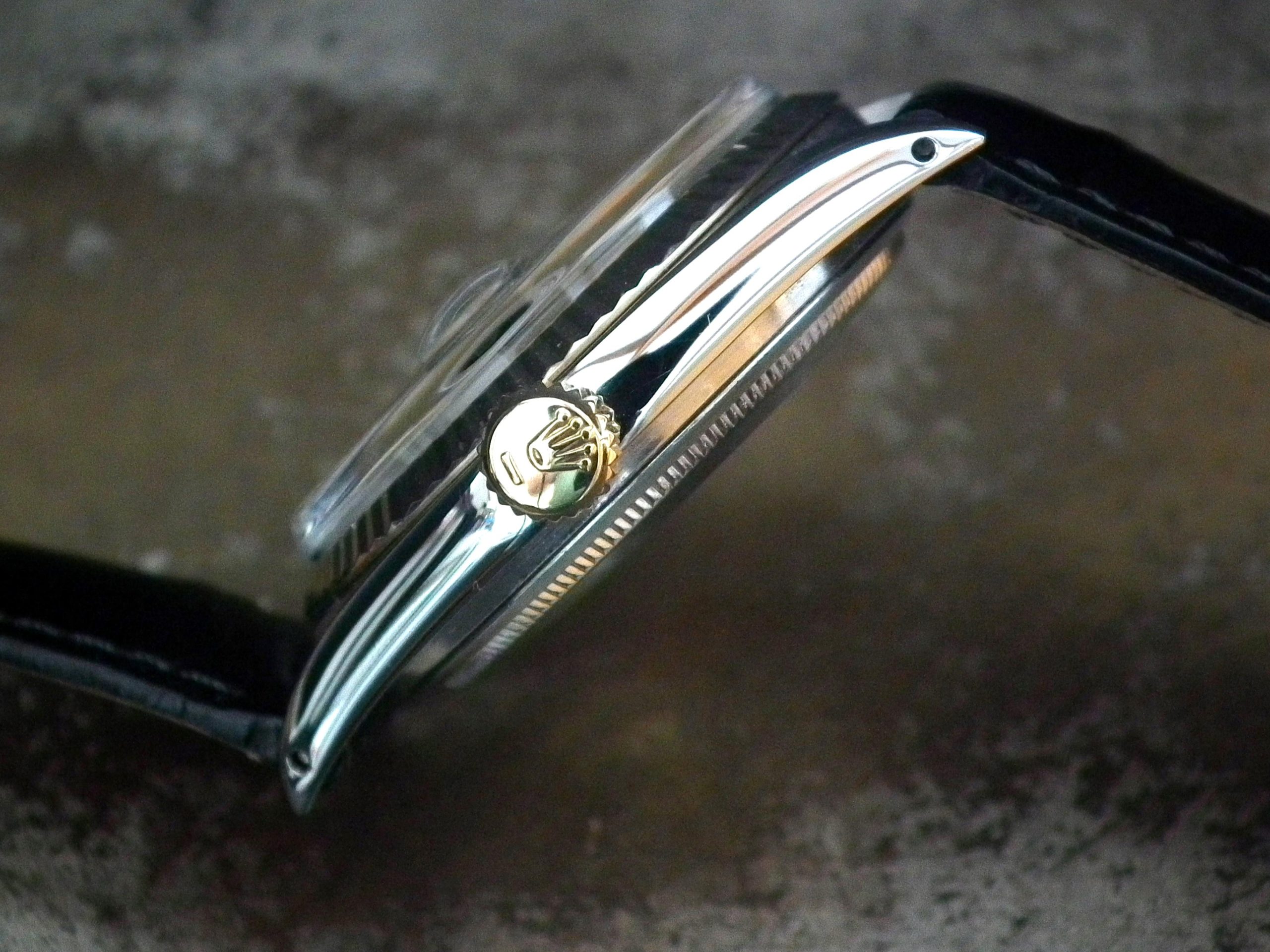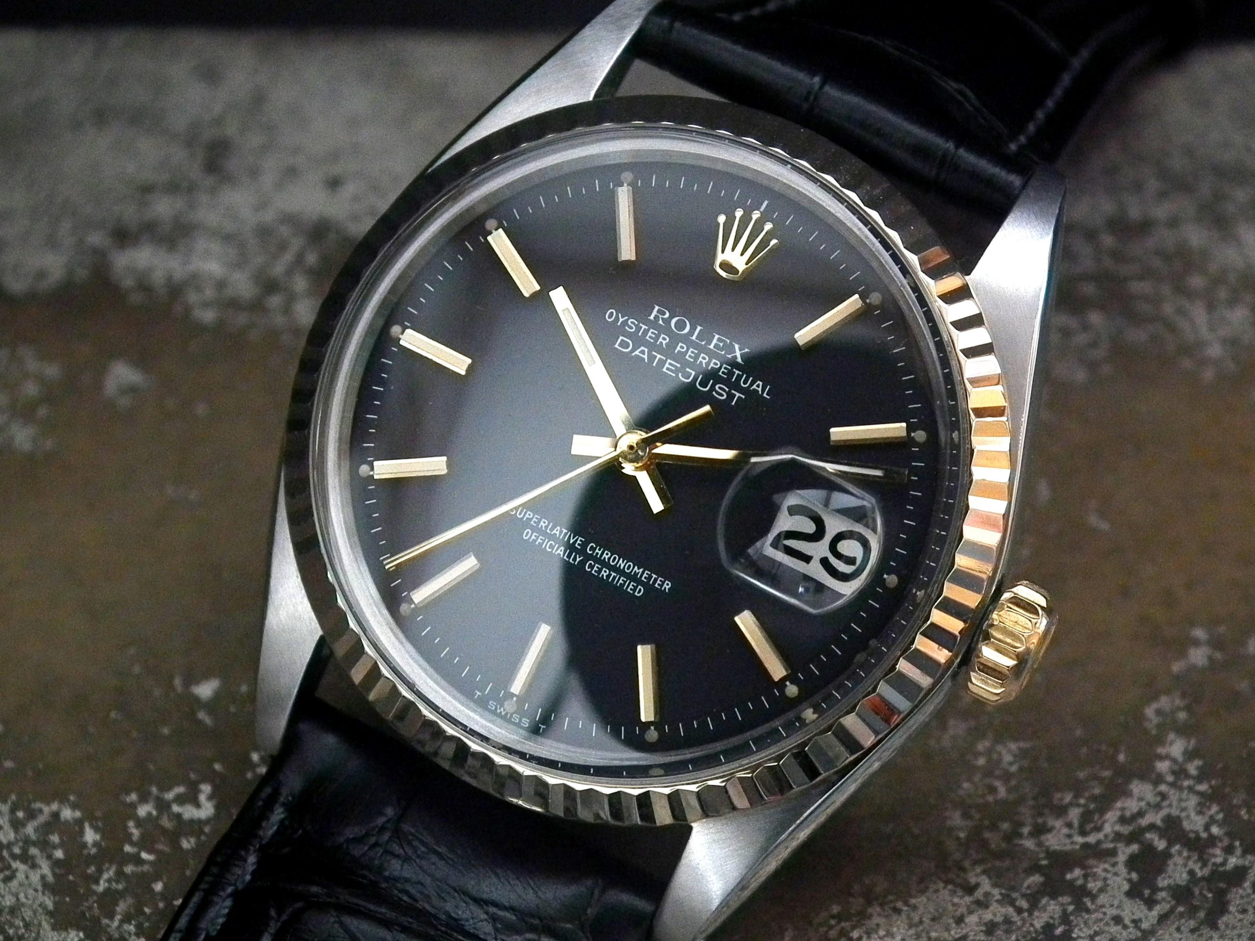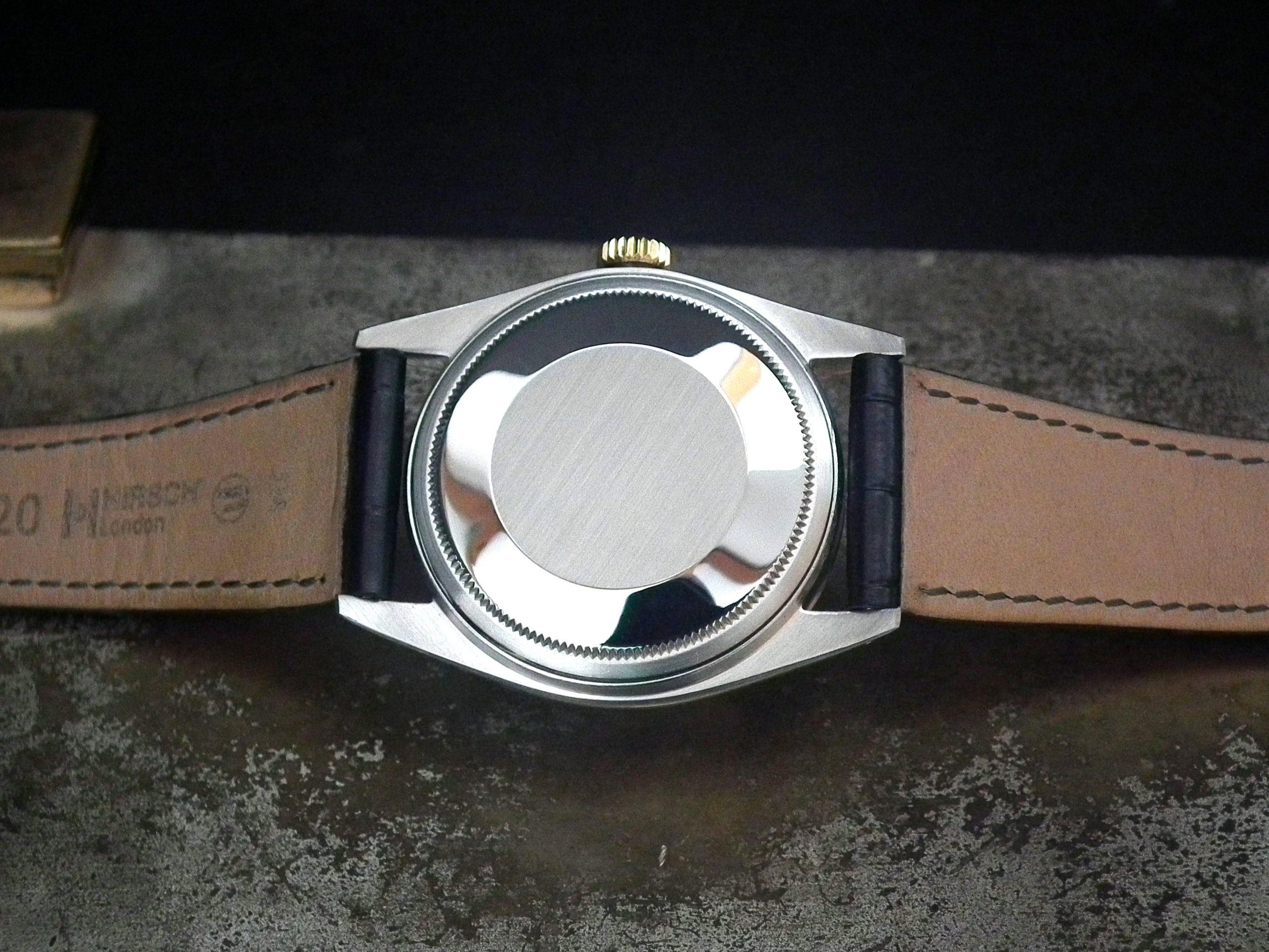 This is a beautiful example of the iconic Rolex Datejust from 1972. The steel and solid yellow gold (fluted bezel) case is in near faultless condition with only the most minor signs of wear. The original Rolex signed jet black dial is again in excellent condition. The applied gold batons and hands provide a stunning contrast to the black dial and are perfectly framed by the gleaming yellow gold fluted bezel. The very high grade chronometer standard Rolex signed automatic movement is again in excellent condition and has just been fully serviced by our professional watchmaker. The watch sits on a new, super high quality, black Hirsch ‘London’ alligator strap with gold plated Hirsch buckle.