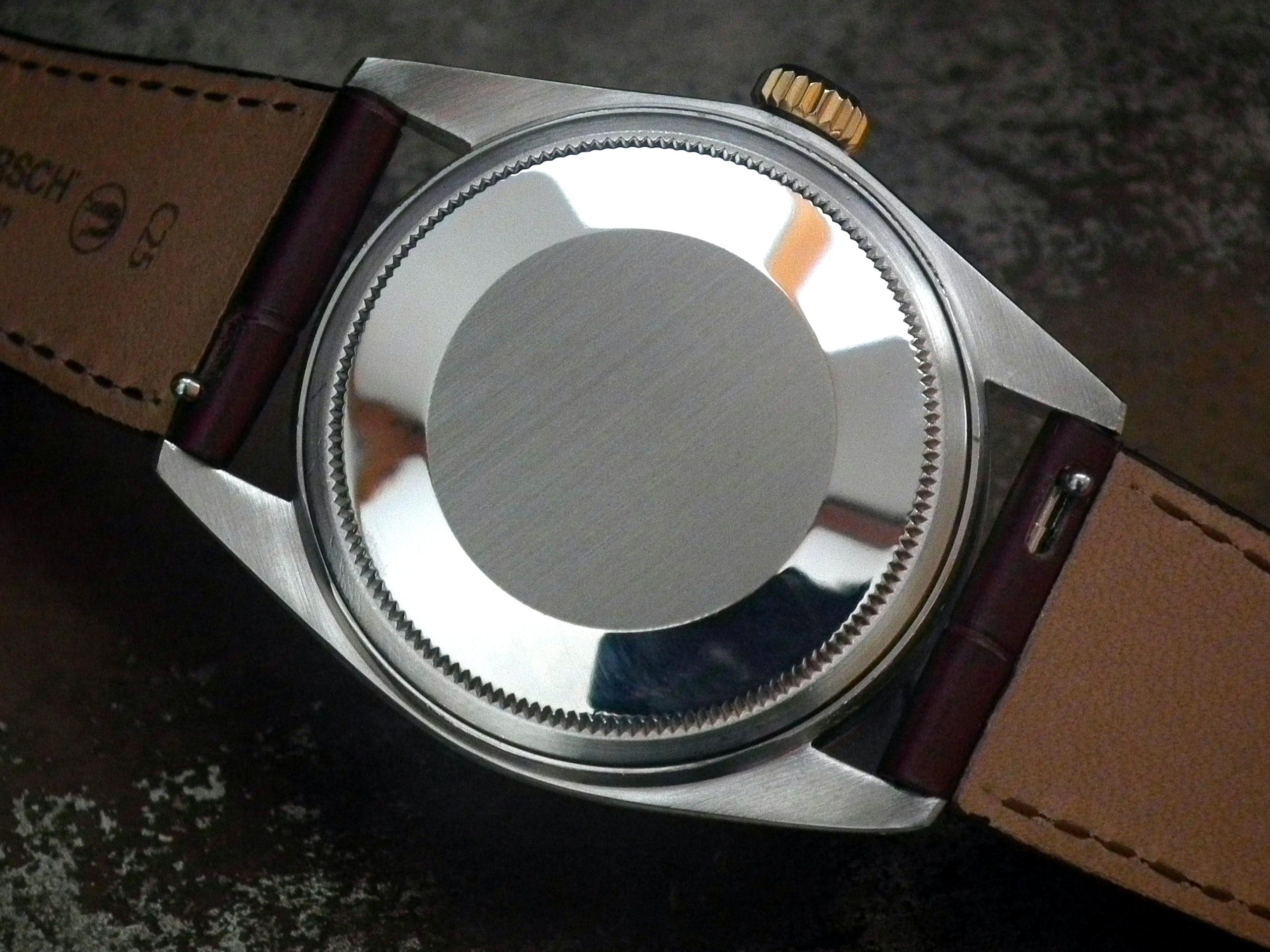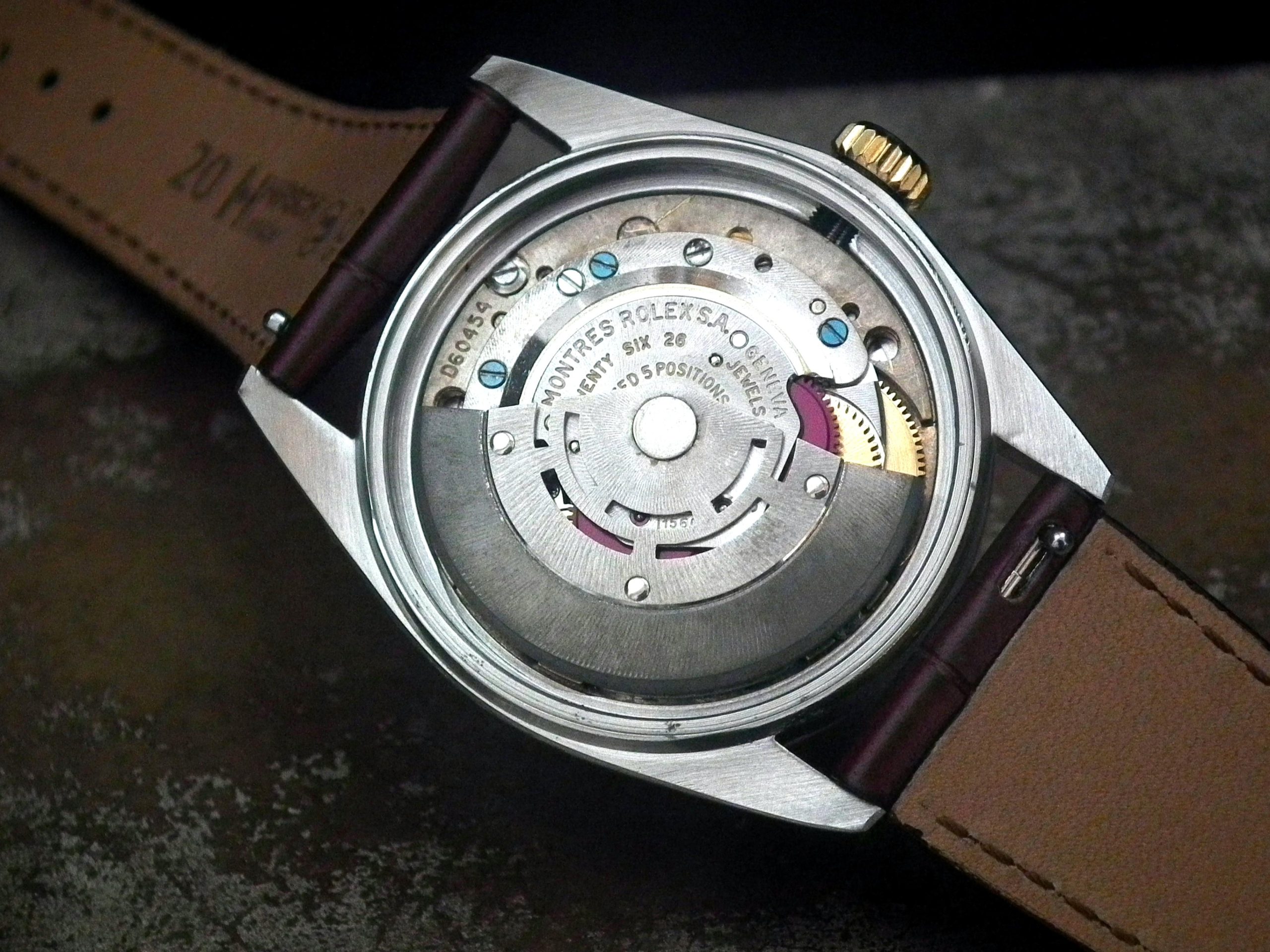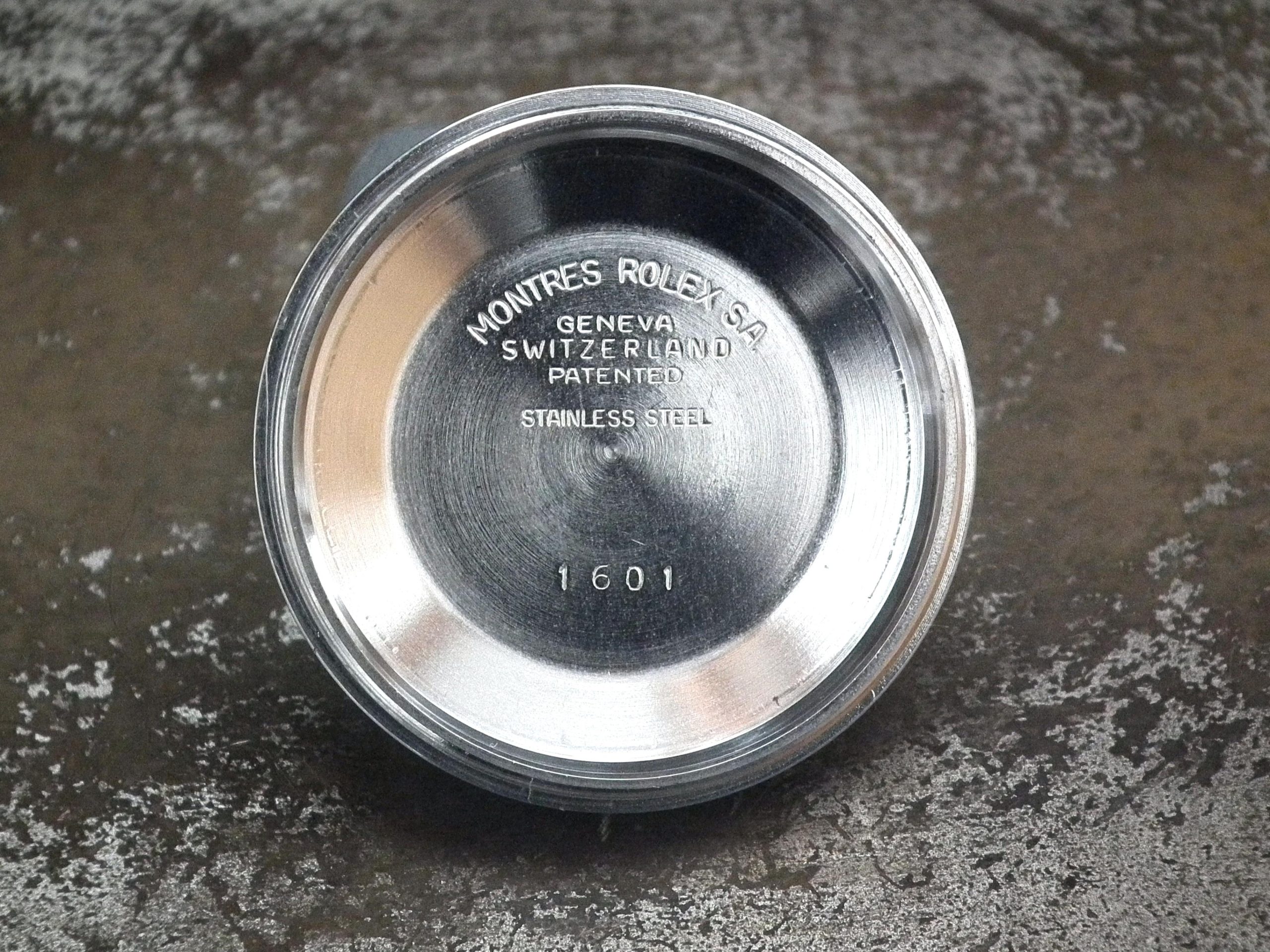The steel and solid gold (bezel) case is in excellent condition with only the most minor signs of wear. The case measures 36mm across, excluding the Rolex signed crown and 42mm long including the lugs. The inside case is signed ‘Montres Rolex SA Geneva Switzerland’, ‘Patented Stainless Steel’ and ‘1601’.