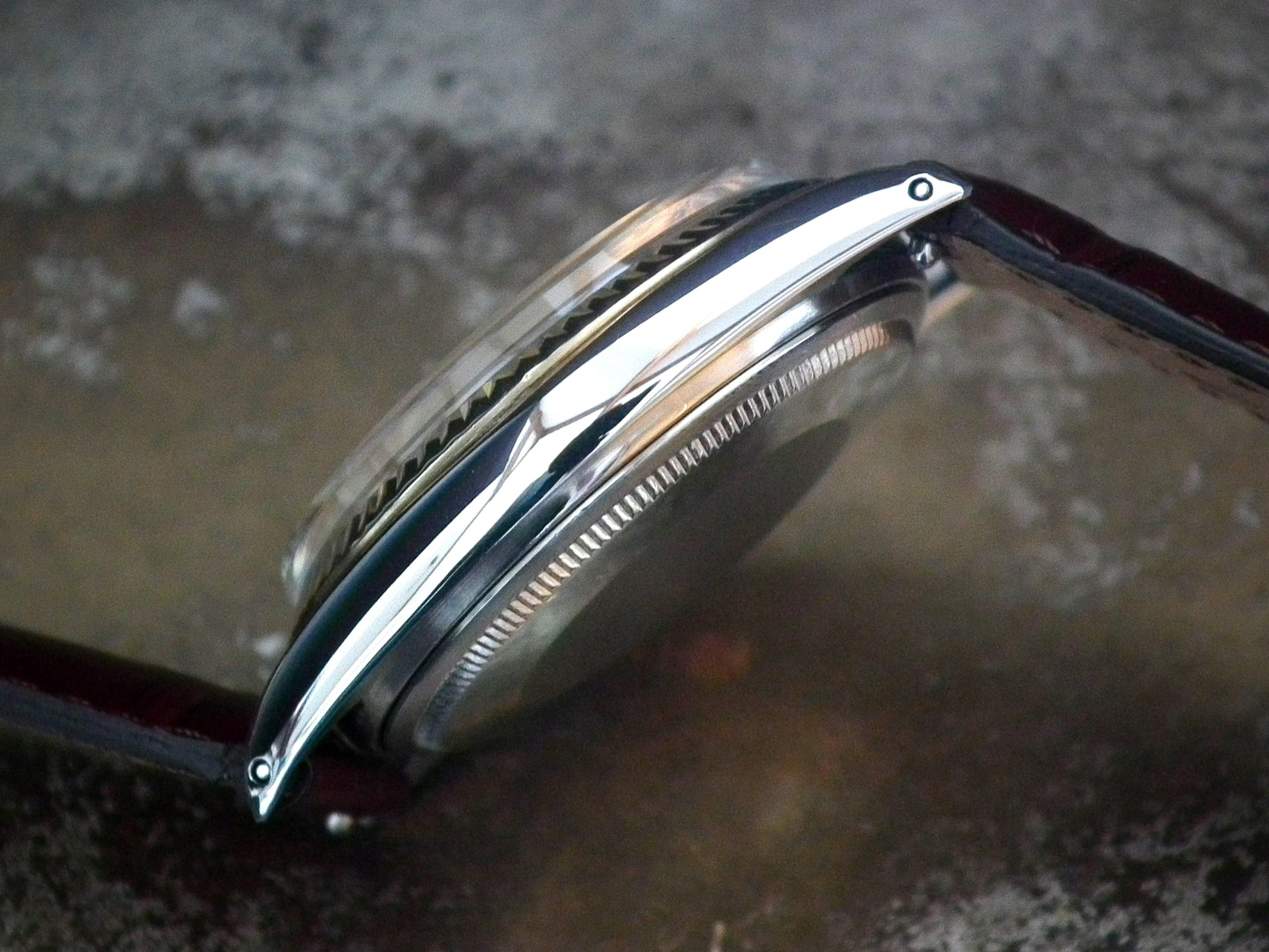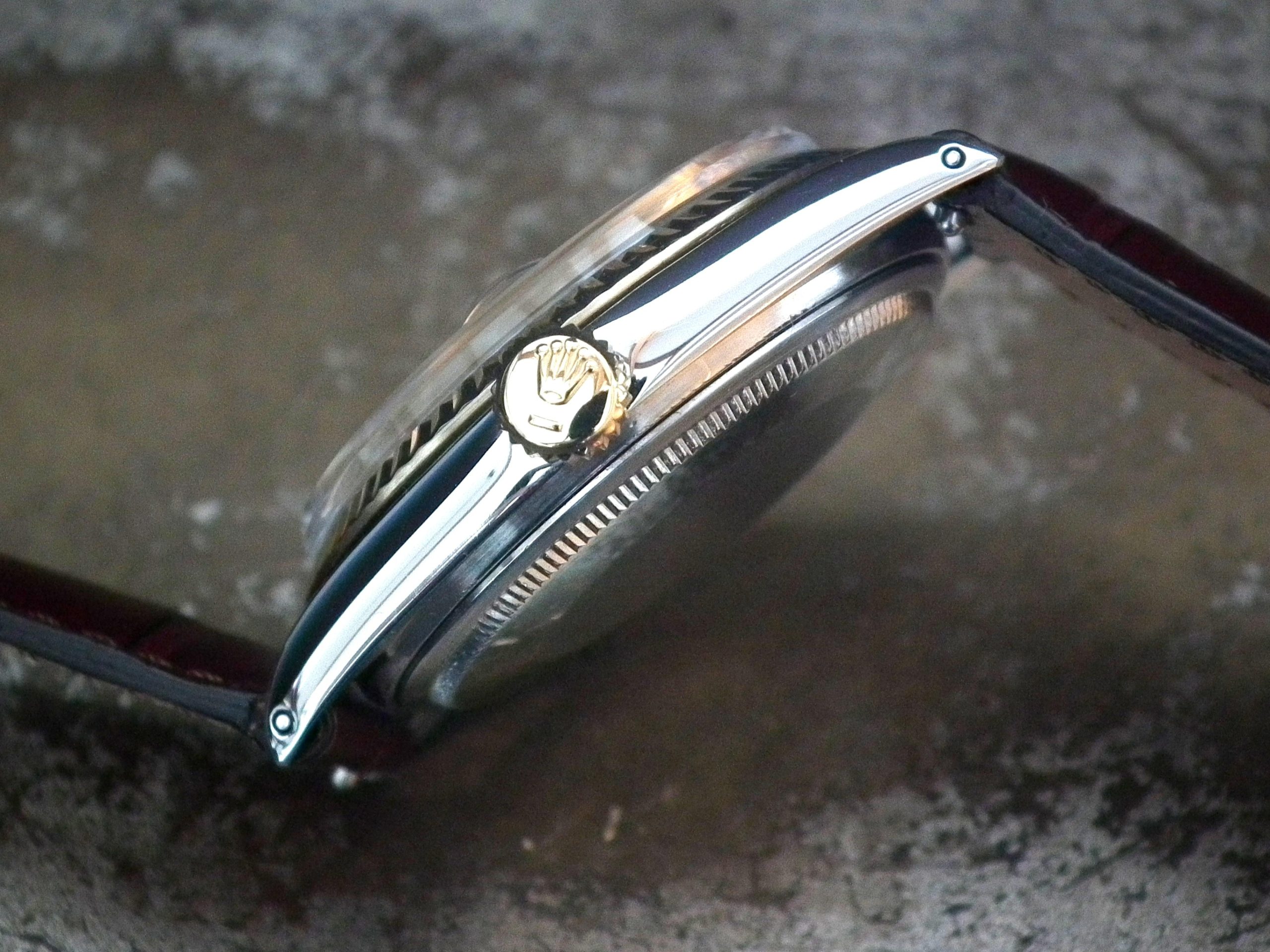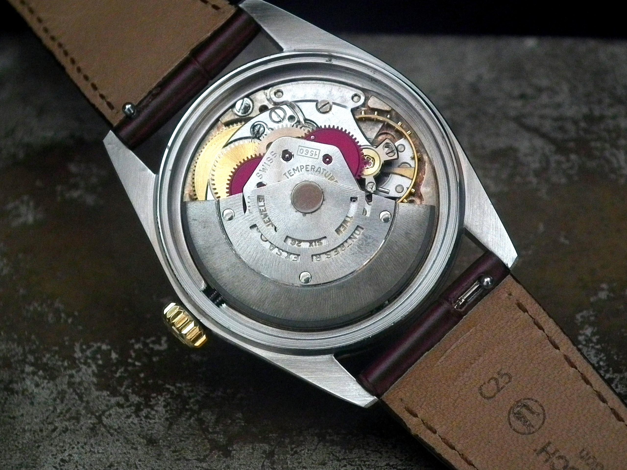 The steel and solid gold (bezel) case is in excellent condition with only the most minor signs of wear. The case measures 36mm across, excluding the Rolex signed crown and 42mm long including the lugs. The inside case is signed ‘Montres Rolex SA Geneva Switzerland’, ‘Patented Stainless Steel’ and ‘1601’.