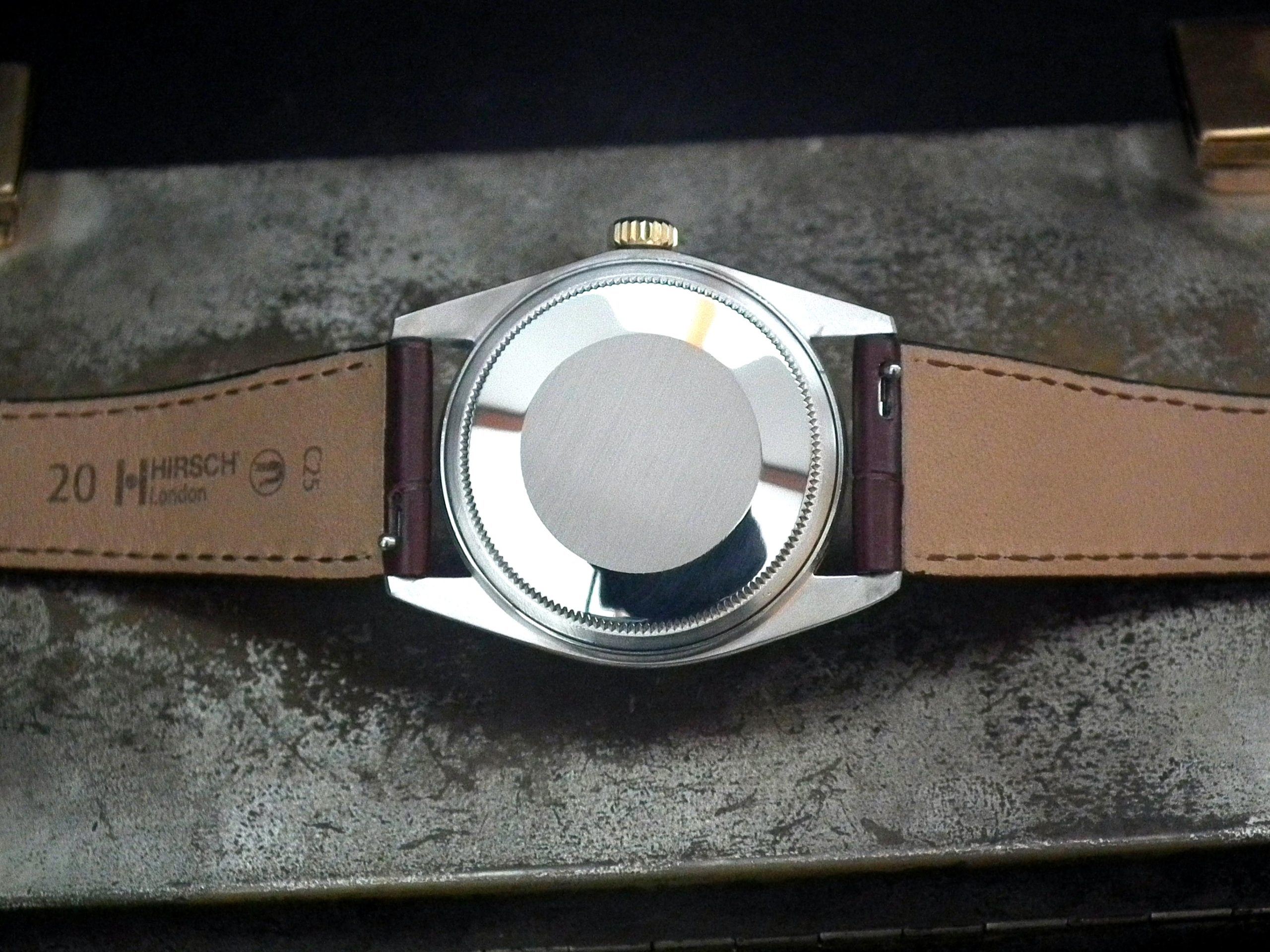 This is a beautiful example of the iconic Rolex Datejust from 1974. The steel and solid gold (bezel) case is in excellent condition with only the most minor signs of wear. The original Rolex signed champagne textured dial is again in excellent condition and looks stunning – happy to send a WhatsApp video if required. The very high grade chronometer standard Rolex signed automatic movement is again in very good condition and has just been fully serviced by our professional watchmaker. The watch sits on a new, super high grade dark brown Hirsch ‘London’ alligator strap with Hirsch gold plated buckle.