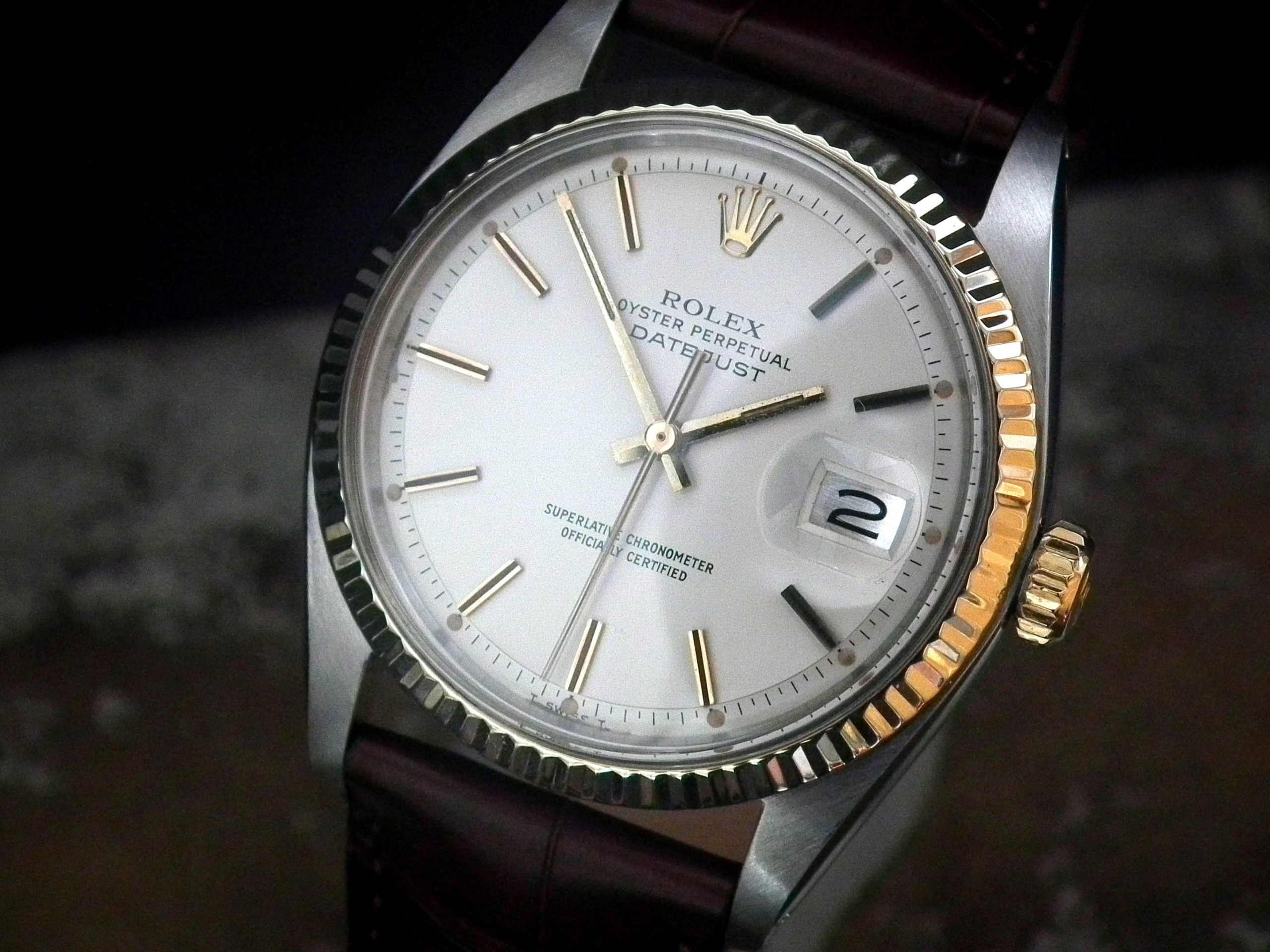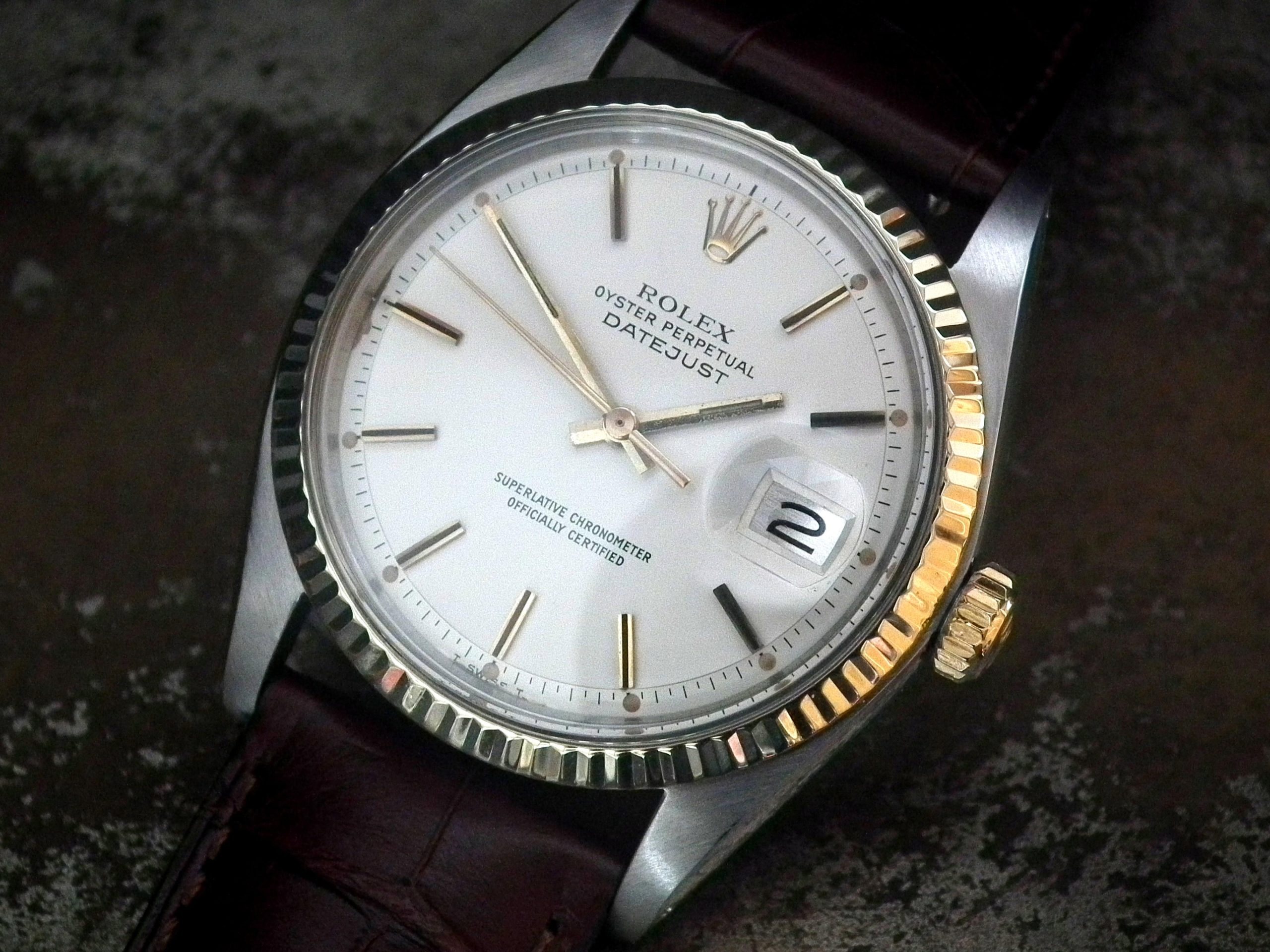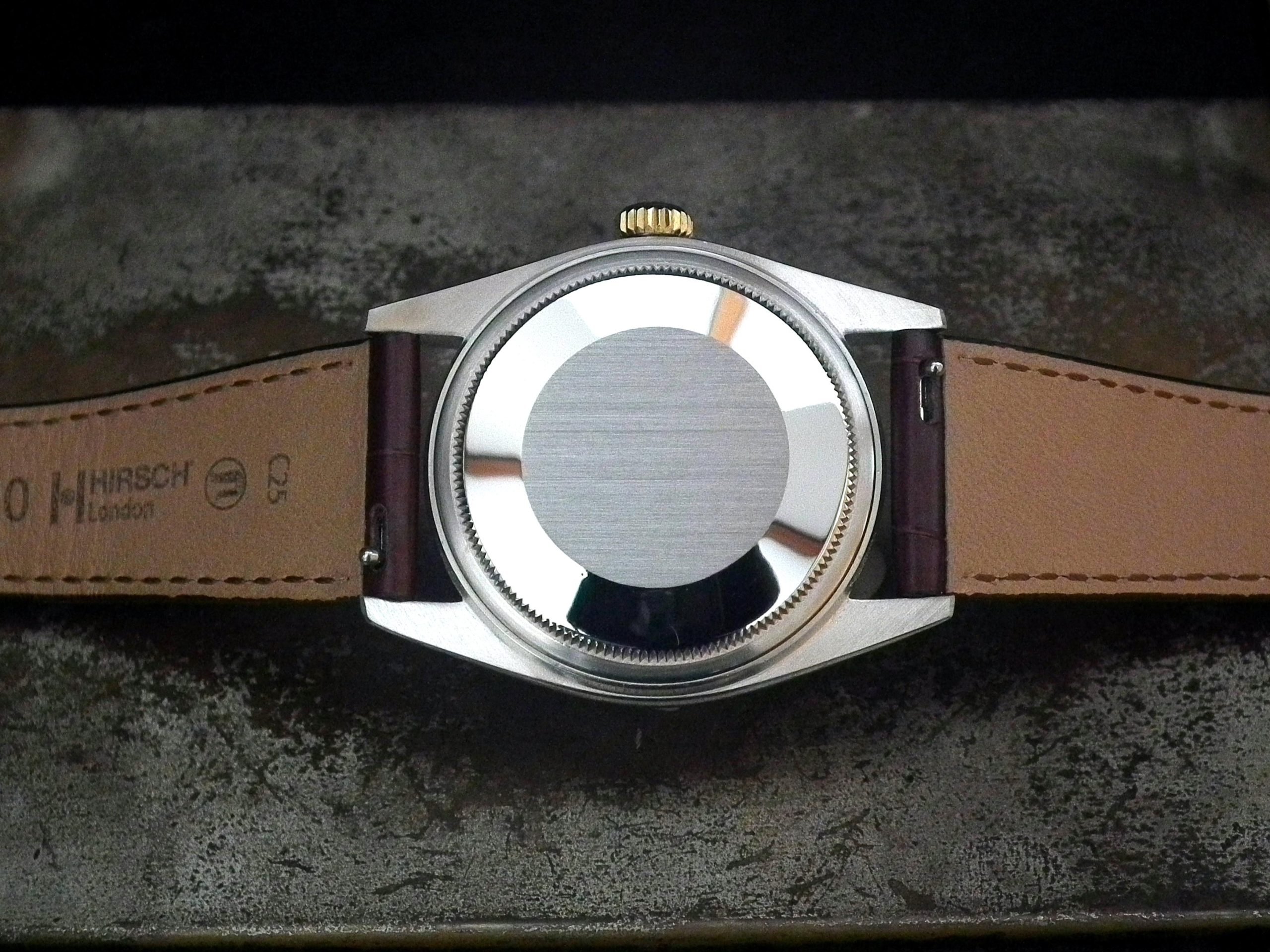 This is a beautiful example of the iconic Rolex Datejust from 1978. The steel and solid gold (fluted bezel) case is in near faultless condition with only the most minor signs of wear. The original Rolex signed slightly off-white dial is again in excellent condition. The very high grade chronometer standard Rolex signed automatic movement is again in excellent condition and has just been fully serviced by our professional watchmaker. The watch sits on a new, super high quality, dark brown Hirsch ‘London’ alligator strap with a gold plated Hirsch buckle.