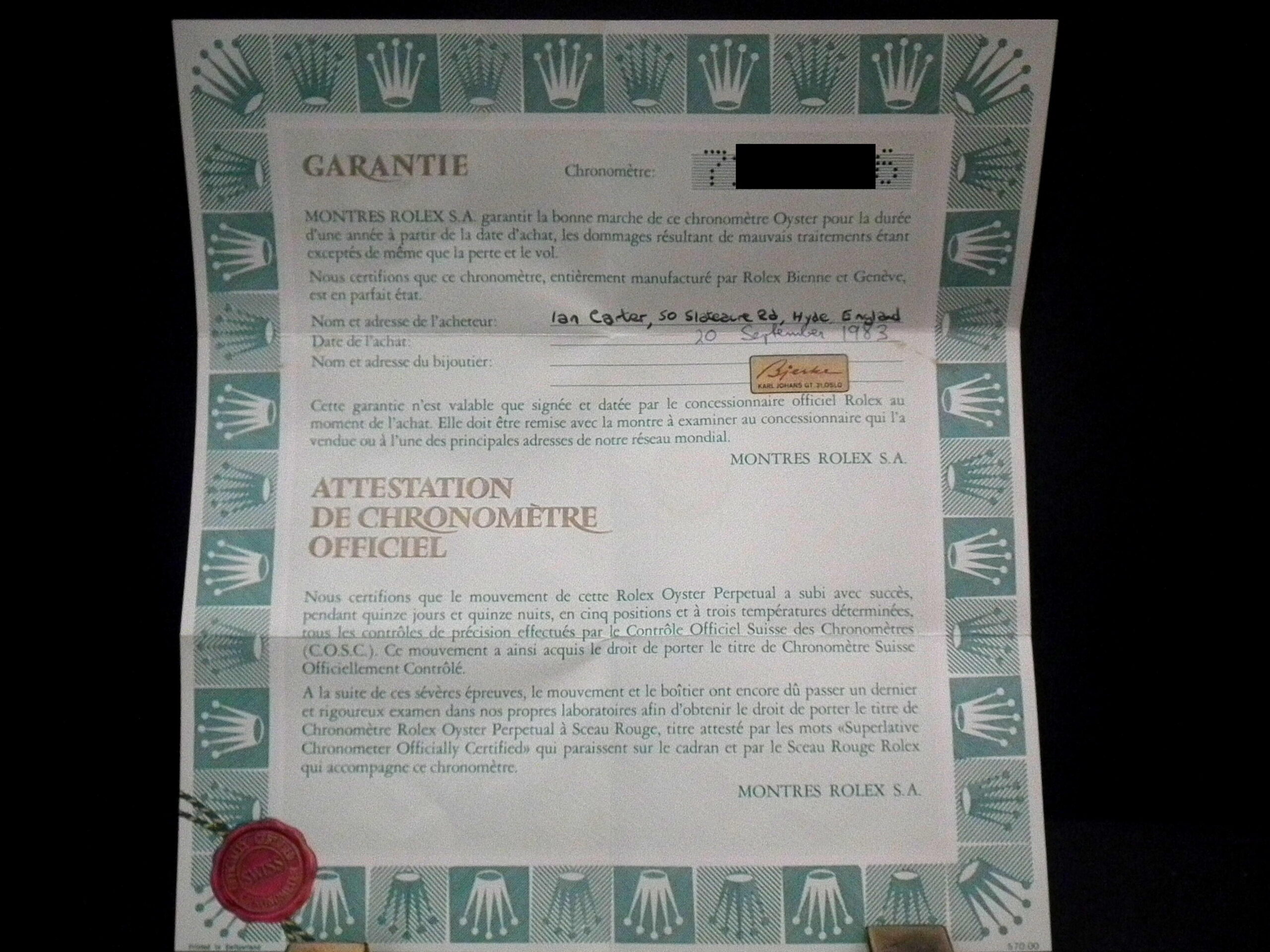 - What we believe is the original purchase receipt (matching name on the Rolex punched papers).