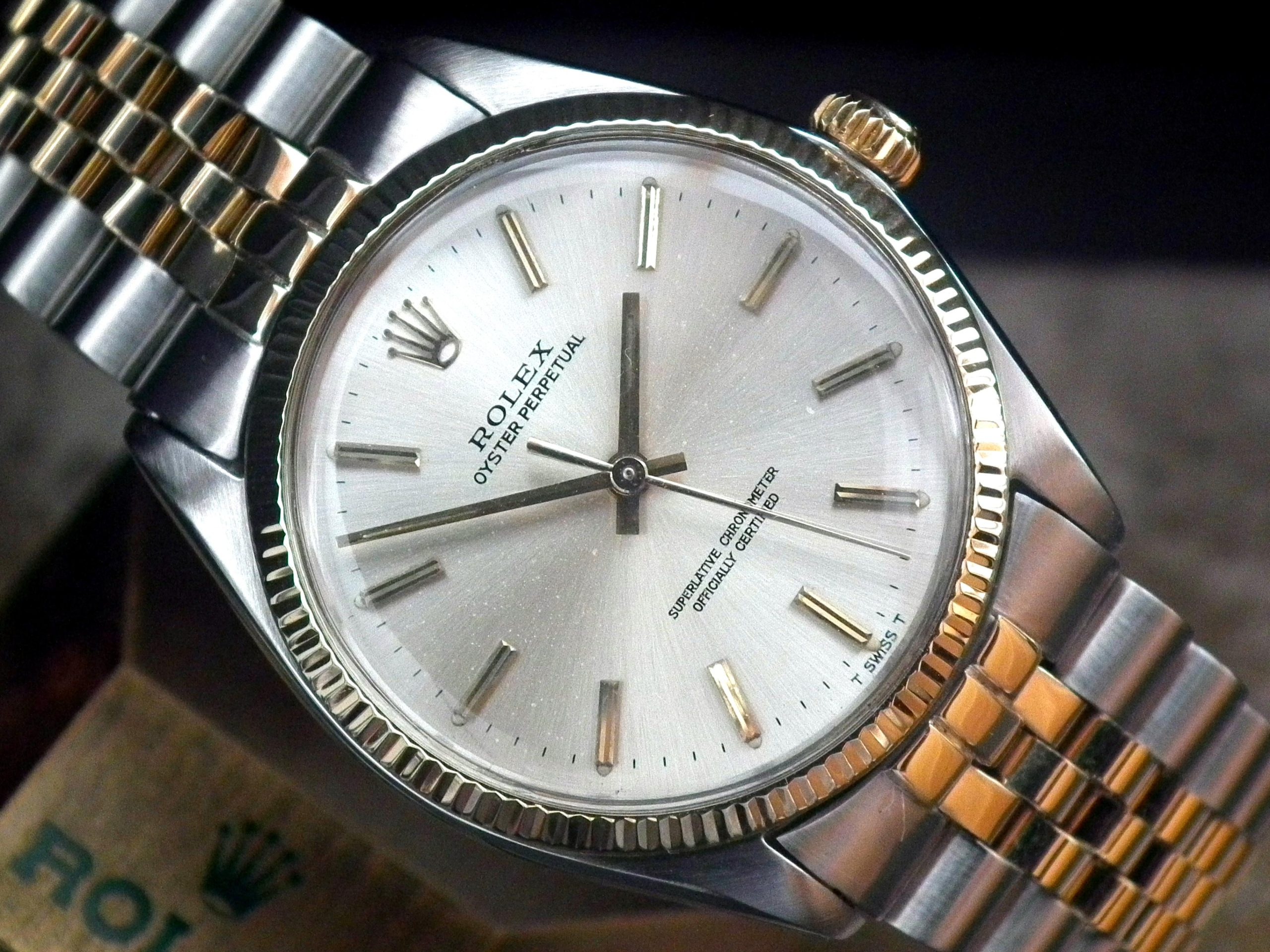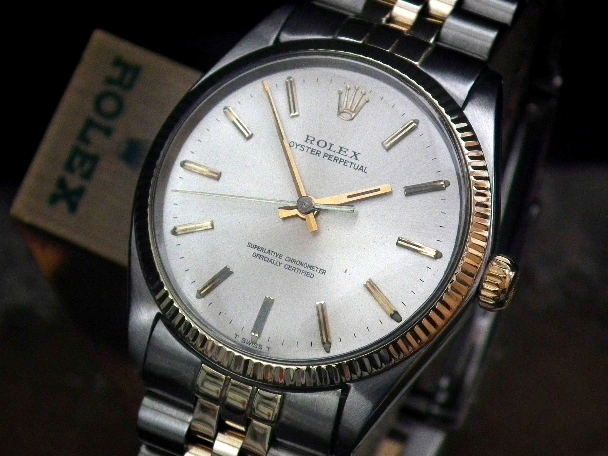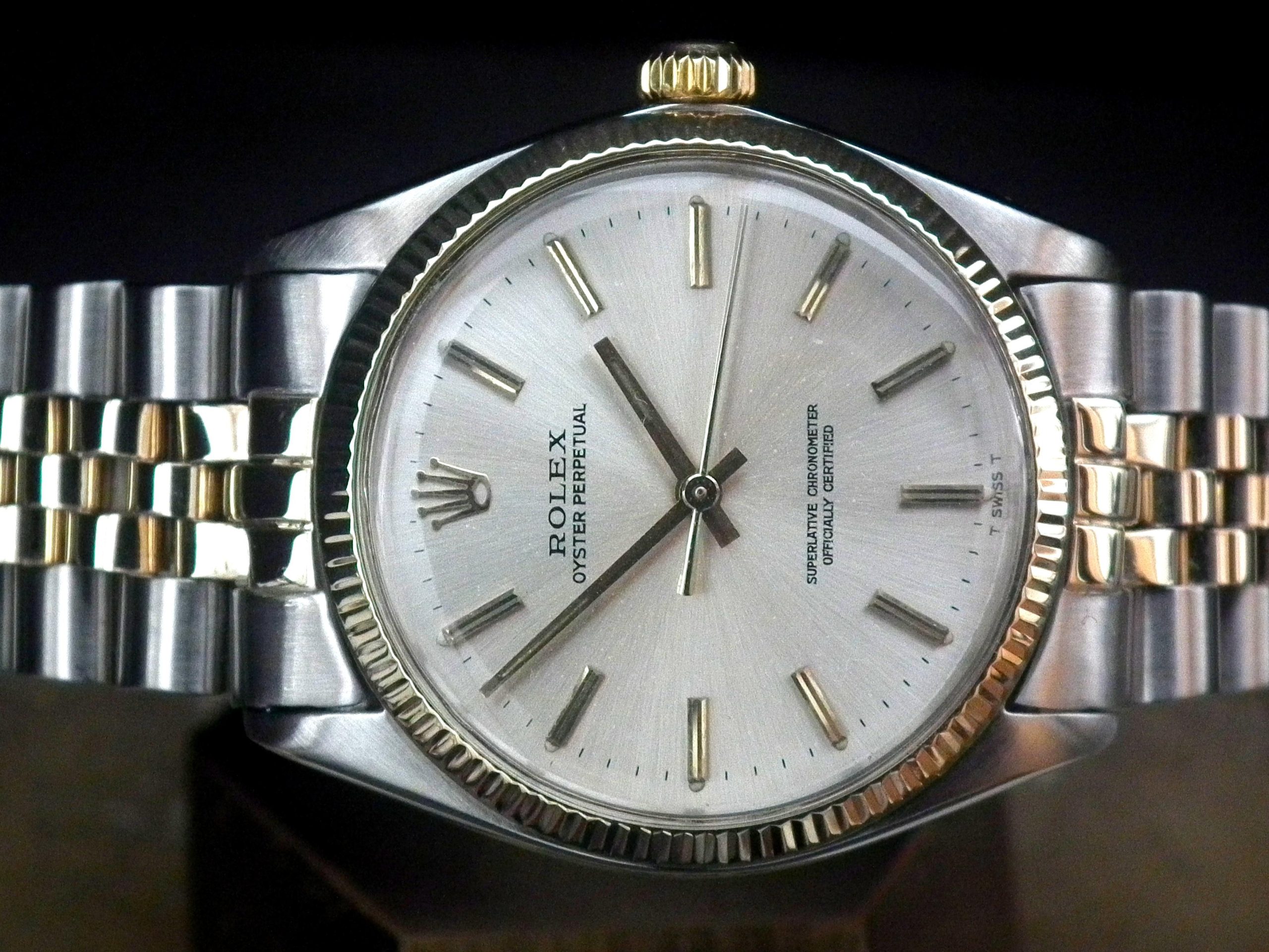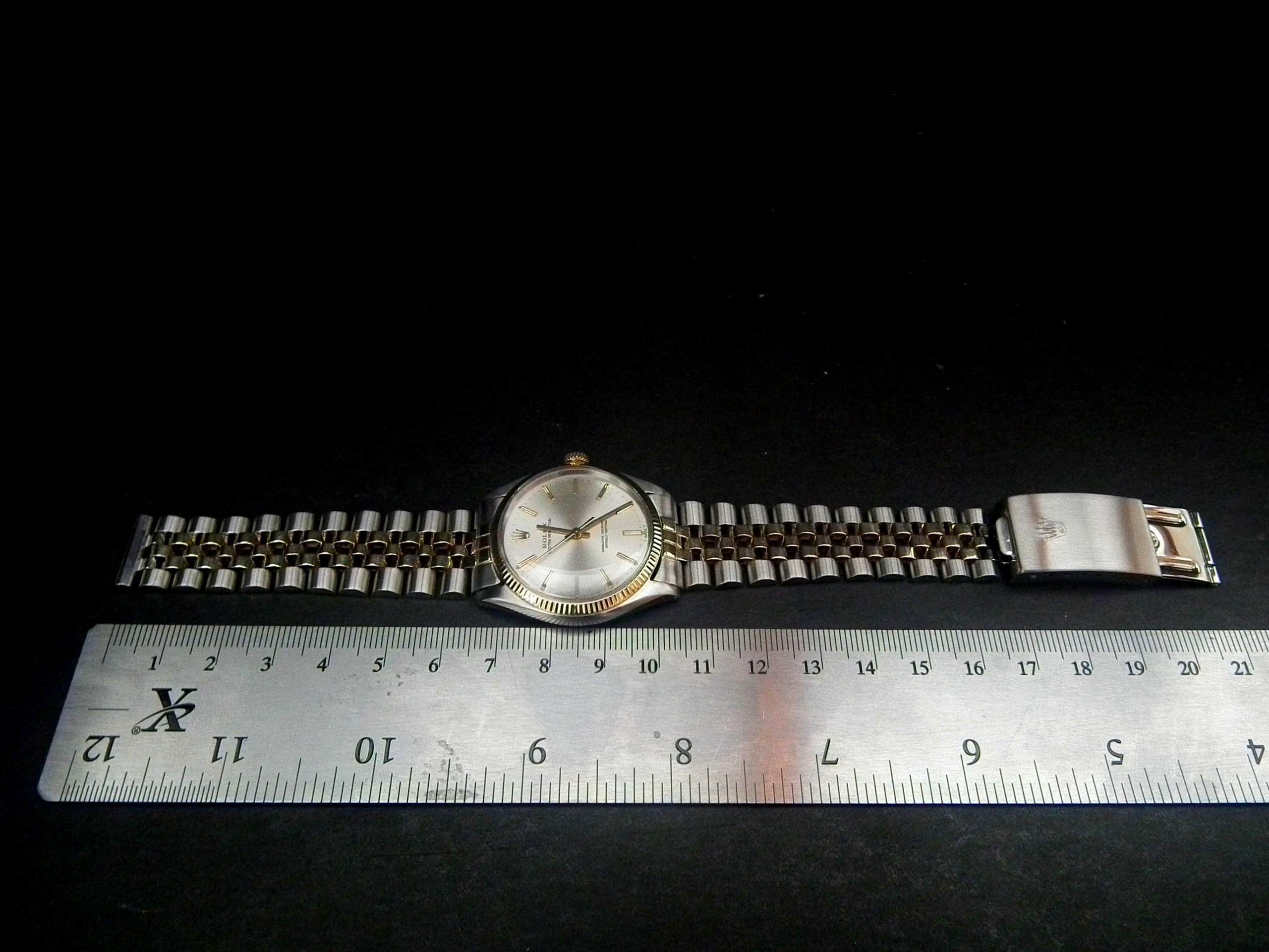 This is an extremely rare steel and solid gold Rolex Oyster Perpetual (34mm case) with a slightly later (1976) genuine steel and solid gold Rolex Jubilee bracelet (I’ve only seen 3 of these – it’s in excellent aesthetic condition but does have a lot of stretch/sag but would still sell for around £900 as a stand alone item). We will include a new 19mm Hirsch crocodile skin strap. The steel and solid gold (yellow and fluted bezel) case is in excellent condition. The original steel pearlescent Rolex signed dial is untouched and whilst has a few signs of age these are difficult to see with the naked eye. The very high grade Rolex signed chronometer standard automatic movement is again in excellent condition and has just been fully serviced by our professional watchmaker.