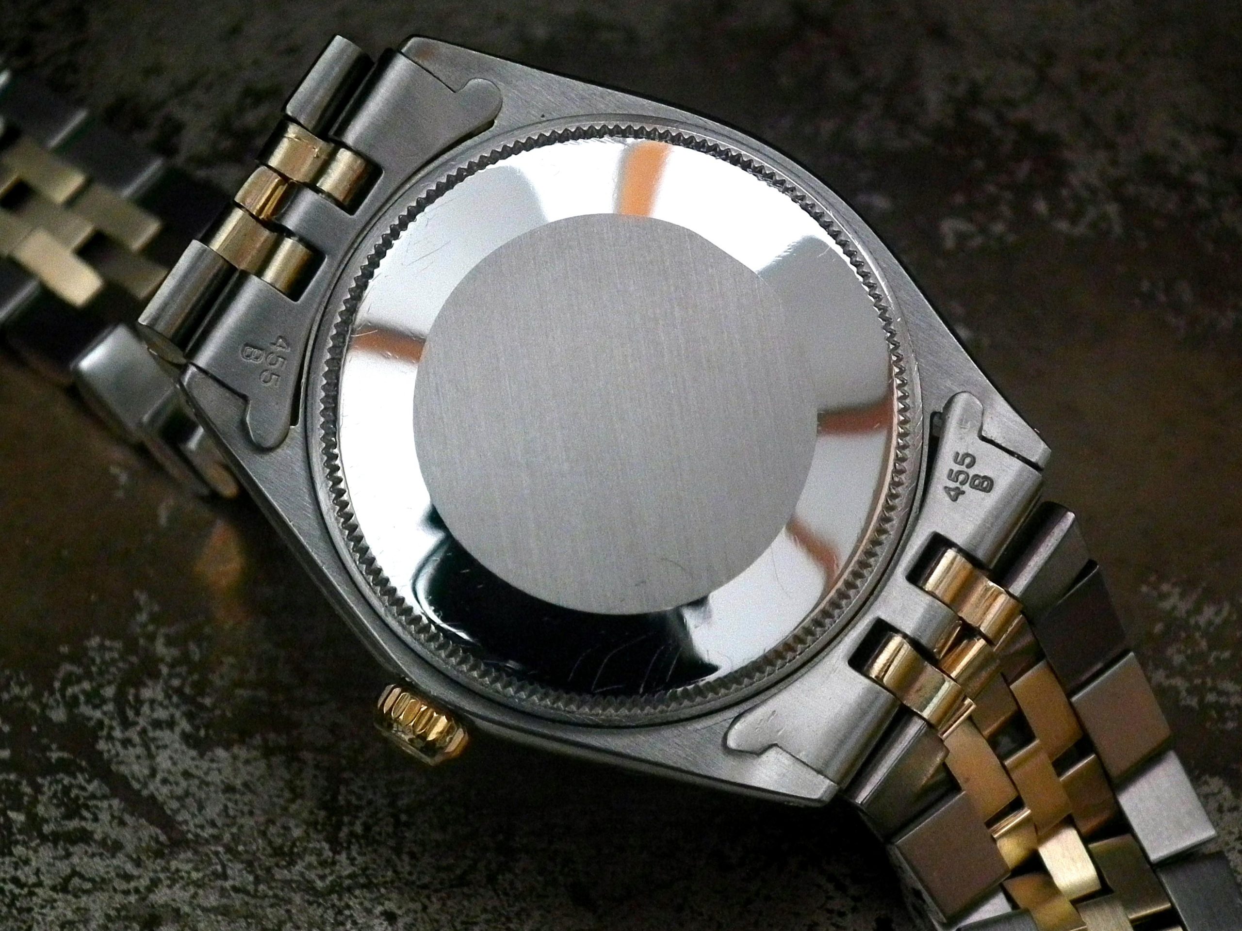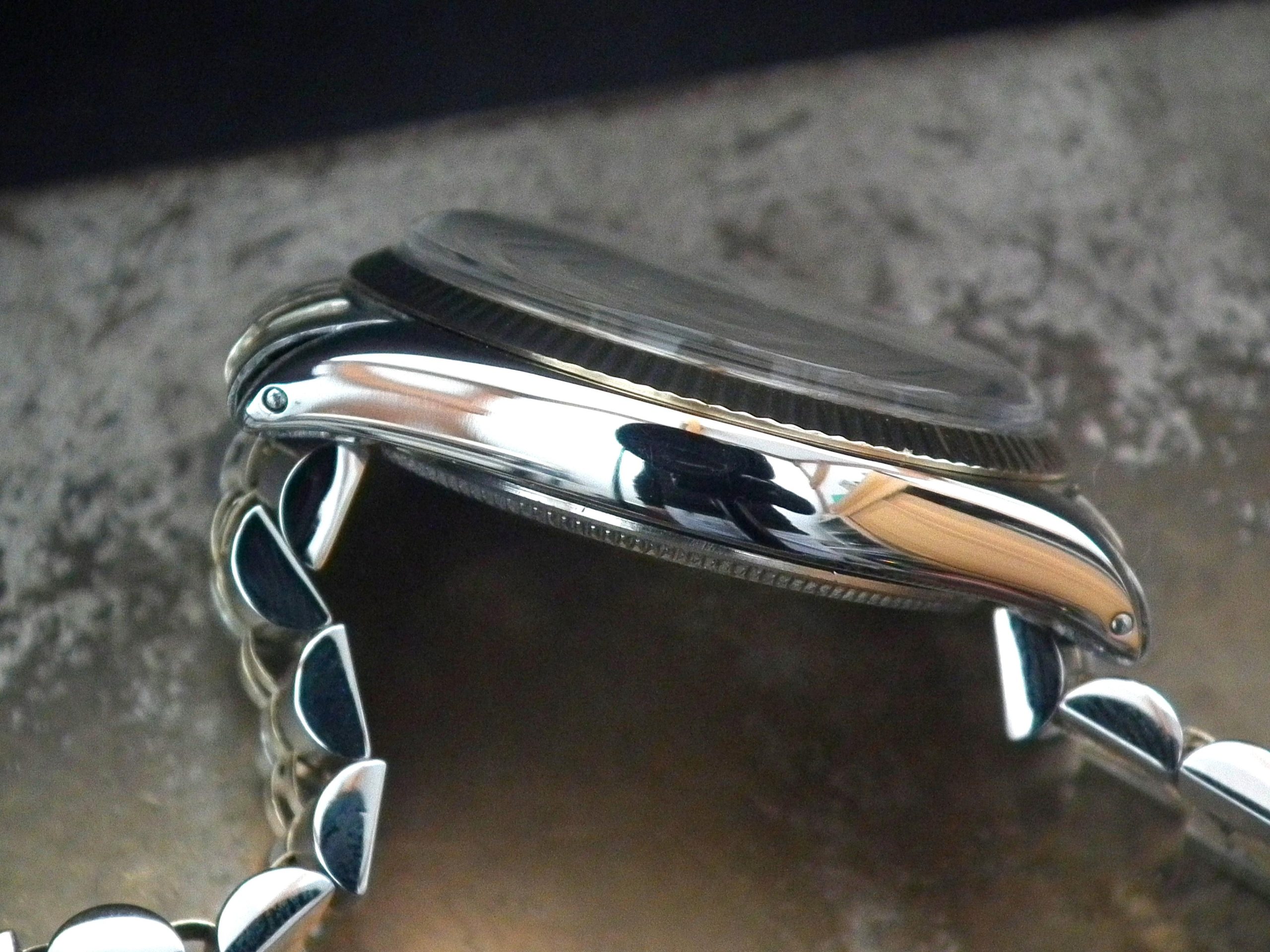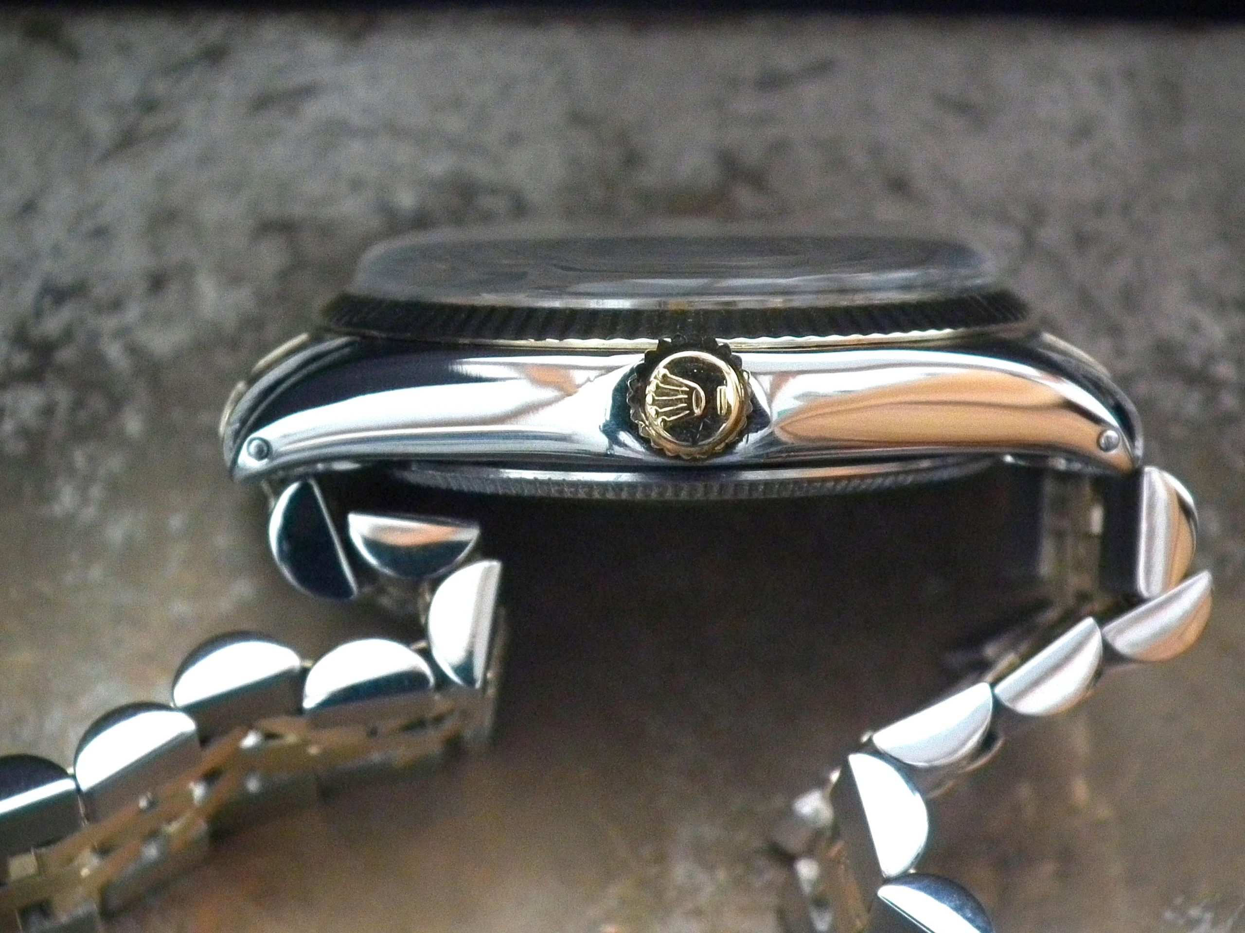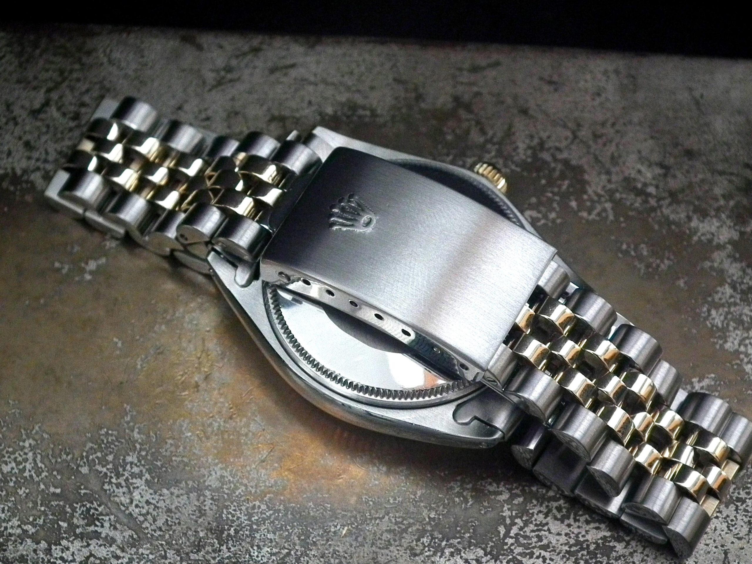 This is an extremely rare steel and solid gold Rolex Oyster Perpetual (34mm case) with a slightly later (1976) genuine steel and solid gold Rolex Jubilee bracelet (I’ve only seen 3 of these – it’s in excellent aesthetic condition but does have a lot of stretch/sag but would still sell for around £900 as a stand alone item). We will include a new 19mm Hirsch crocodile skin strap. The steel and solid gold (yellow and fluted bezel) case is in excellent condition. The original steel pearlescent Rolex signed dial is untouched and whilst has a few signs of age these are difficult to see with the naked eye. The very high grade Rolex signed chronometer standard automatic movement is again in excellent condition and has just been fully serviced by our professional watchmaker.