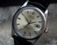 This is an outstandingly original example of the iconic Rolex Oyster Datejust from 1963. The solid steel case is in excellent condition with only the most minor signs of wear. The original and untouched Rolex signed steel/champagne dial has aged and does have some minor patina but looks fabulous (happy to send a wrist shot/video). The original dagger hands and blued steel second hand create a stunning vintage look. The chronometer standard Rolex signed automatic movement is again in very good condition and has just been serviced by our professional watchmaker. The watch sits on a new, super high quality black Hirsch ‘London’ alligator strap with steel Hirsch buckle.