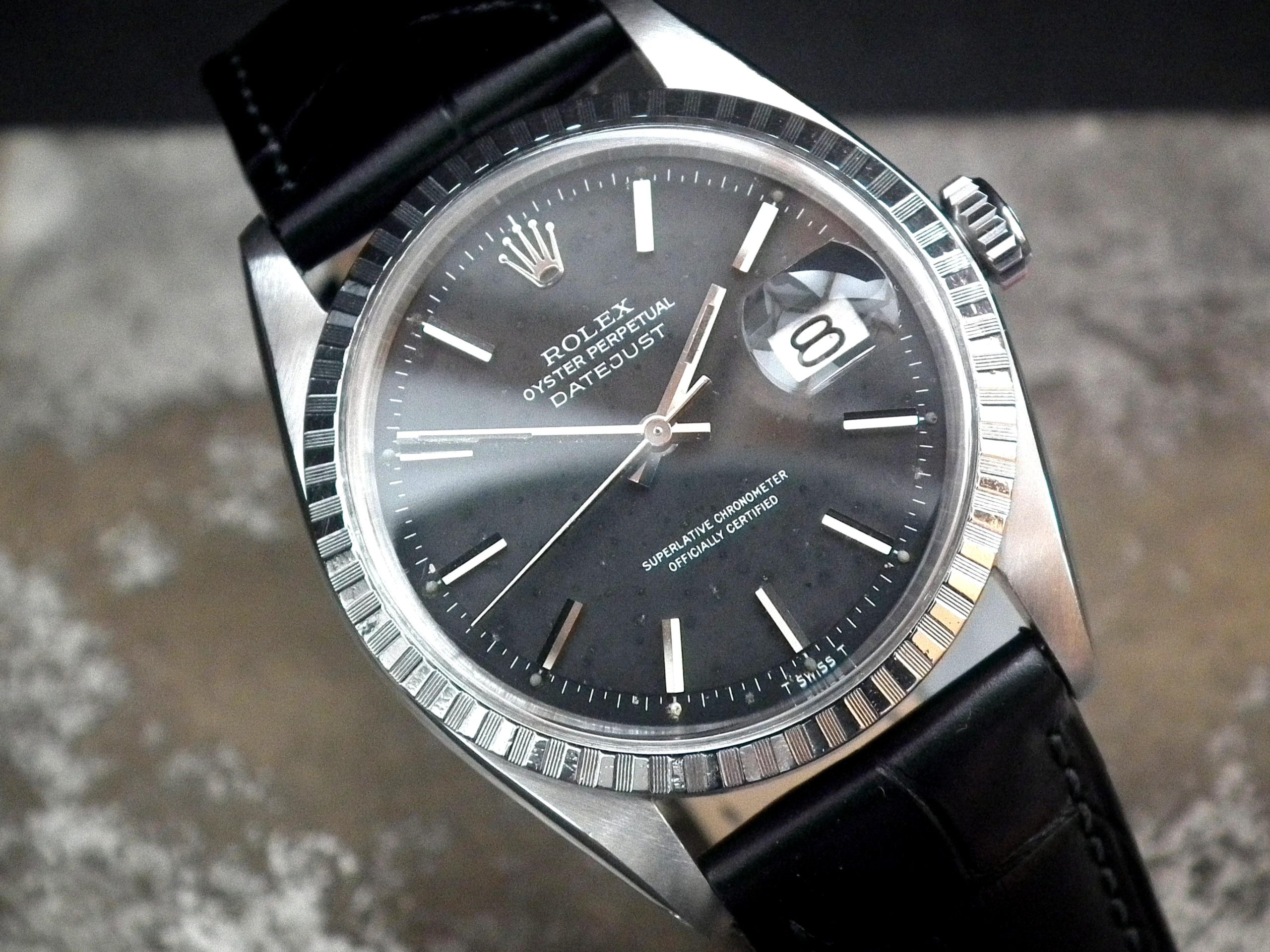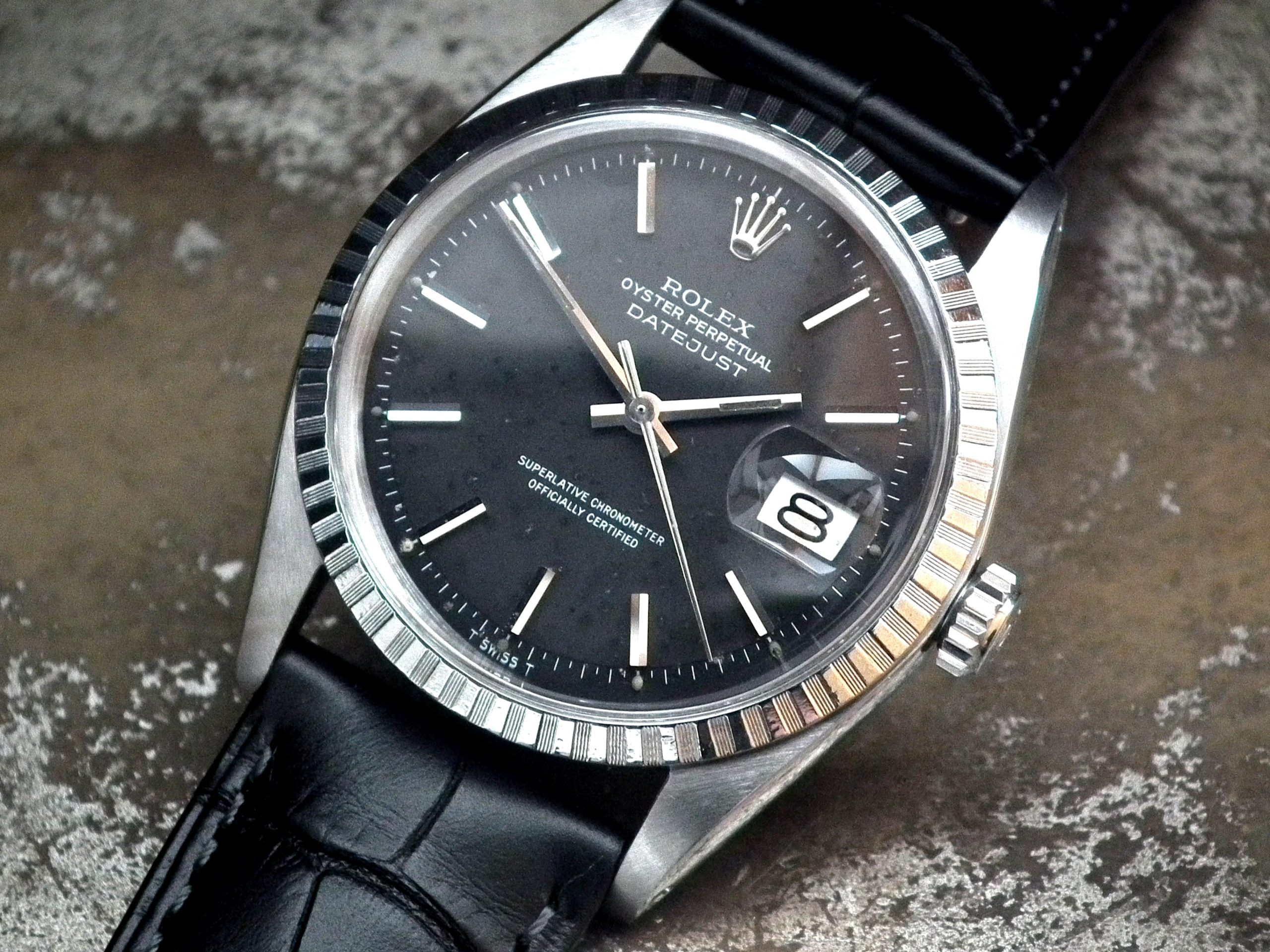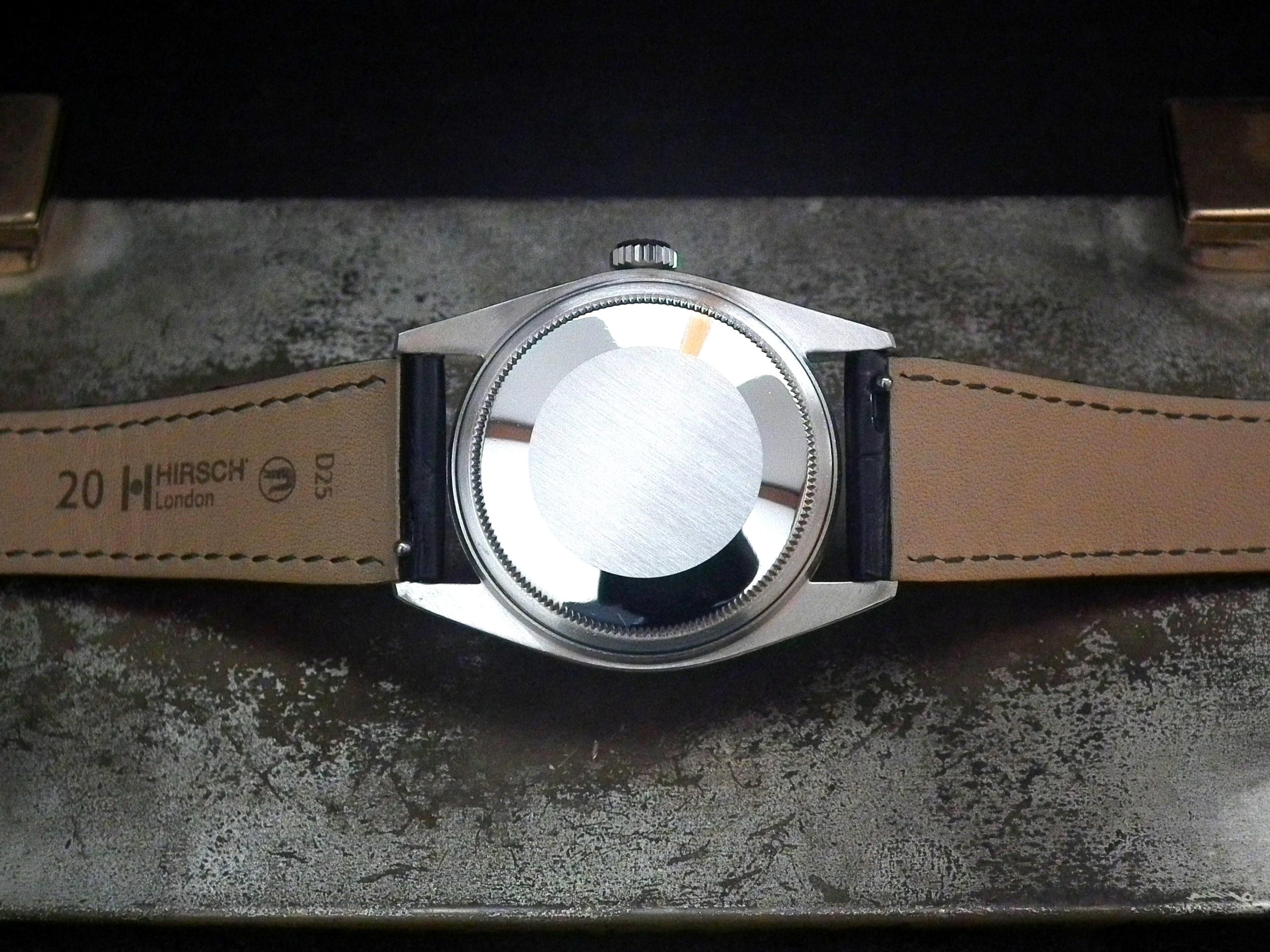 This is a beautiful example of the iconic Rolex Datejust from 1975 – very rarely it has a matte black dial (these were special order and are few and far between). The solid steel case is in near faultless condition with only the most minor signs of wear. The original black matte dial is in very good condition but does have signs of wear – these are hard to see with the naked eye. The super high quality chronometer standard Rolex signed movement is in excellent condition and has just been fully serviced by our professional watchmaker. The watch sits on a new, super high quality, black Hirsch ‘London’ alligator strap with a steel Hirsch buckle.