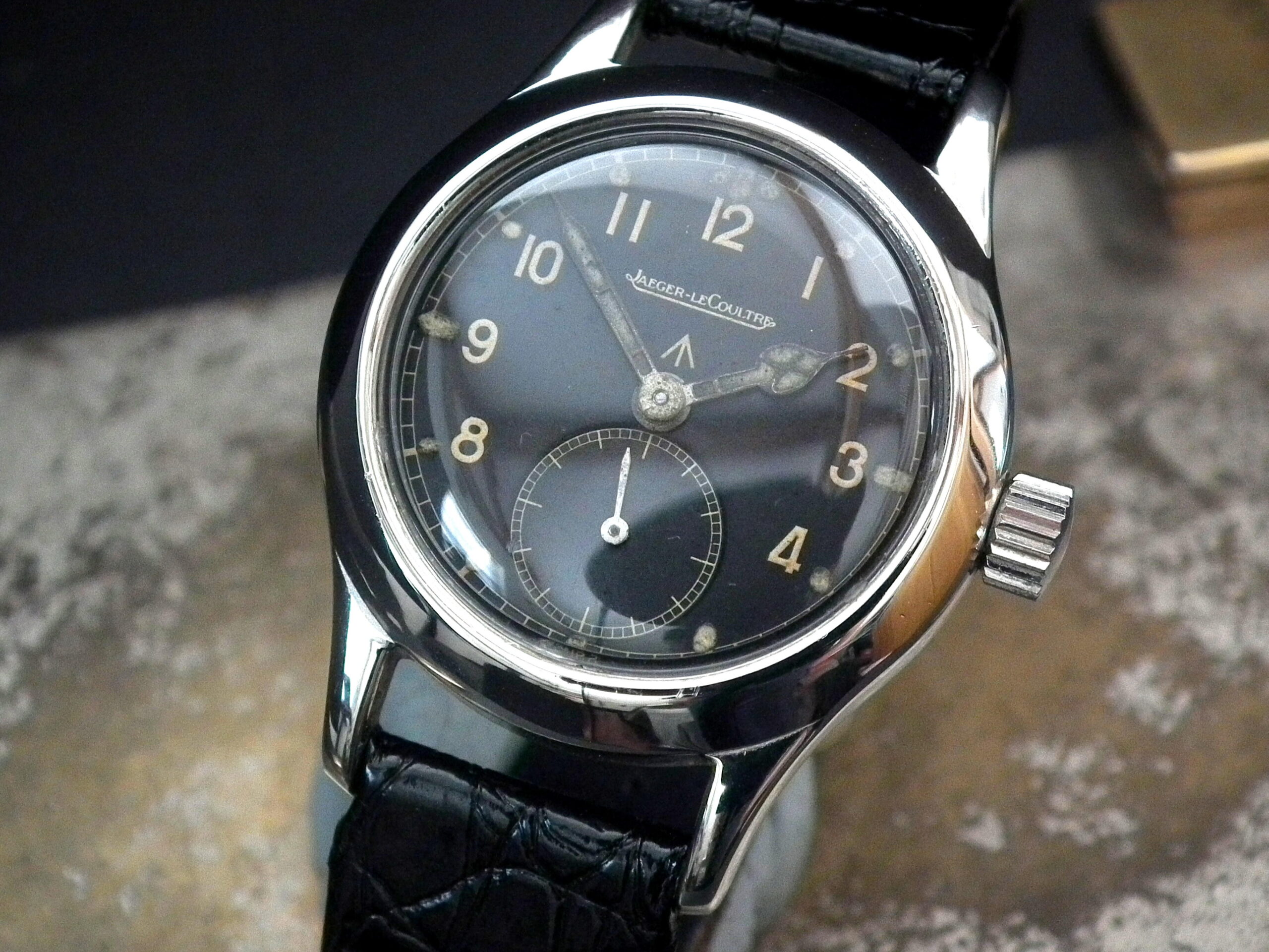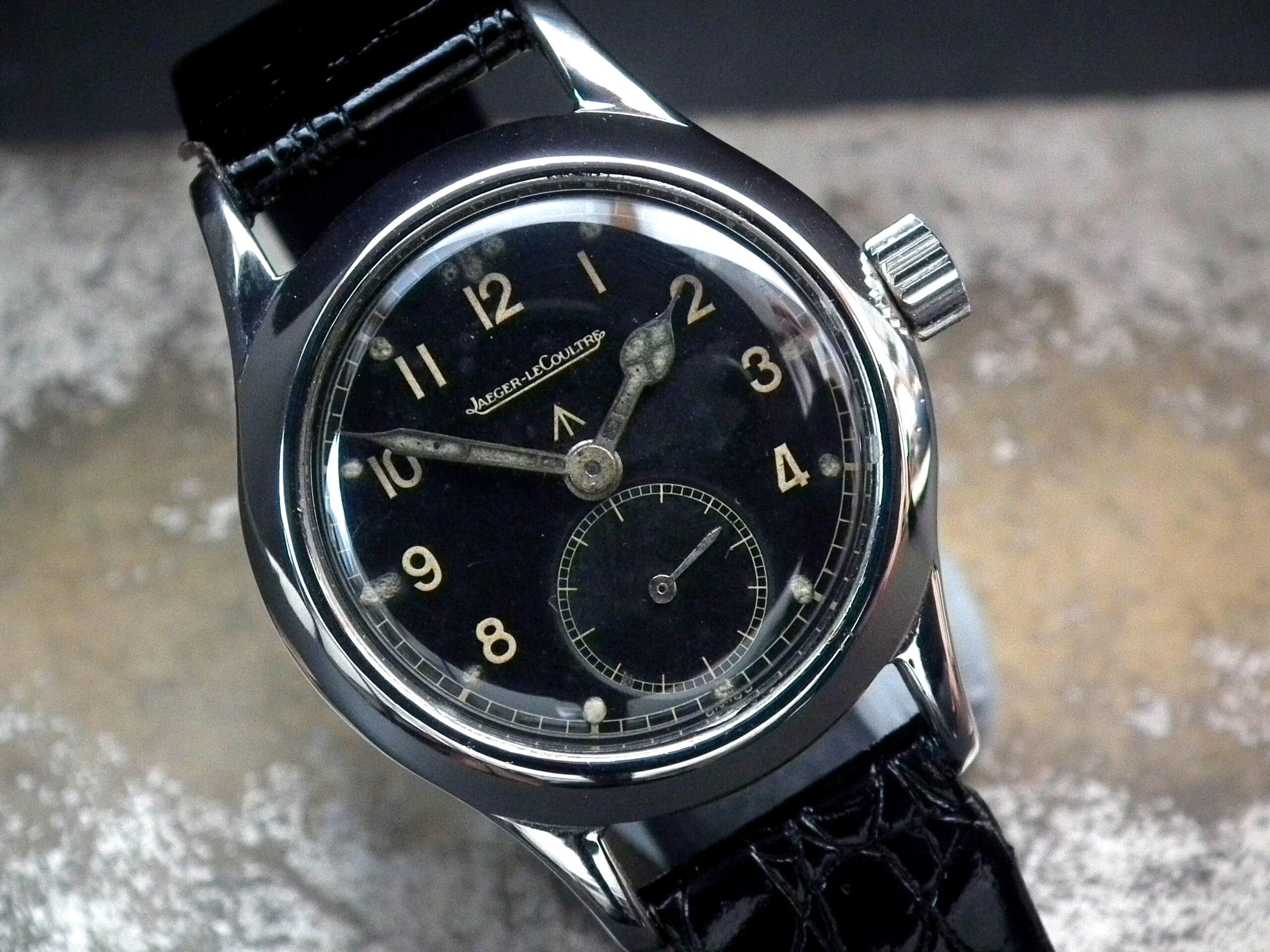This particular example is one of the most desirable of the group, the Jaeger le Coultre. The stainless steel case is in excellent condition with the writing on the outside caseback being extremely well defined. The original and untouched Jaeger signed dial is again in excellent original condition – even the remnants of the lume plots are visible. The original Jaeger signed manual wind movement is again in excellent condition and has just been serviced by our professional watchmaker. The watch sits on a black crocodile skin strap with non-Jaeger steel buckle.