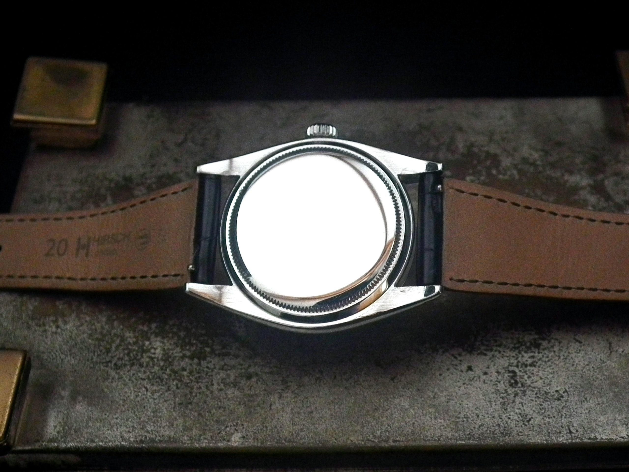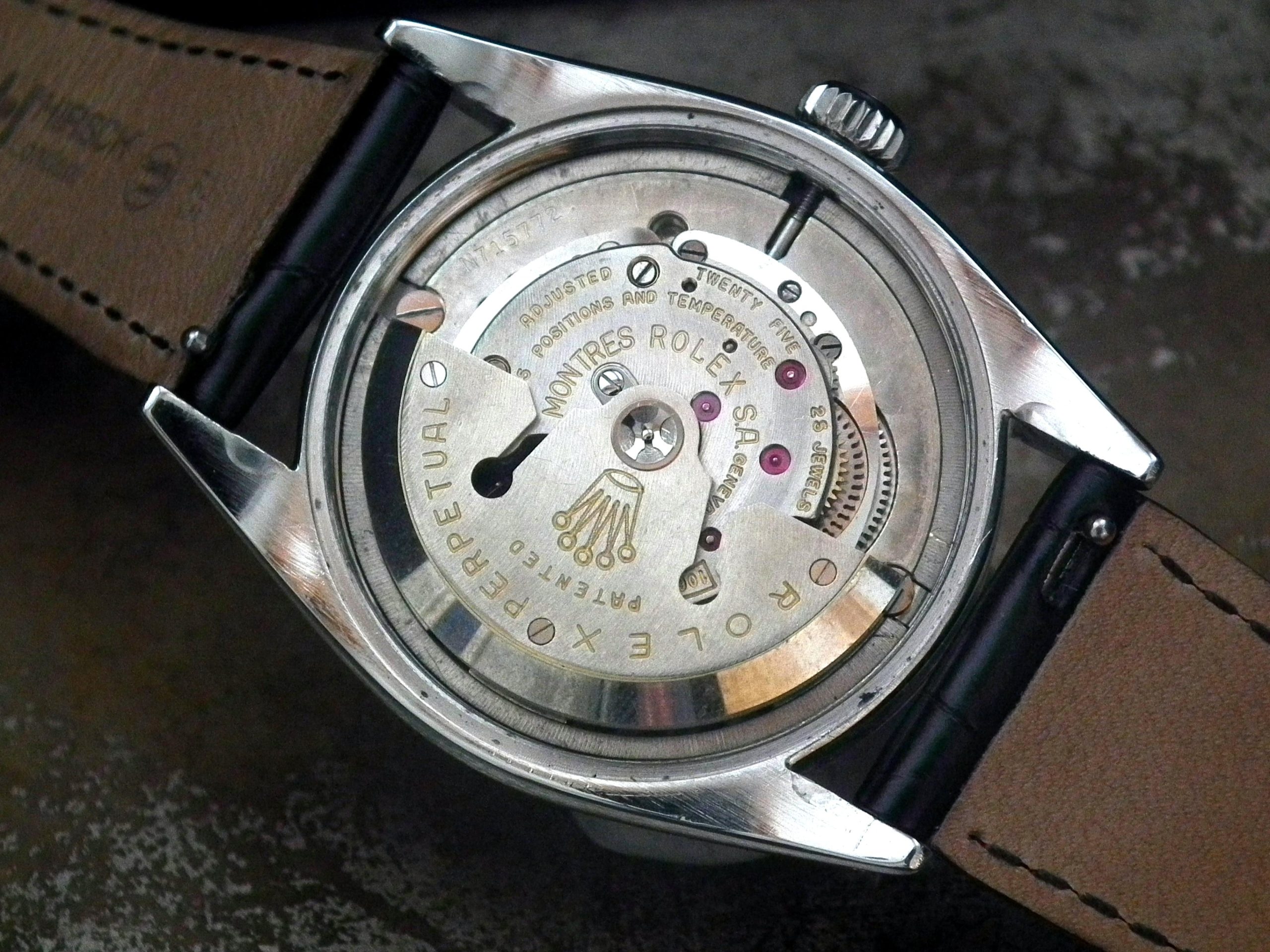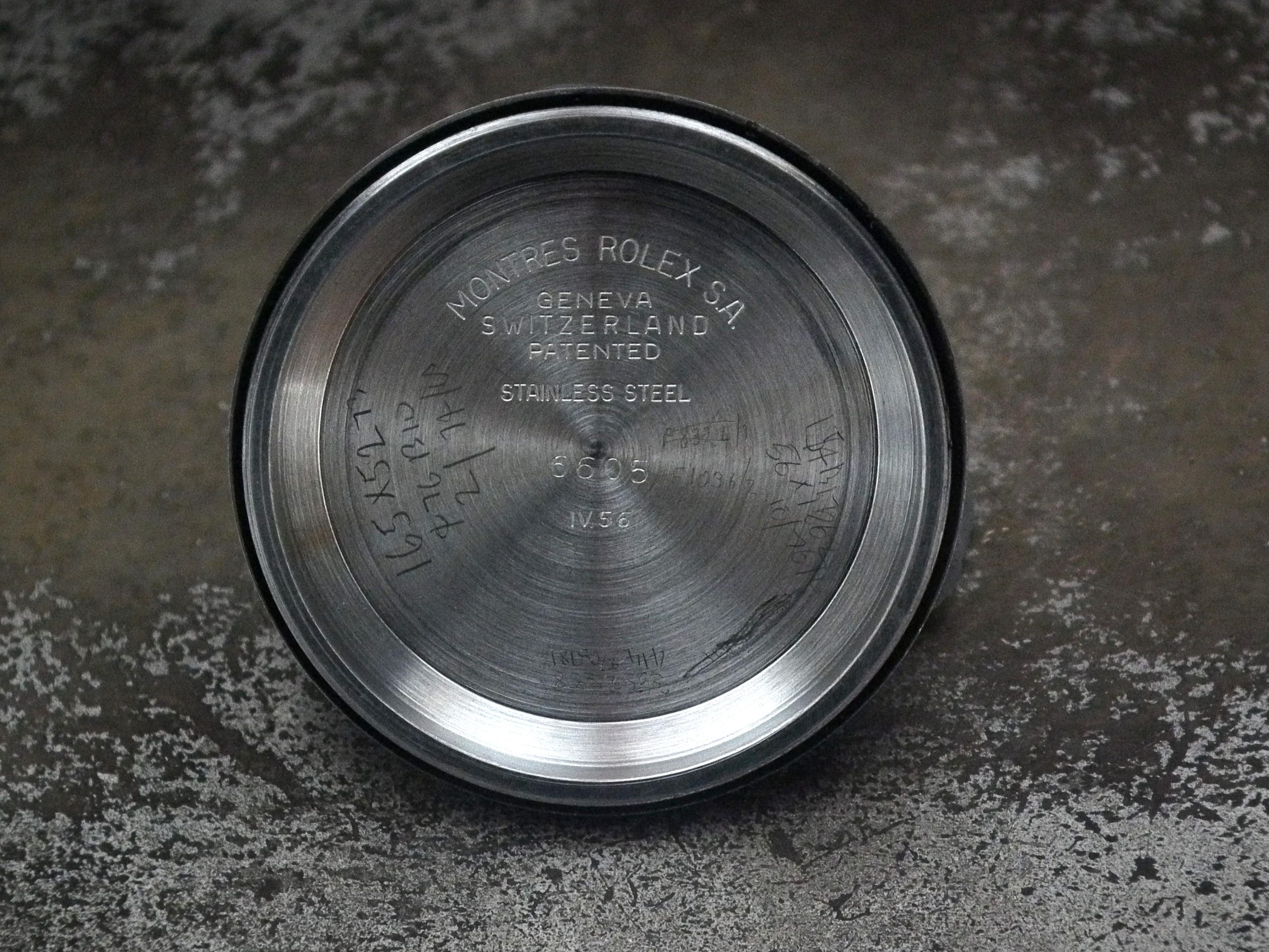 The solid steel case is in excellent condition with only the most minor signs of wear. The case measures 36mm across, excluding the Rolex signed crown and 43mm long including the lugs. The inside case is signed ‘Montres Rolex SA Geneva Switzerland’, ‘Patented Stainless Steel’ and ‘6605’. The age reference is ‘IV.56’ dating it to 1956.
